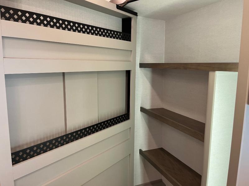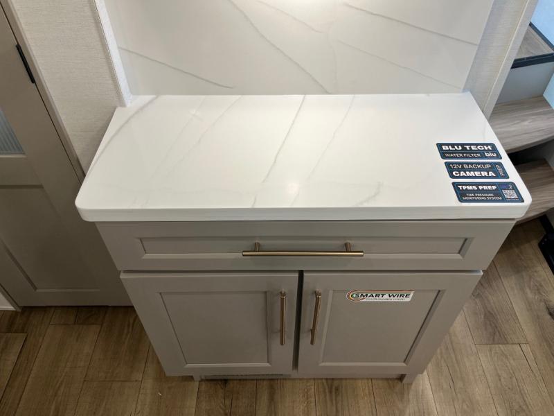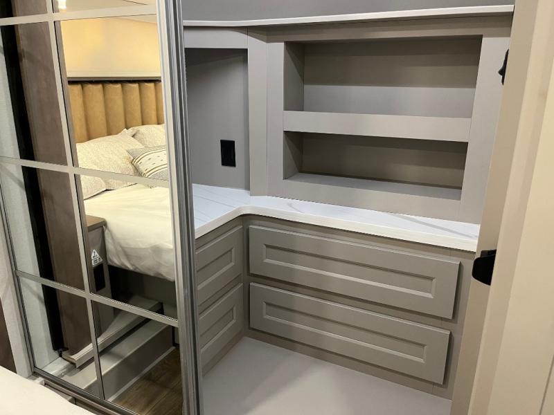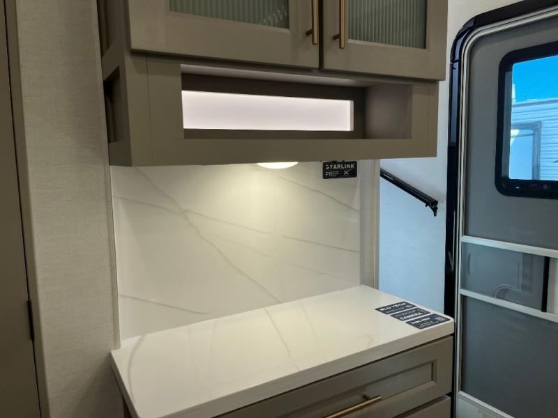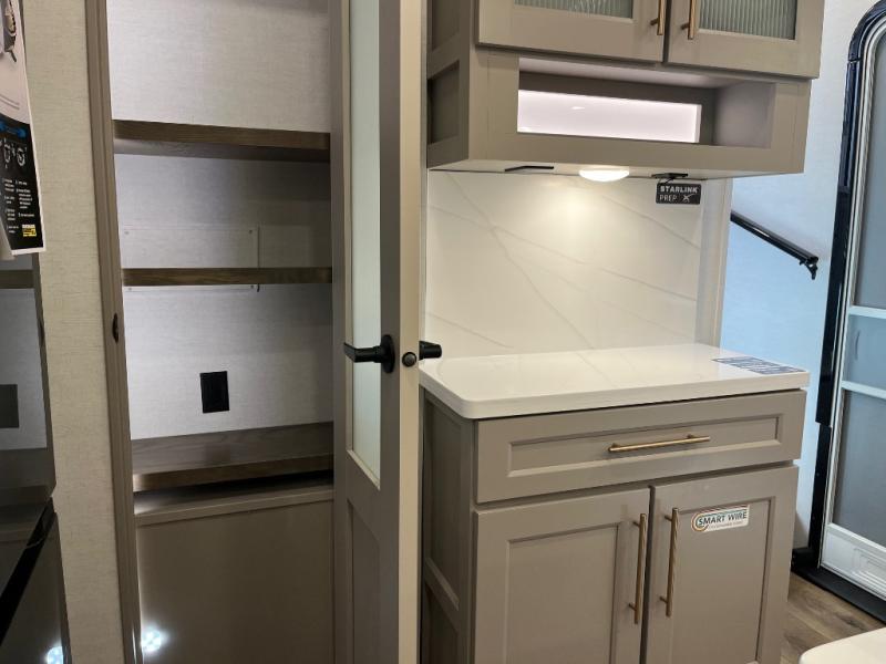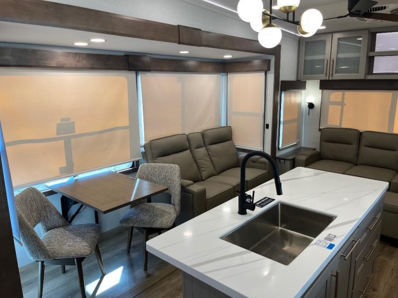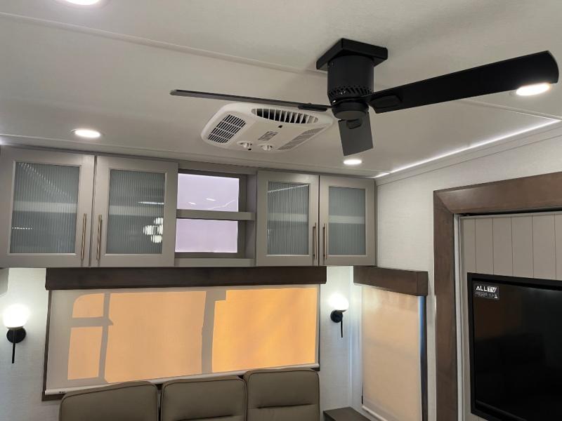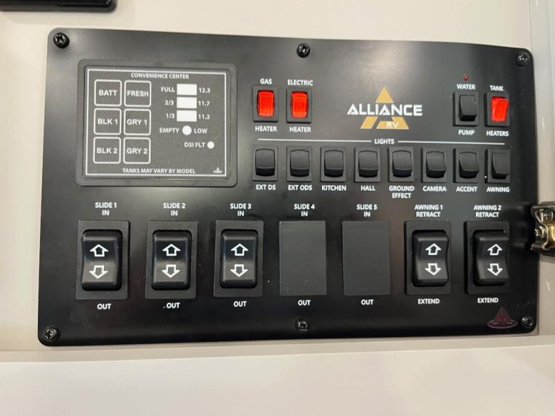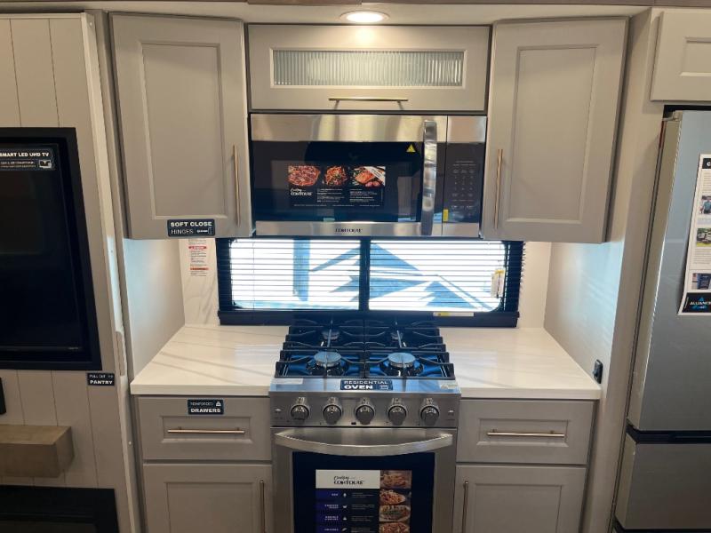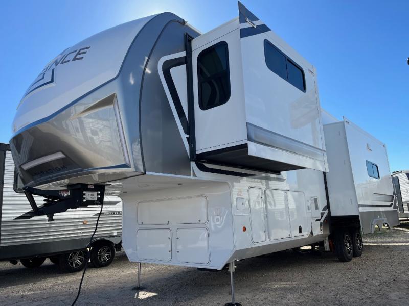 The Paradigm fifth wheels by Alliance RV are functional, high-quality, and luxurious for an unforgettable camping experience. There are three A/C units and a 40K BTU furnace to keep you comfortable year around, and you'll appreciate additional convenient amenities, like the all-in-one enclosed/heated utility center and the color coded and numbered wiring. A Helux Series coil spring pin box comes standard for hassle-free towing, along with Curt 8,000 lb. axles. You'll love the kitchen with its LG solid surface countertops and Lusso range, plus there is LED motion lighting in the pantry and a Maxx fan with a rain sensor to keep everything fresh when making dinner. Each model also includes an HD Smart TV in the living room and bedroom. And of course there are a variety of options you can choose from to further customize your fifth wheel; dual pane windows, Super Solar Plus, slide out awning toppers, and generator prep or a generator to name a few!