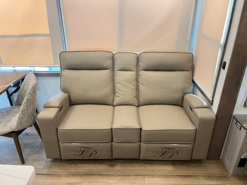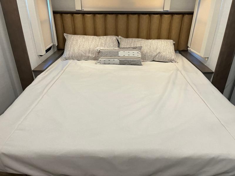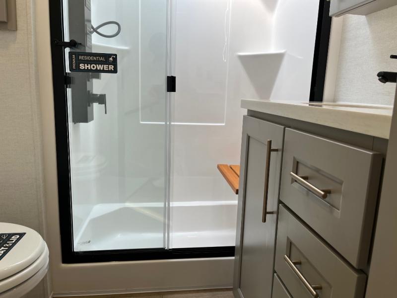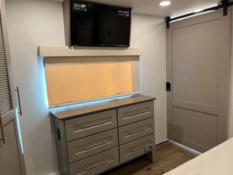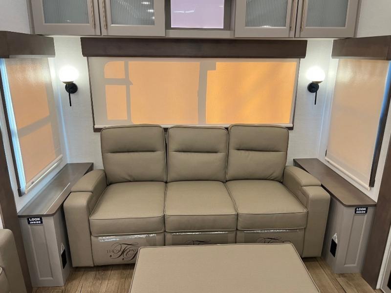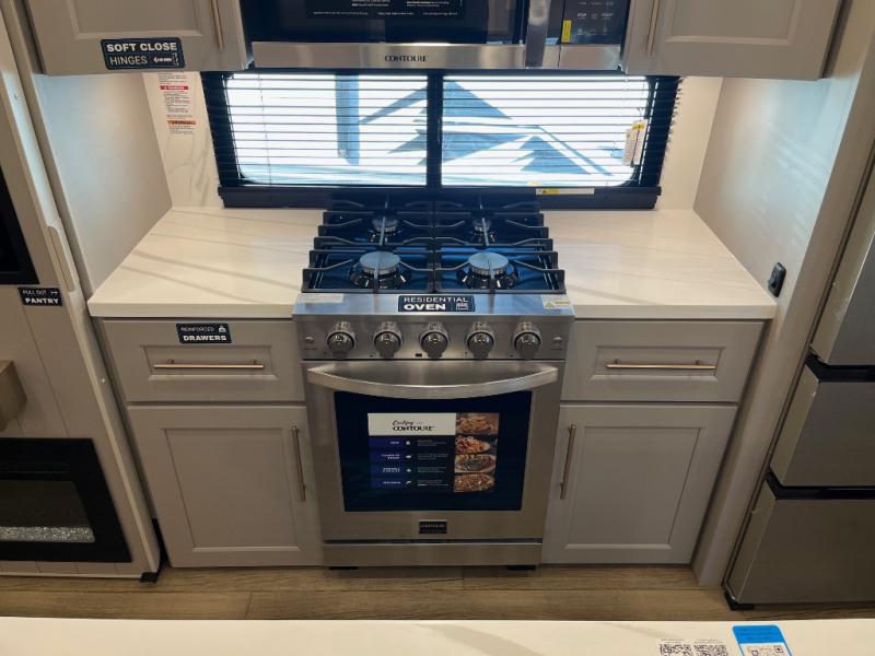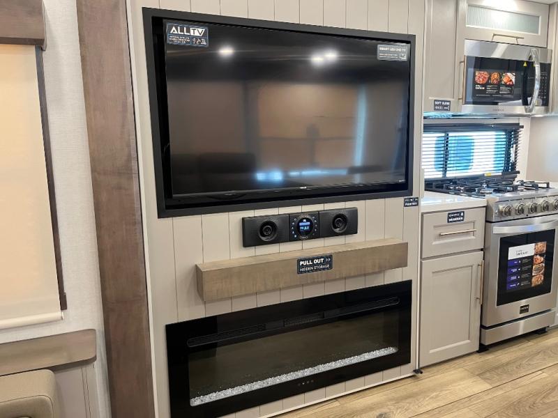 Search for the best views, the nicest RV park, or a place you haven't seen for years with this Paradigm in tow! There is a king bed slide in the master bedroom, a Smart TV, and a dresser with flip-up hidden storage for your belongings. The full bathroom offers a large residential shower, a porcelain toilet with a soft close seat, and storage for your linens, while the kitchen gives you two pantries, an island with a large undermount single basin sink and dishwasher prep if you want the option for easy clean up. You will also have a residential microwave and range, plus a 3.73 cu. ft. oven to make meals. When you're ready to relax for the evening, head to the rear living area to enjoy the dual recliner love seat across from the 50" Smart TV and fireplace!