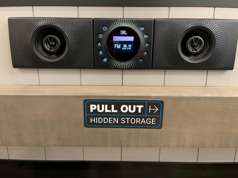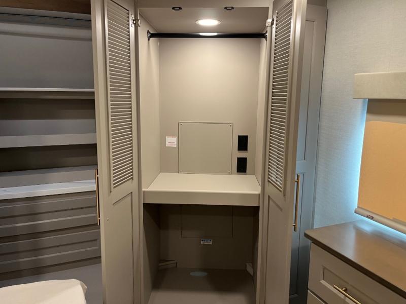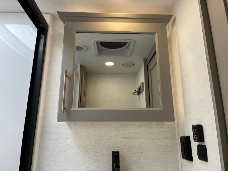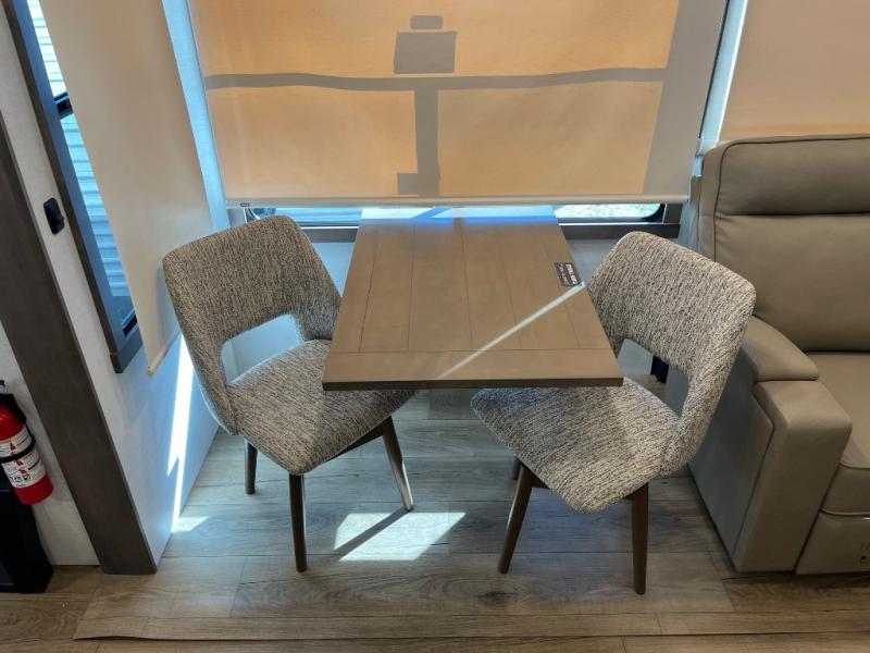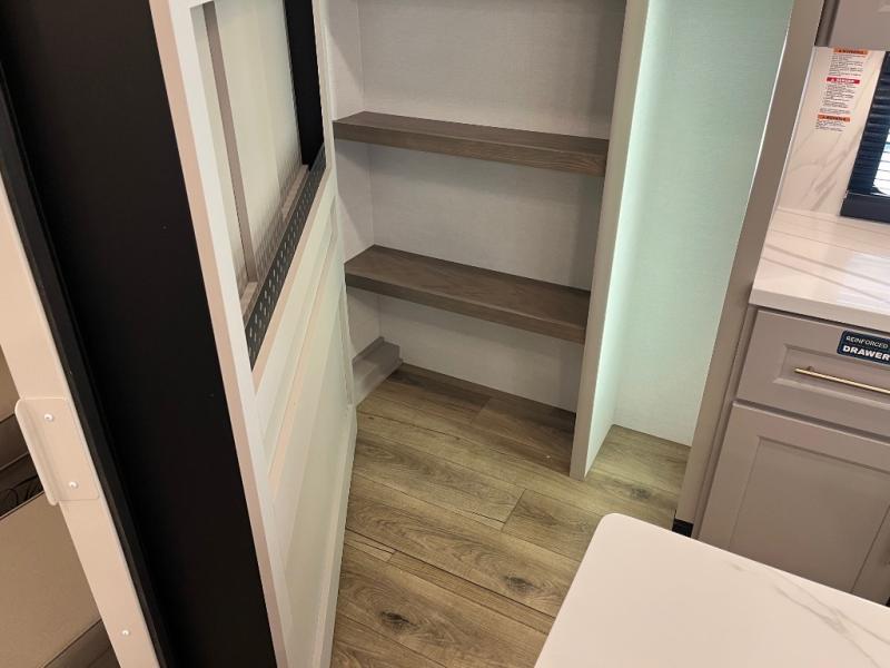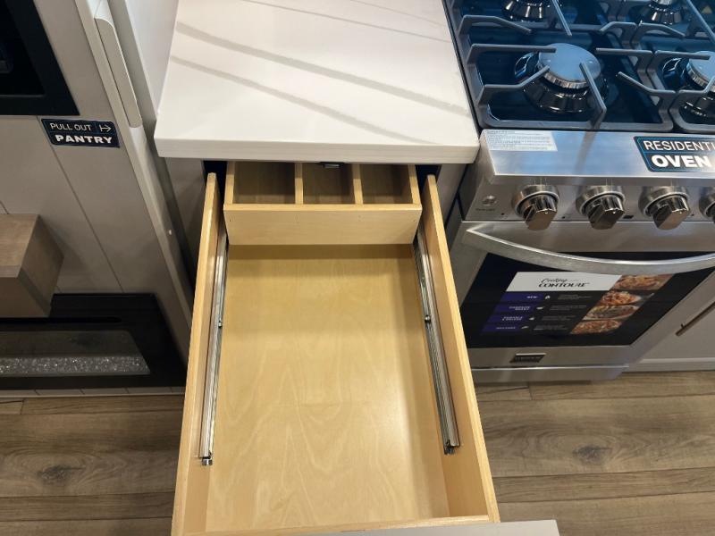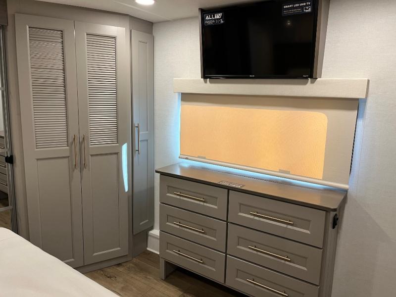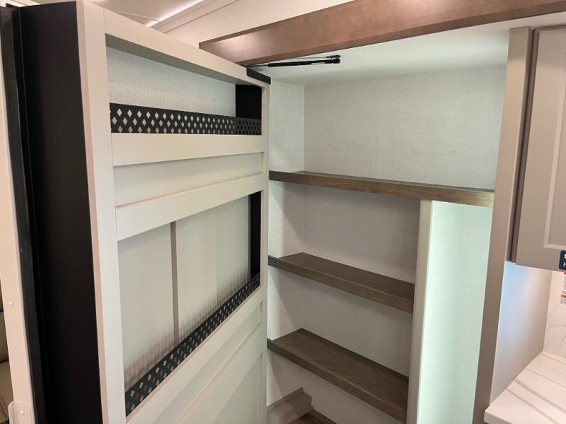 Search for the best views, the nicest RV park, or a place you haven't seen for years with this Paradigm in tow! There is a king bed slide in the master bedroom, a Smart TV, and a dresser with flip-up hidden storage for your belongings. The full bathroom offers a large residential shower, a porcelain toilet with a soft close seat, and storage for your linens, while the kitchen gives you two pantries, an island with a large undermount single basin sink and dishwasher prep if you want the option for easy clean up. You will also have a residential microwave and range, plus a 3.73 cu. ft. oven to make meals. When you're ready to relax for the evening, head to the rear living area to enjoy the dual recliner love seat across from the 50" Smart TV and fireplace!