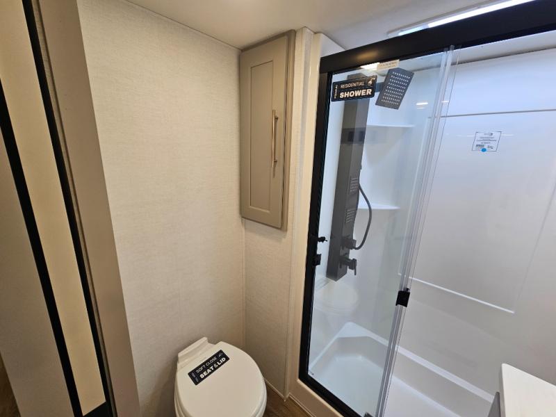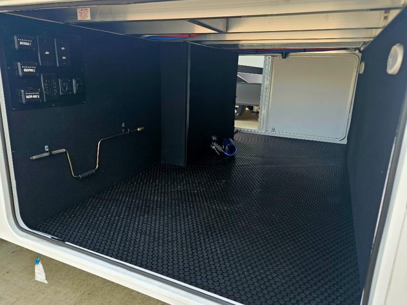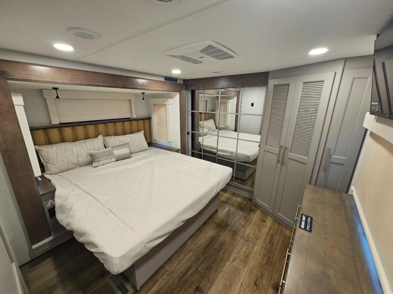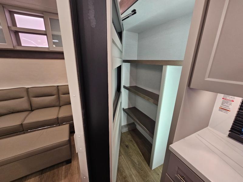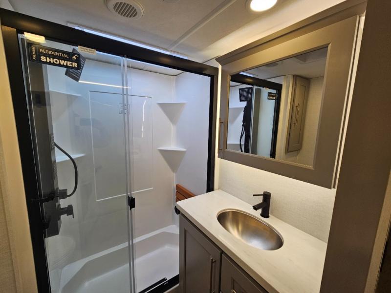 Search for the best views, the nicest RV park, or a place you haven't seen for years with this Paradigm in tow! There is a king bed slide in the master bedroom, a Smart TV, and a dresser with flip-up hidden storage for your belongings. The full bathroom offers a large residential shower, a porcelain toilet with a soft close seat, and storage for your linens, while the kitchen gives you two pantries, an island with a large undermount single basin sink and dishwasher prep if you want the option for easy clean up. You will also have a residential microwave and range, plus a 3.73 cu. ft. oven to make meals. When you're ready to relax for the evening, head to the rear living area to enjoy the dual recliner love seat across from the 50" Smart TV and fireplace!