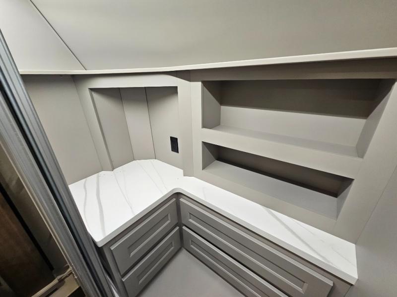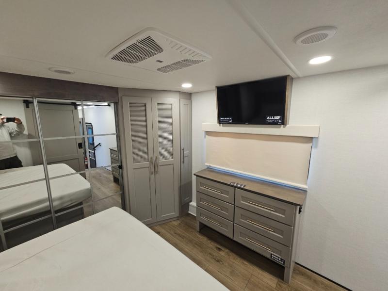 The Paradigm fifth wheels by Alliance RV are functional, high-quality, and luxurious for an unforgettable camping experience. There are three A/C units and a 40K BTU furnace to keep you comfortable year around, and you'll appreciate additional convenient amenities, like the all-in-one enclosed/heated utility center and the color coded and numbered wiring. A Helux Series coil spring pin box comes standard for hassle-free towing, along with Curt 8,000 lb. axles. You'll love the kitchen with its LG solid surface countertops and Lusso range, plus there is LED motion lighting in the pantry and a Maxx fan with a rain sensor to keep everything fresh when making dinner. Each model also includes an HD Smart TV in the living room and bedroom. And of course there are a variety of options you can choose from to further customize your fifth wheel; dual pane windows, Super Solar Plus, slide out awning toppers, and generator prep or a generator to name a few!