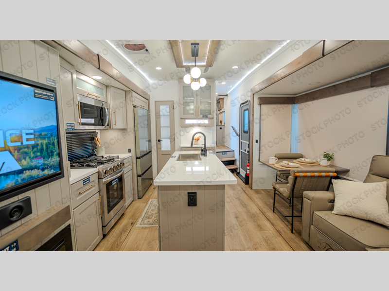 Rear Living Area, Kitchen Island, Flush-Floor Kitchen Slide, Swivel Table and Desk & Hidden Pantry Behind Fireplace