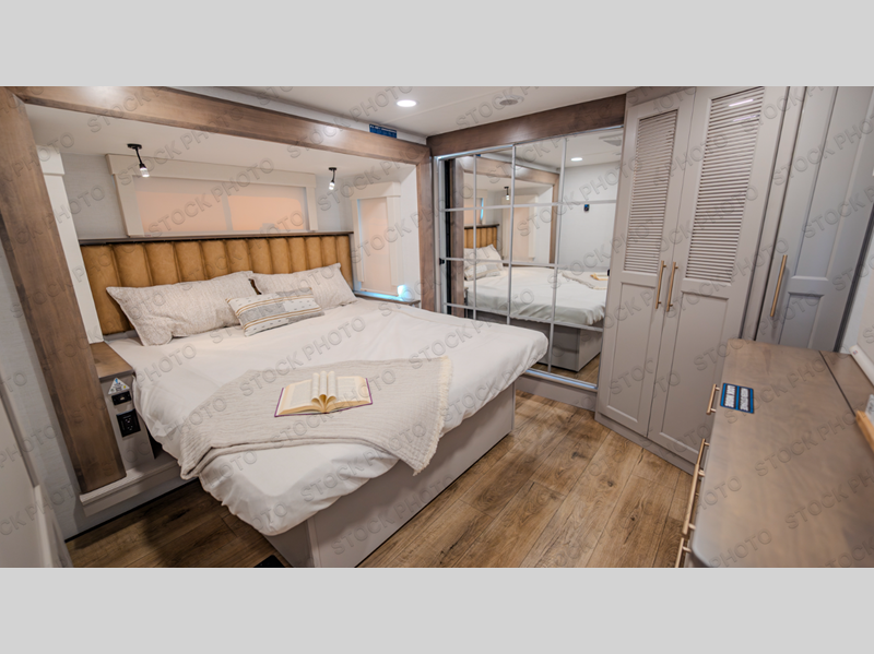 Search for the best views, the nicest RV park, or a place you haven't seen for years with this Paradigm in tow! There is a king bed slide in the master bedroom, a Smart TV, and a dresser with flip-up hidden storage for your belongings. The full bathroom offers a large residential shower, a porcelain toilet with a soft close seat, and storage for your linens, while the kitchen gives you two pantries, an island with a large undermount single basin sink and dishwasher prep if you want the option for easy clean up. You will also have a residential microwave and range, plus a 3.73 cu. ft. oven to make meals. When you're ready to relax for the evening, head to the rear living area to enjoy the dual recliner love seat across from the 50" Smart TV and fireplace!