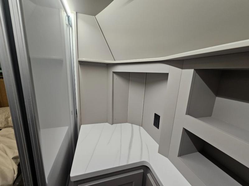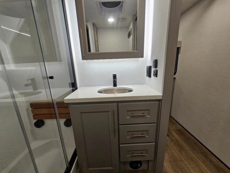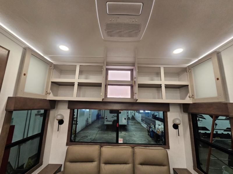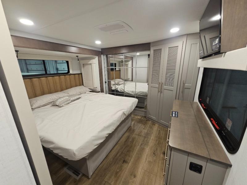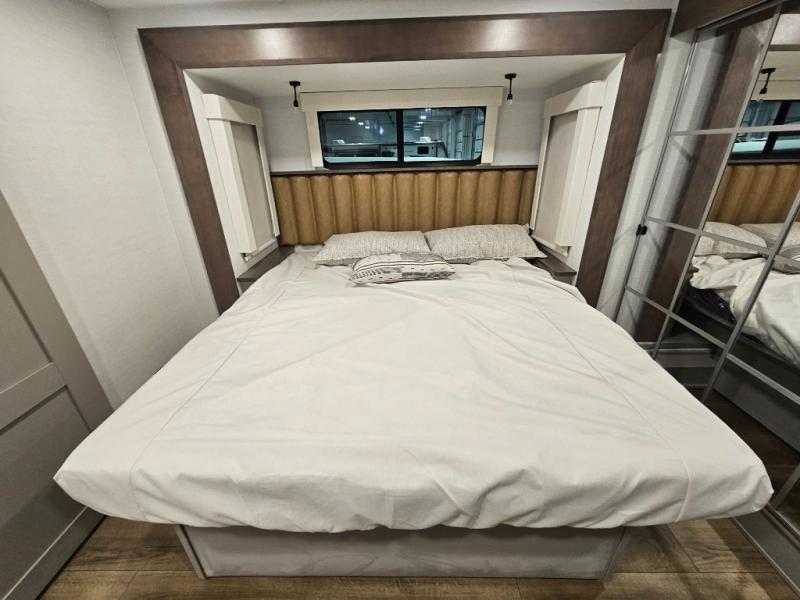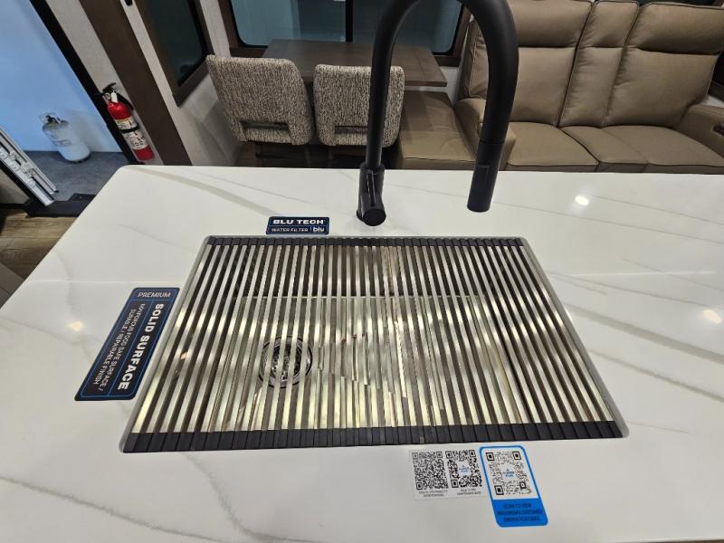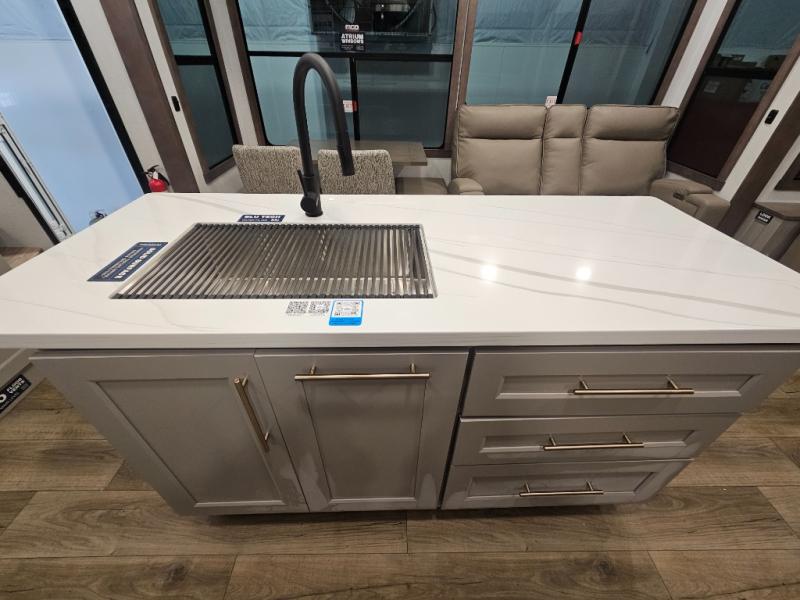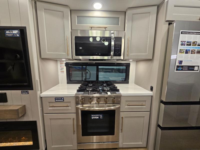 The Paradigm fifth wheels by Alliance RV are functional, high-quality, and luxurious for an unforgettable camping experience. There are three A/C units and a 40K BTU furnace to keep you comfortable year around, and you'll appreciate additional convenient amenities, like the all-in-one enclosed/heated utility center and the color coded and numbered wiring. A Helux Series coil spring pin box comes standard for hassle-free towing, along with Curt 8,000 lb. axles. You'll love the kitchen with its LG solid surface countertops and Lusso range, plus there is LED motion lighting in the pantry and a Maxx fan with a rain sensor to keep everything fresh when making dinner. Each model also includes an HD Smart TV in the living room and bedroom. And of course there are a variety of options you can choose from to further customize your fifth wheel; dual pane windows, Super Solar Plus, slide out awning toppers, and generator prep or a generator to name a few!