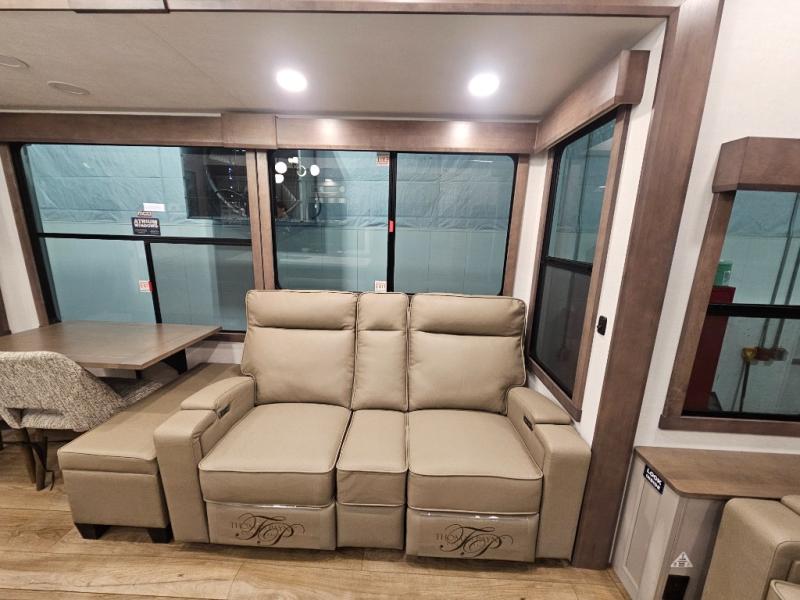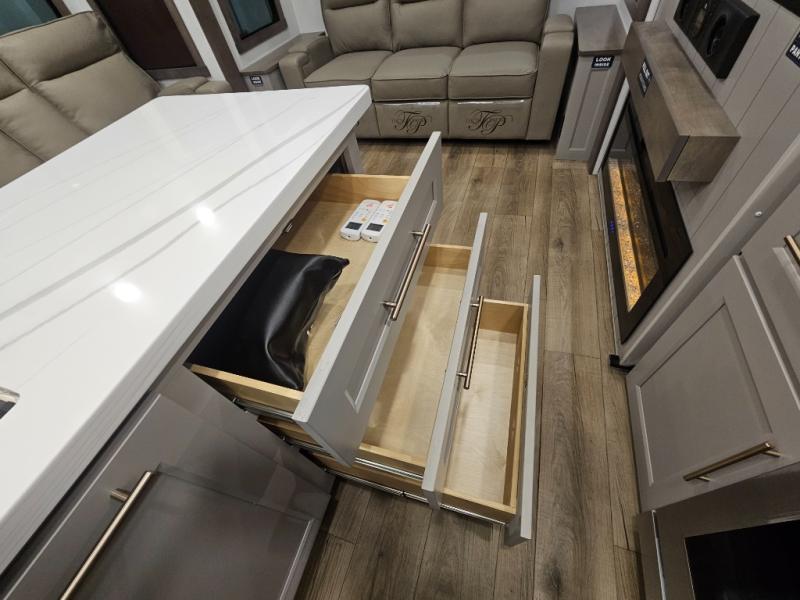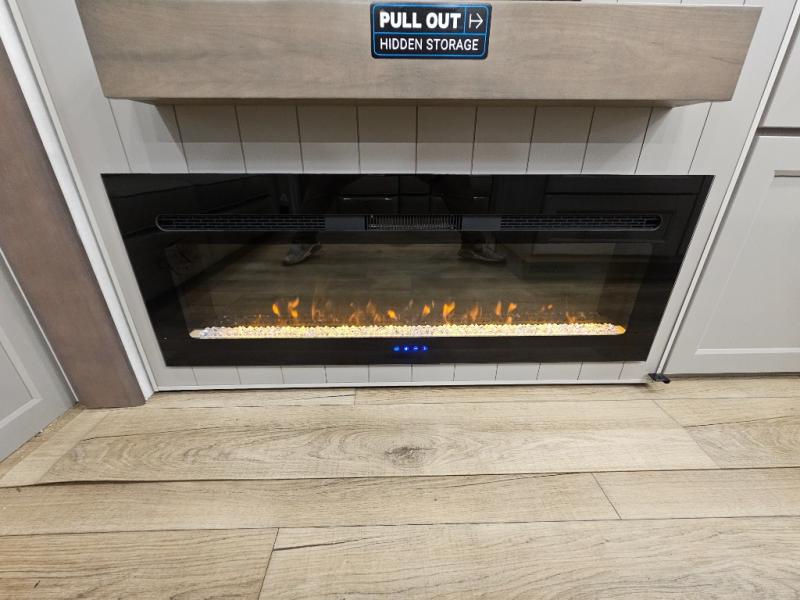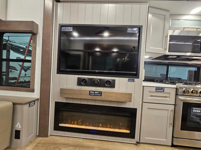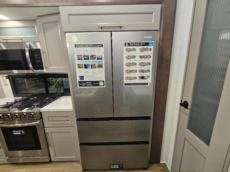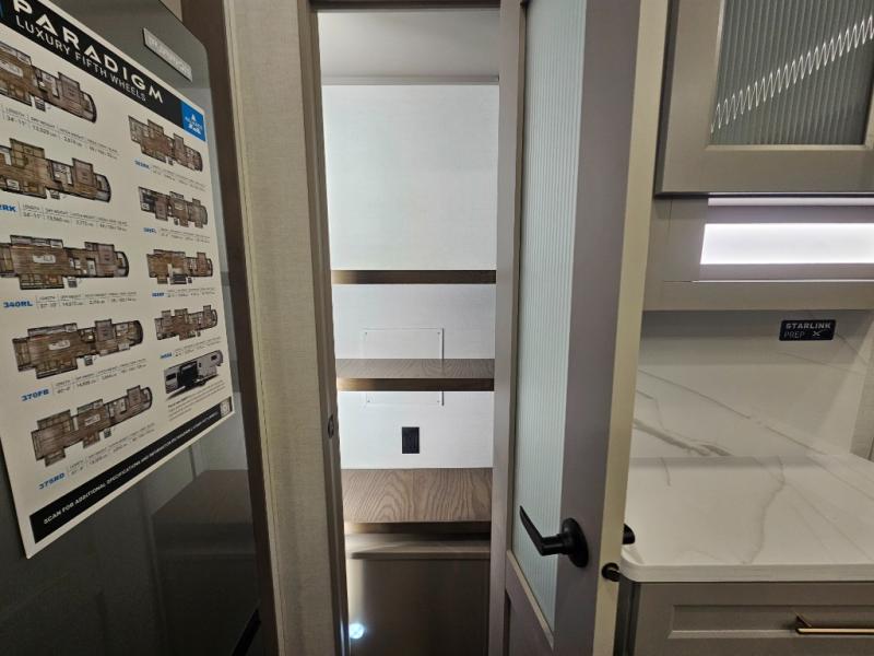 Search for the best views, the nicest RV park, or a place you haven't seen for years with this Paradigm in tow! There is a king bed slide in the master bedroom, a Smart TV, and a dresser with flip-up hidden storage for your belongings. The full bathroom offers a large residential shower, a porcelain toilet with a soft close seat, and storage for your linens, while the kitchen gives you two pantries, an island with a large undermount single basin sink and dishwasher prep if you want the option for easy clean up. You will also have a residential microwave and range, plus a 3.73 cu. ft. oven to make meals. When you're ready to relax for the evening, head to the rear living area to enjoy the dual recliner love seat across from the 50" Smart TV and fireplace!