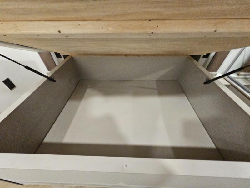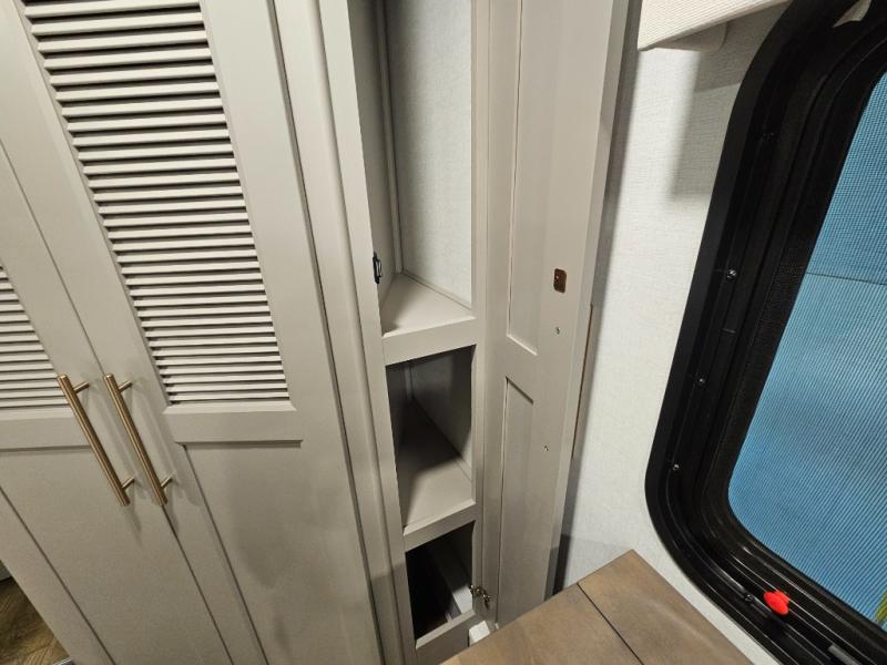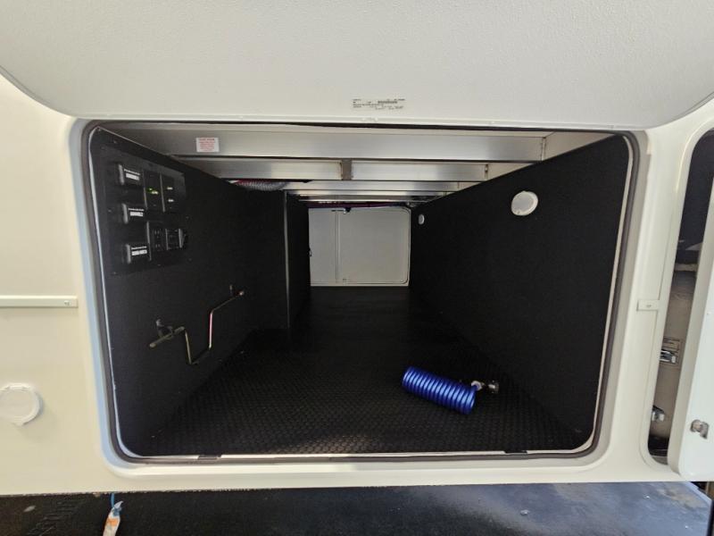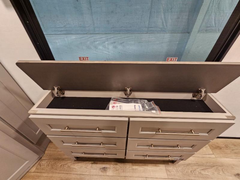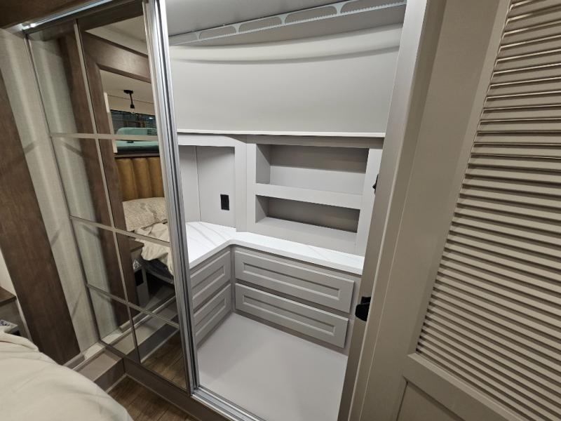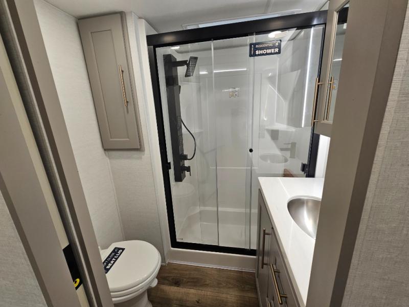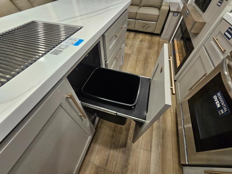Search for the best views, the nicest RV park, or a place you haven't seen for years with this Paradigm in tow! There is a king bed slide in the master bedroom, a Smart TV, and a dresser with flip-up hidden storage for your belongings. The full bathroom offers a large residential shower, a porcelain toilet with a soft close seat, and storage for your linens, while the kitchen gives you two pantries, an island with a large undermount single basin sink and dishwasher prep if you want the option for easy clean up. You will also have a residential microwave and range, plus a 3.73 cu. ft. oven to make meals. When you're ready to relax for the evening, head to the rear living area to enjoy the dual recliner love seat across from the 50" Smart TV and fireplace!