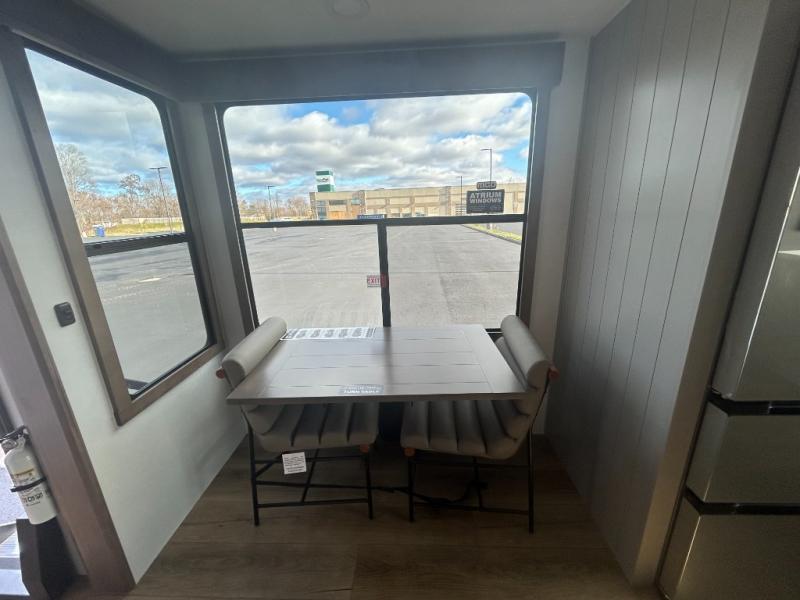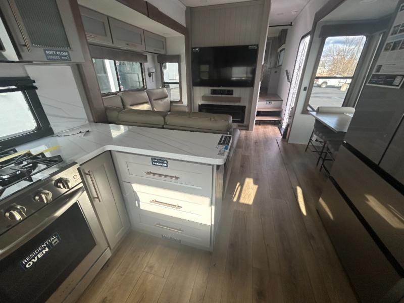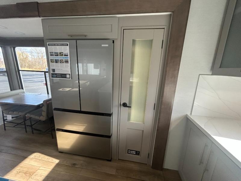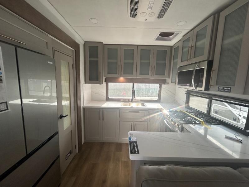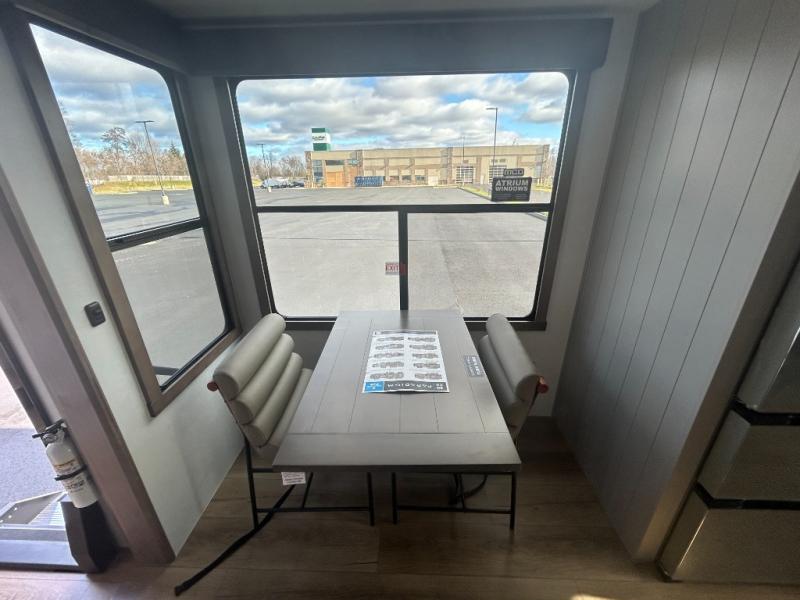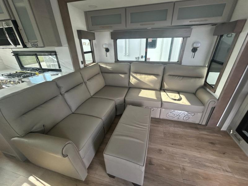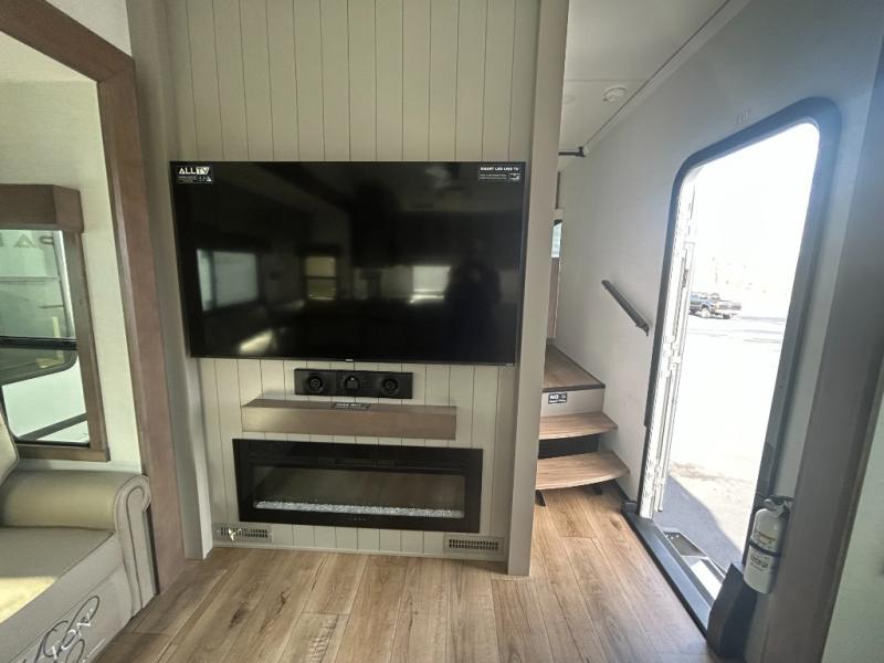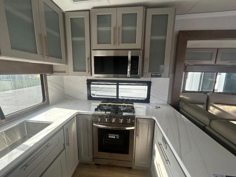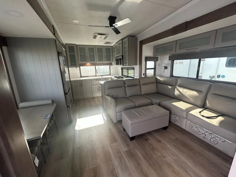 Escape the ordinary and experience the ultimate in luxury travel with this stunning fifth wheel! The rear kitchen is the heart of this fifth wheel, featuring a spacious pantry, 12V refrigerator, microwave, and overhead cabinets. Prepare delicious meals with ease and enjoy the convenience of a fully-equipped kitchen. Unwind in the spacious living area, featuring a plush trifold sofa, L-shape sofa, and a dual recliner love seat. Gather around the turntable dinette or relax in front of the stunning 65” TV. The full bathroom provides a serene space for personal care, while the front bedroom is a peaceful retreat with a comfortable queen bed and a flip-top dresser. Enjoy your favorite shows on the smart TV, perfect for relaxing after a day of adventure.