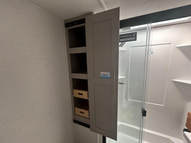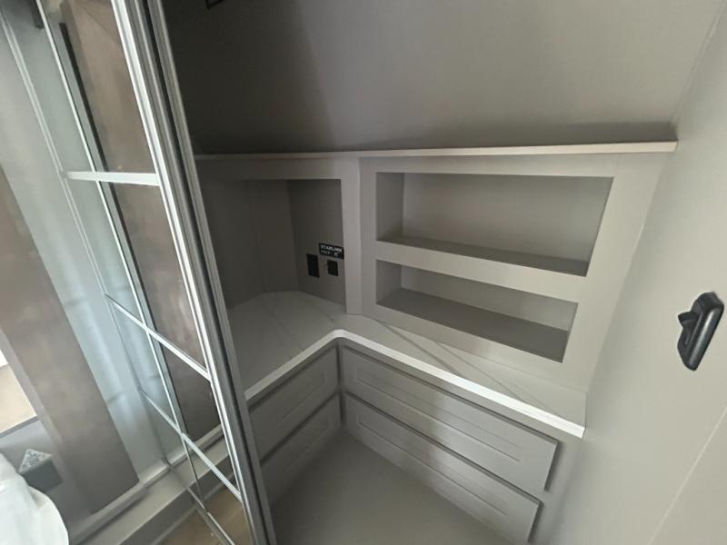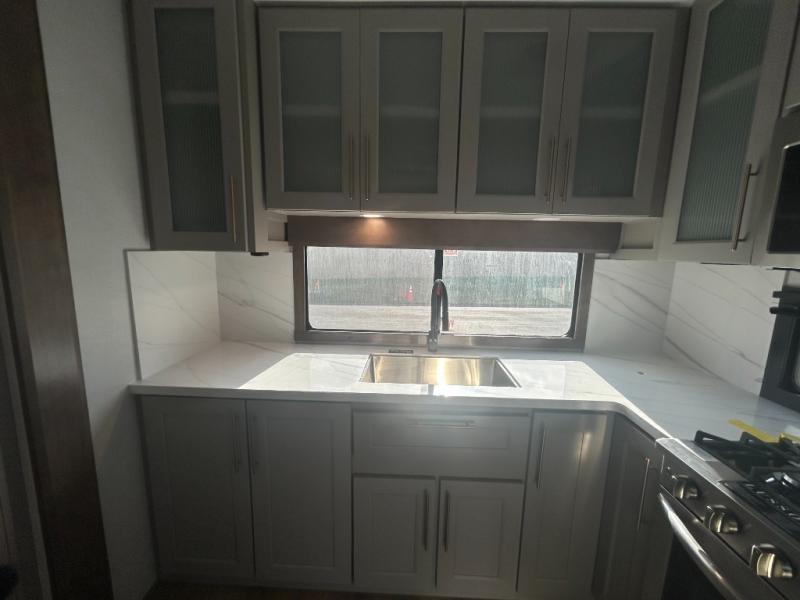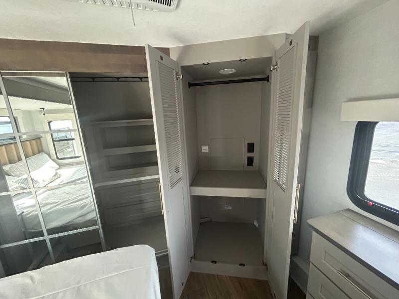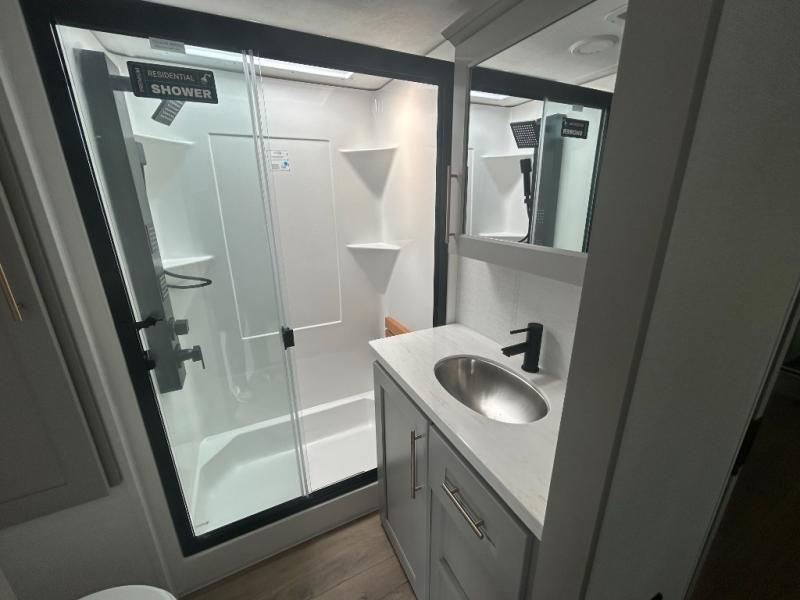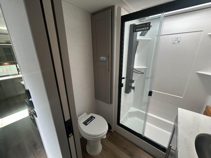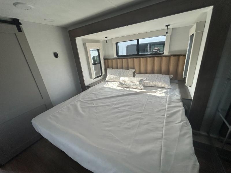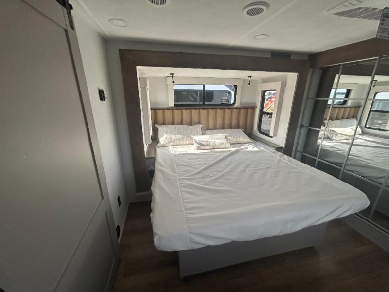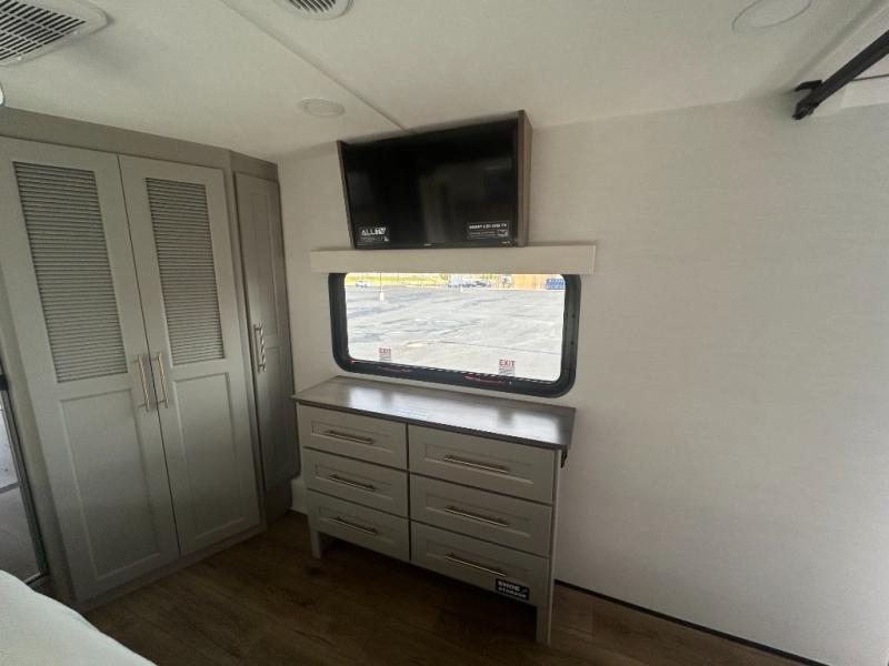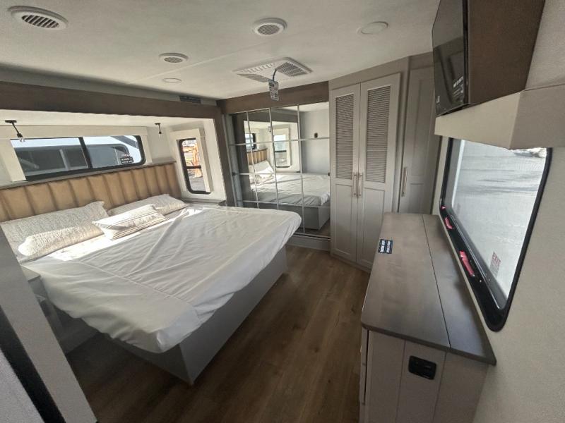 Escape the ordinary and experience the ultimate in luxury travel with this stunning fifth wheel! The rear kitchen is the heart of this fifth wheel, featuring a spacious pantry, 12V refrigerator, microwave, and overhead cabinets. Prepare delicious meals with ease and enjoy the convenience of a fully-equipped kitchen. Unwind in the spacious living area, featuring a plush trifold sofa, L-shape sofa, and a dual recliner love seat. Gather around the turntable dinette or relax in front of the stunning 65” TV. The full bathroom provides a serene space for personal care, while the front bedroom is a peaceful retreat with a comfortable queen bed and a flip-top dresser. Enjoy your favorite shows on the smart TV, perfect for relaxing after a day of adventure.