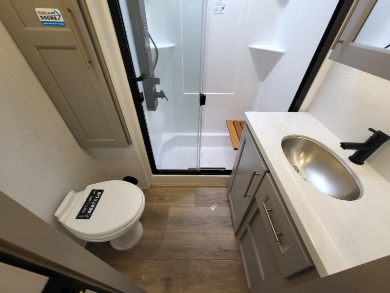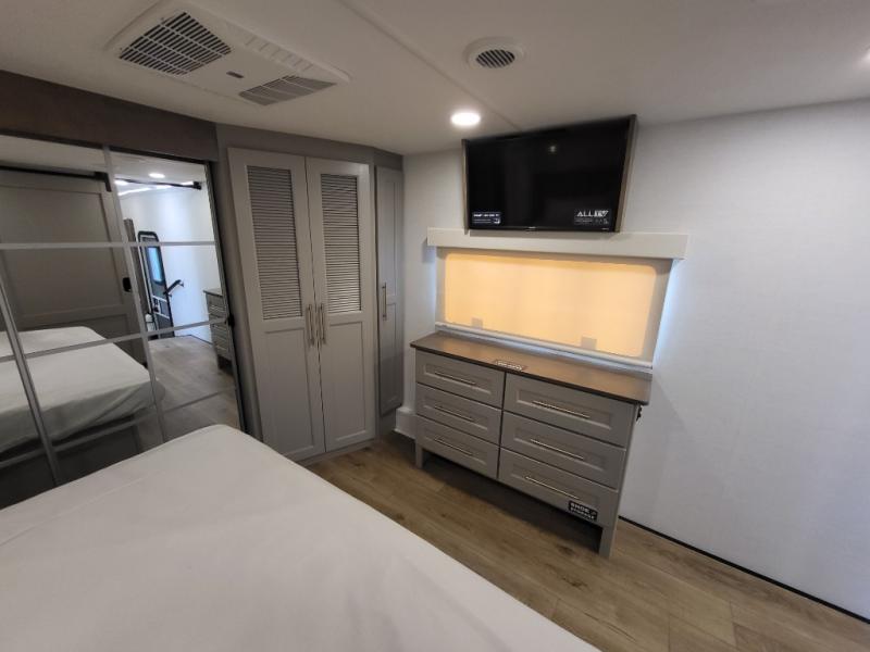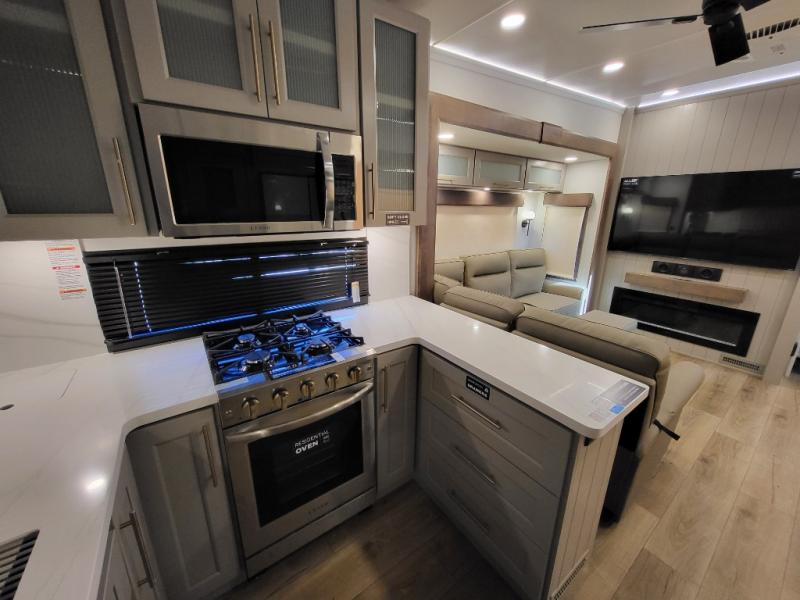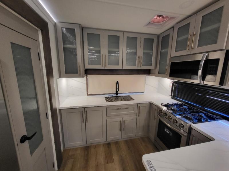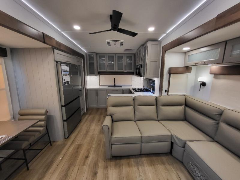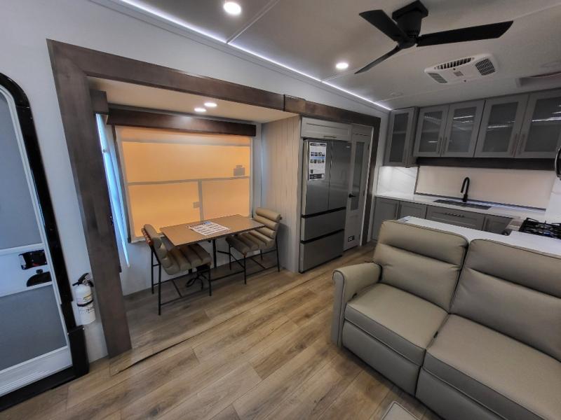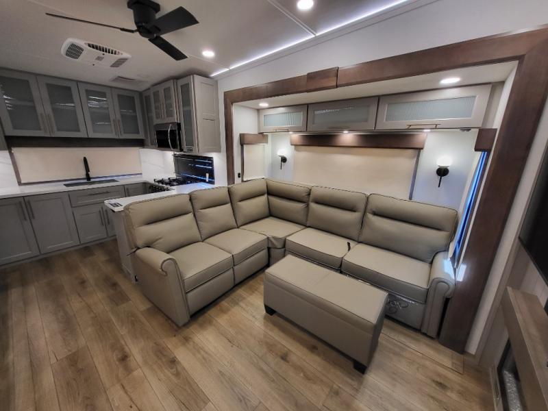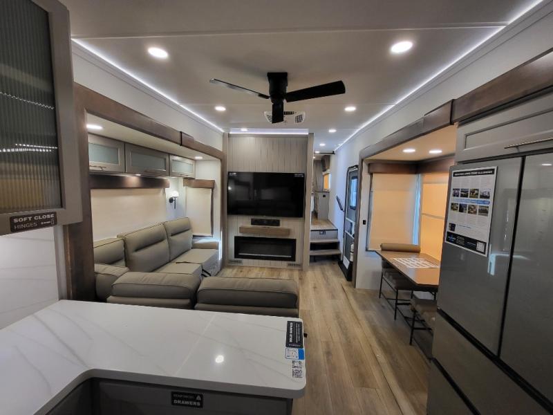 Escape the ordinary and experience the ultimate in luxury travel with this stunning fifth wheel! The rear kitchen is the heart of this fifth wheel, featuring a spacious pantry, 12V refrigerator, microwave, and overhead cabinets. Prepare delicious meals with ease and enjoy the convenience of a fully-equipped kitchen. Unwind in the spacious living area, featuring a plush trifold sofa, L-shape sofa, and a dual recliner love seat. Gather around the turntable dinette or relax in front of the stunning 65” TV. The full bathroom provides a serene space for personal care, while the front bedroom is a peaceful retreat with a comfortable queen bed and a flip-top dresser. Enjoy your favorite shows on the smart TV, perfect for relaxing after a day of adventure.
