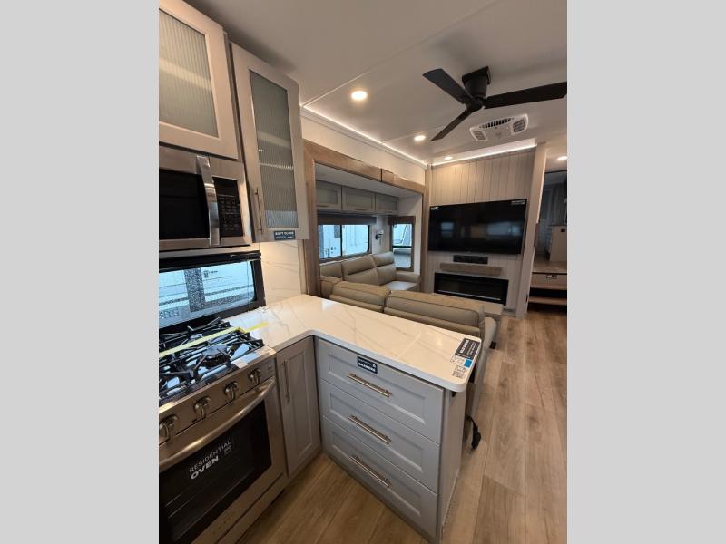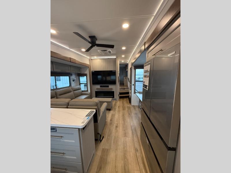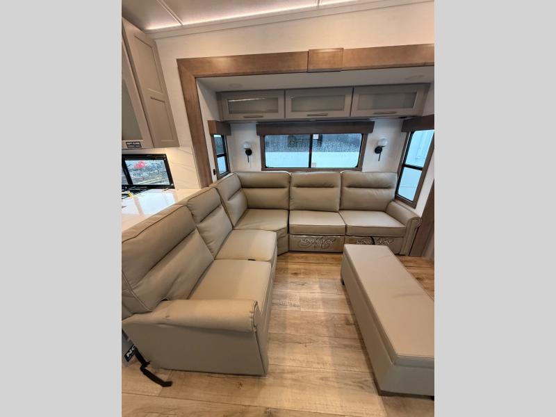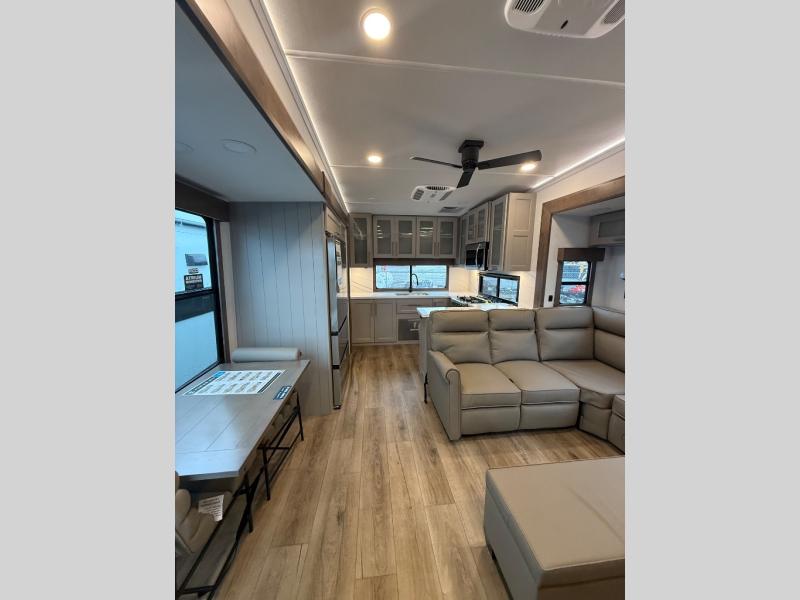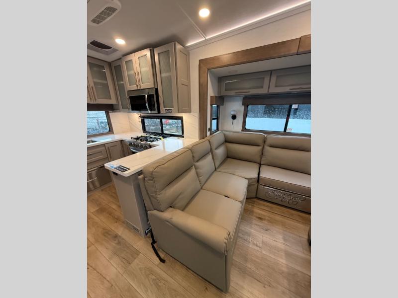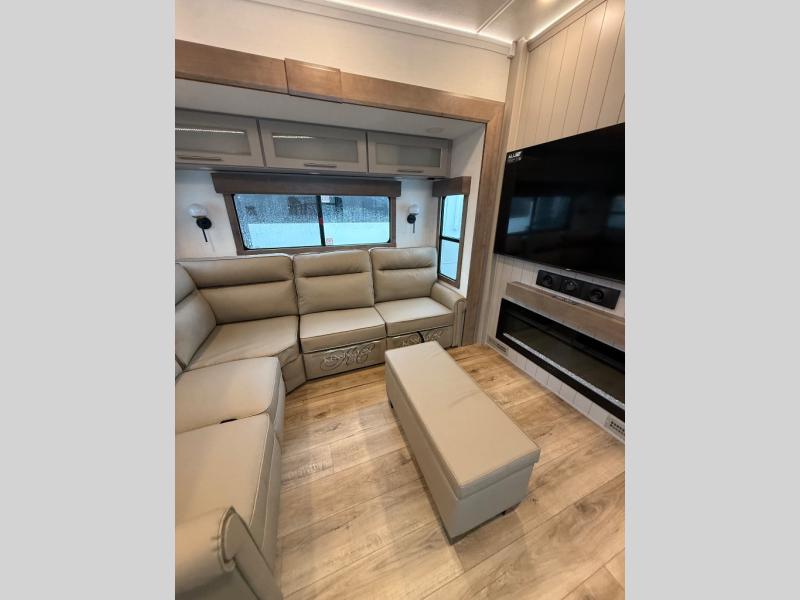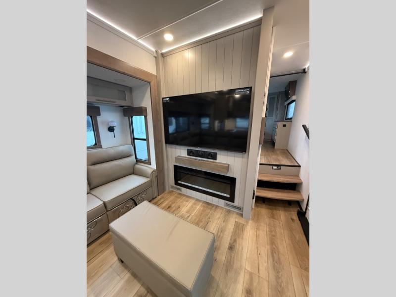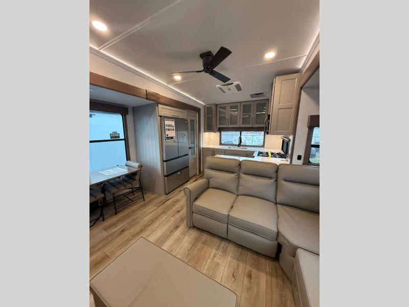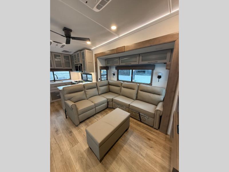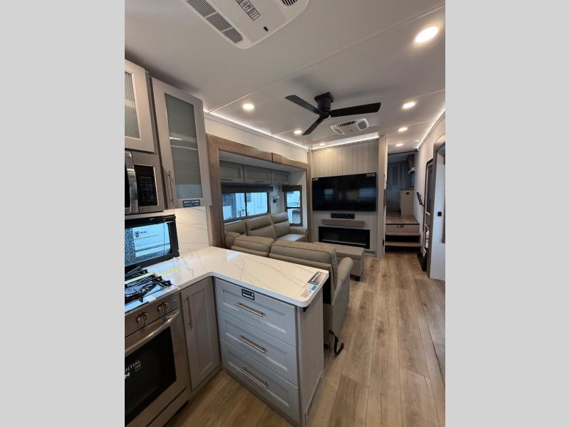 Escape the ordinary and experience the ultimate in luxury travel with this stunning fifth wheel! The rear kitchen is the heart of this fifth wheel, featuring a spacious pantry, 12V refrigerator, microwave, and overhead cabinets. Prepare delicious meals with ease and enjoy the convenience of a fully-equipped kitchen. Unwind in the spacious living area, featuring a plush trifold sofa, L-shape sofa, and a dual recliner love seat. Gather around the turntable dinette or relax in front of the stunning 65” TV. The full bathroom provides a serene space for personal care, while the front bedroom is a peaceful retreat with a comfortable queen bed and a flip-top dresser. Enjoy your favorite shows on the smart TV, perfect for relaxing after a day of adventure.