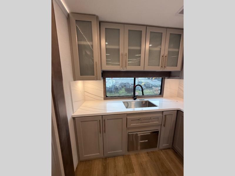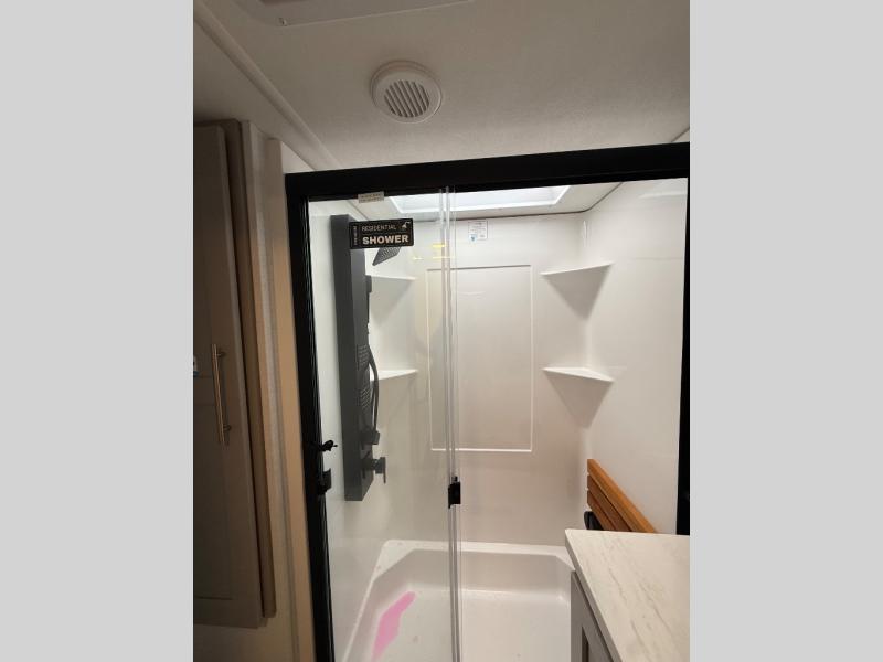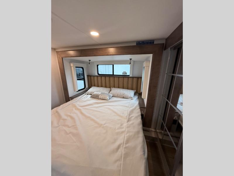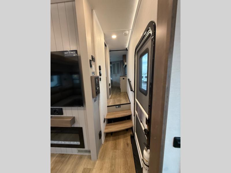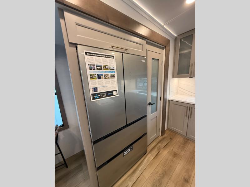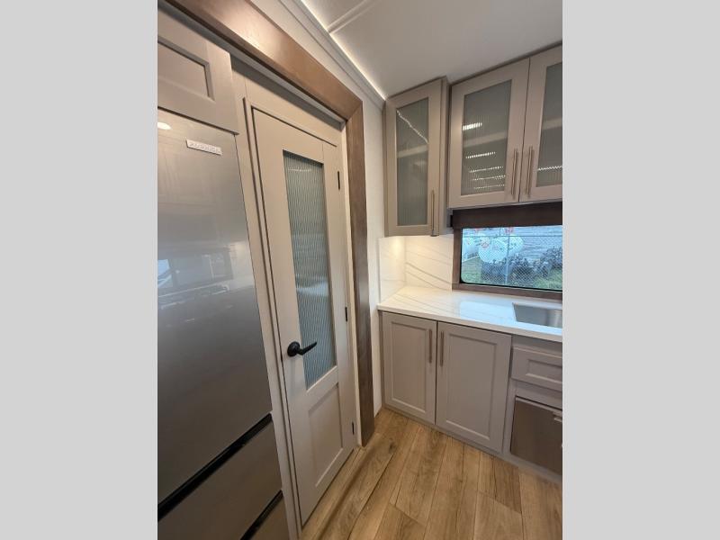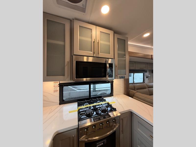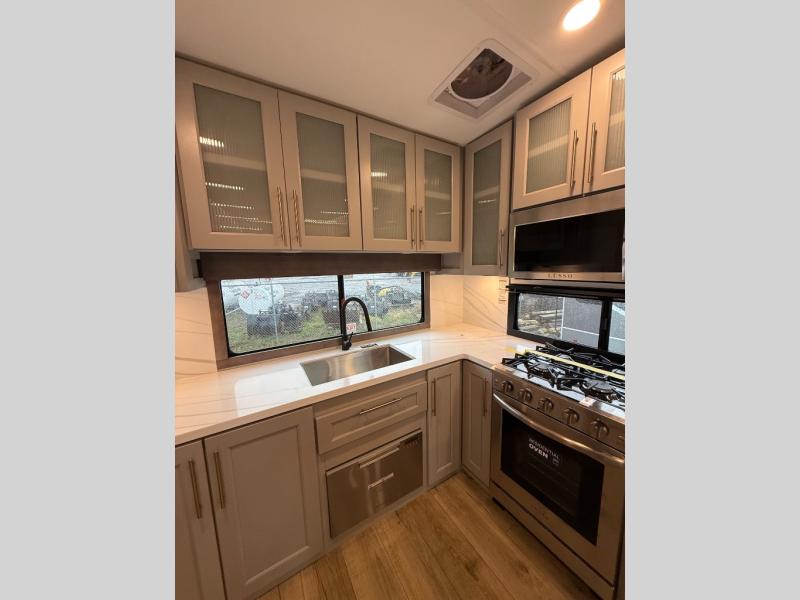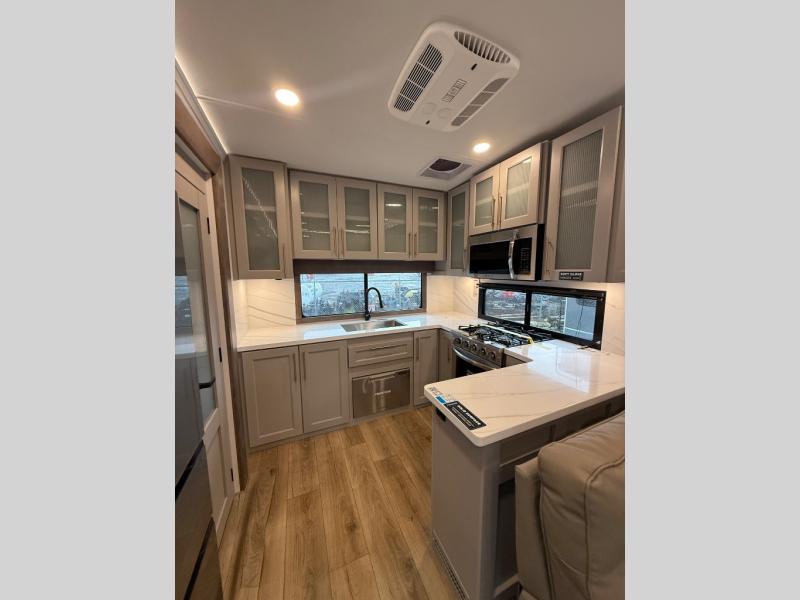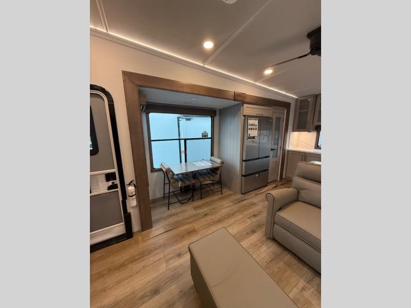 Escape the ordinary and experience the ultimate in luxury travel with this stunning fifth wheel! The rear kitchen is the heart of this fifth wheel, featuring a spacious pantry, 12V refrigerator, microwave, and overhead cabinets. Prepare delicious meals with ease and enjoy the convenience of a fully-equipped kitchen. Unwind in the spacious living area, featuring a plush trifold sofa, L-shape sofa, and a dual recliner love seat. Gather around the turntable dinette or relax in front of the stunning 65” TV. The full bathroom provides a serene space for personal care, while the front bedroom is a peaceful retreat with a comfortable queen bed and a flip-top dresser. Enjoy your favorite shows on the smart TV, perfect for relaxing after a day of adventure.