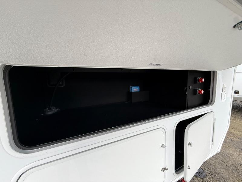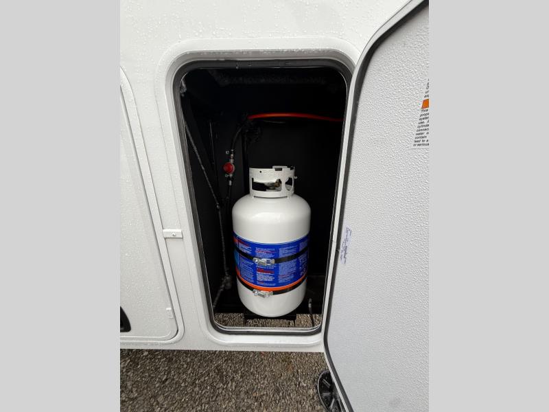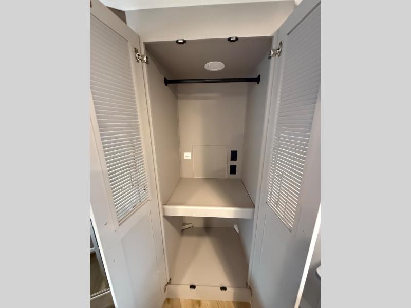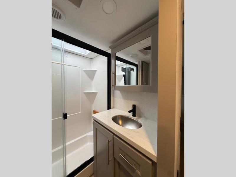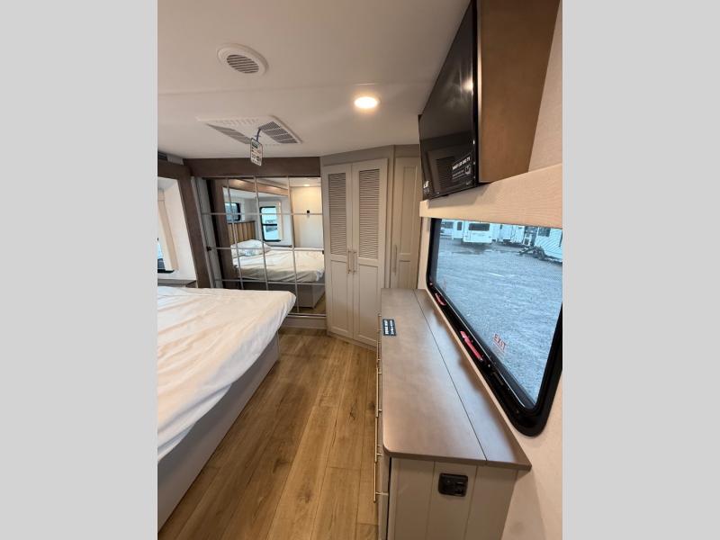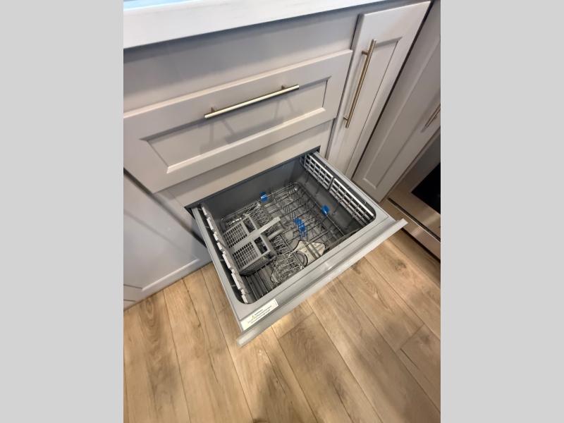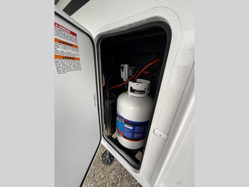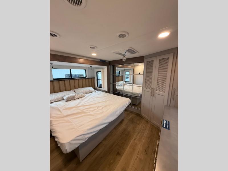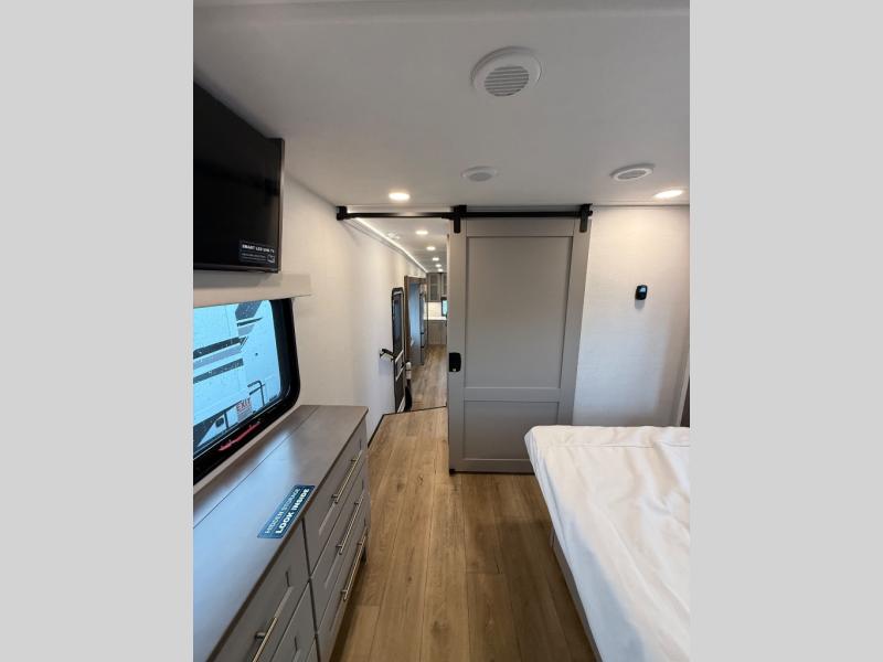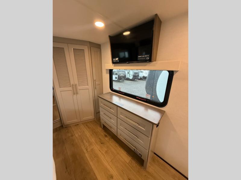 Escape the ordinary and experience the ultimate in luxury travel with this stunning fifth wheel! The rear kitchen is the heart of this fifth wheel, featuring a spacious pantry, 12V refrigerator, microwave, and overhead cabinets. Prepare delicious meals with ease and enjoy the convenience of a fully-equipped kitchen. Unwind in the spacious living area, featuring a plush trifold sofa, L-shape sofa, and a dual recliner love seat. Gather around the turntable dinette or relax in front of the stunning 65” TV. The full bathroom provides a serene space for personal care, while the front bedroom is a peaceful retreat with a comfortable queen bed and a flip-top dresser. Enjoy your favorite shows on the smart TV, perfect for relaxing after a day of adventure.