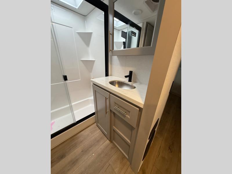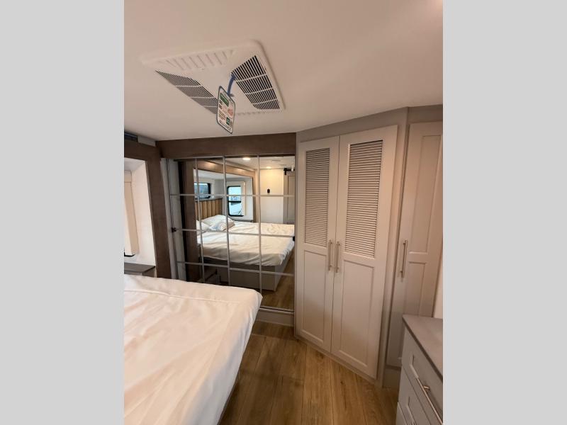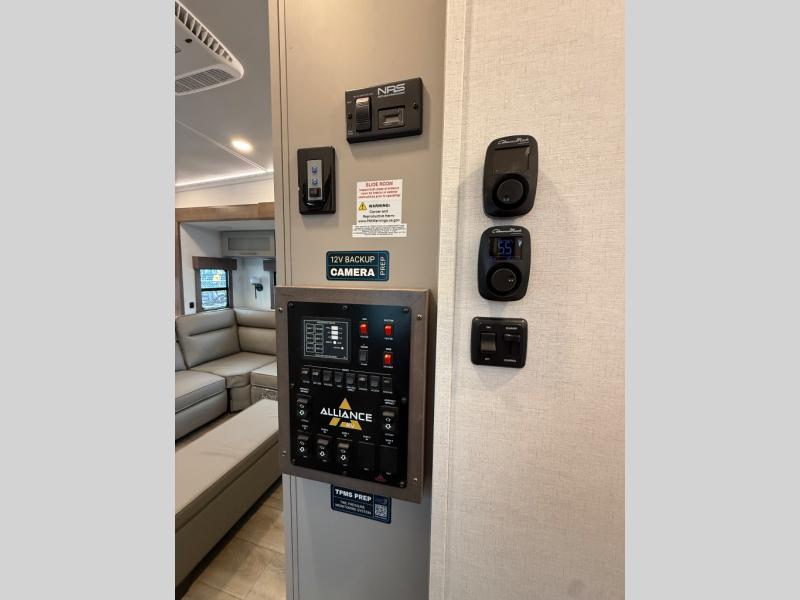 The Paradigm fifth wheels by Alliance RV are functional, high-quality, and luxurious for an unforgettable camping experience. There are three A/C units and a 40K BTU furnace to keep you comfortable year around, and you'll appreciate additional convenient amenities, like the all-in-one enclosed/heated utility center and the color coded and numbered wiring. A Helux Series coil spring pin box comes standard for hassle-free towing, along with Curt 8,000 lb. axles. You'll love the kitchen with its LG solid surface countertops and Lusso range, plus there is LED motion lighting in the pantry and a Maxx fan with a rain sensor to keep everything fresh when making dinner. Each model also includes an HD Smart TV in the living room and bedroom. And of course there are a variety of options you can choose from to further customize your fifth wheel; dual pane windows, Super Solar Plus, slide out awning toppers, and generator prep or a generator to name a few!