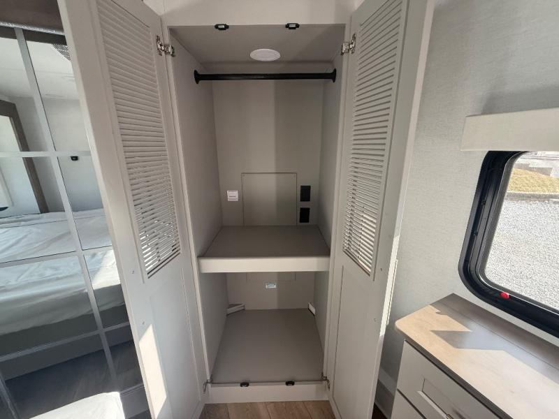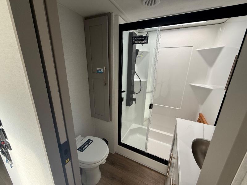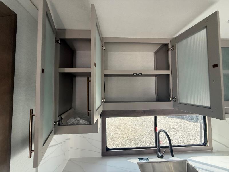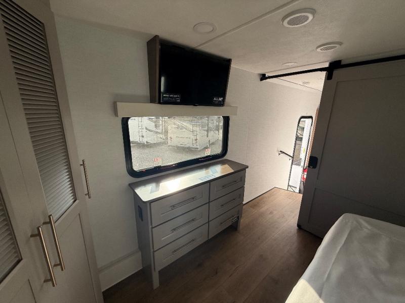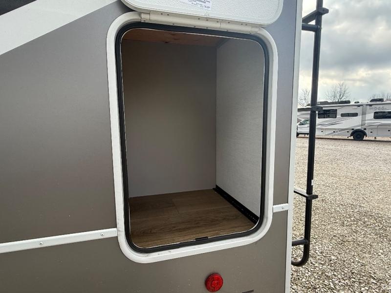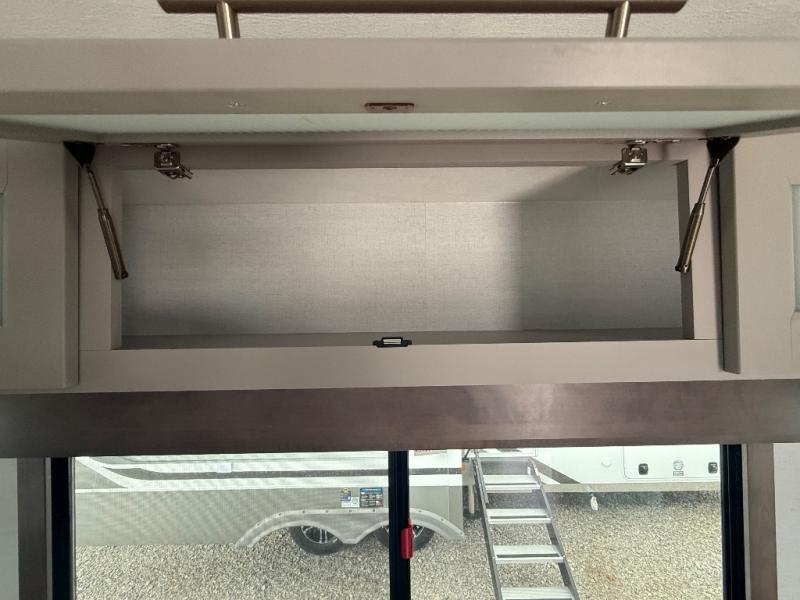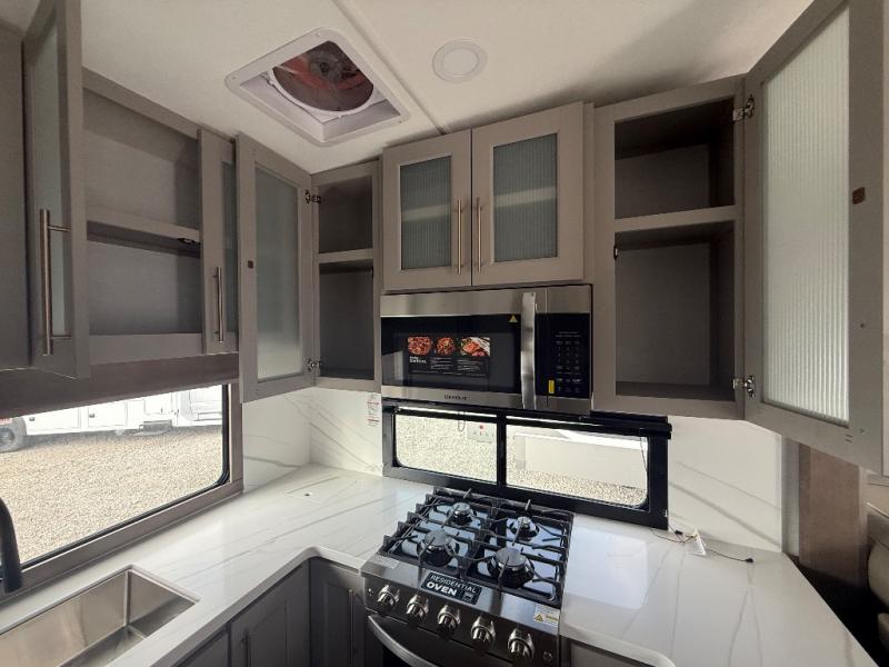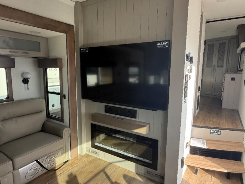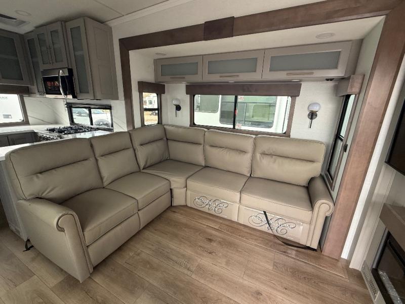 Escape the ordinary and experience the ultimate in luxury travel with this stunning fifth wheel! The rear kitchen is the heart of this fifth wheel, featuring a spacious pantry, 12V refrigerator, microwave, and overhead cabinets. Prepare delicious meals with ease and enjoy the convenience of a fully-equipped kitchen. Unwind in the spacious living area, featuring a plush trifold sofa, L-shape sofa, and a dual recliner love seat. Gather around the turntable dinette or relax in front of the stunning 65” TV. The full bathroom provides a serene space for personal care, while the front bedroom is a peaceful retreat with a comfortable queen bed and a flip-top dresser. Enjoy your favorite shows on the smart TV, perfect for relaxing after a day of adventure.