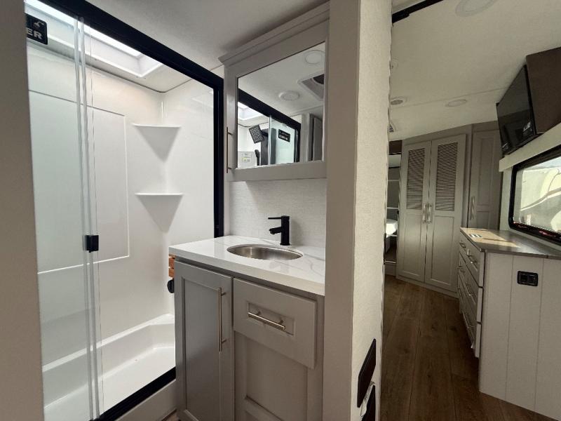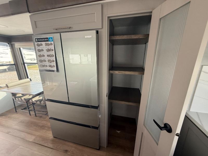 The Paradigm fifth wheels by Alliance RV are functional, high-quality, and luxurious for an unforgettable camping experience. There are three A/C units and a 40K BTU furnace to keep you comfortable year around, and you'll appreciate additional convenient amenities, like the all-in-one enclosed/heated utility center and the color coded and numbered wiring. A Helux Series coil spring pin box comes standard for hassle-free towing, along with Curt 8,000 lb. axles. You'll love the kitchen with its LG solid surface countertops and Lusso range, plus there is LED motion lighting in the pantry and a Maxx fan with a rain sensor to keep everything fresh when making dinner. Each model also includes an HD Smart TV in the living room and bedroom. And of course there are a variety of options you can choose from to further customize your fifth wheel; dual pane windows, Super Solar Plus, slide out awning toppers, and generator prep or a generator to name a few!