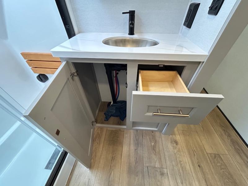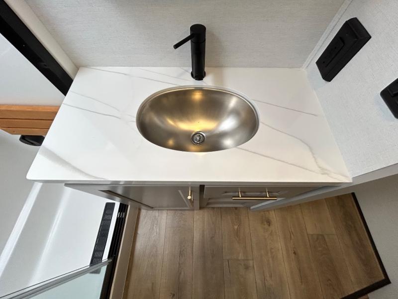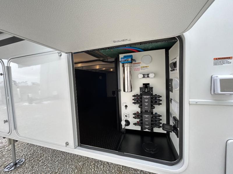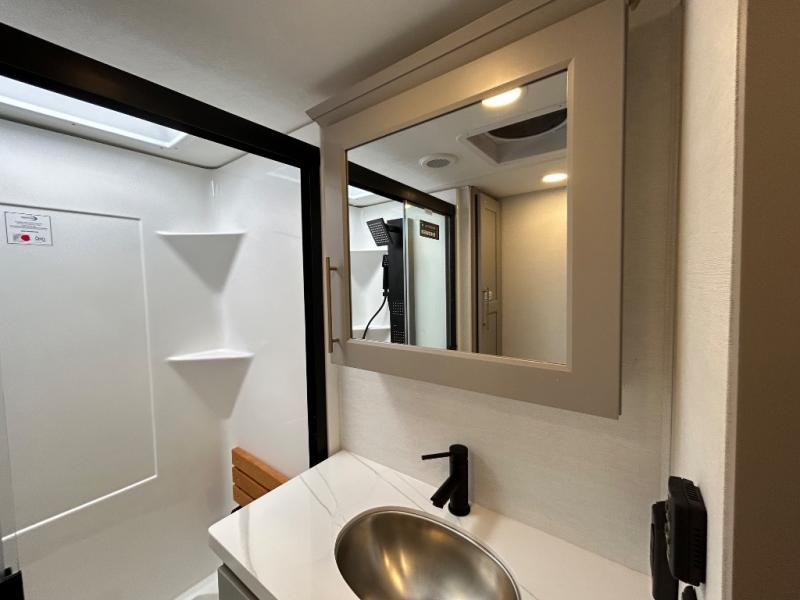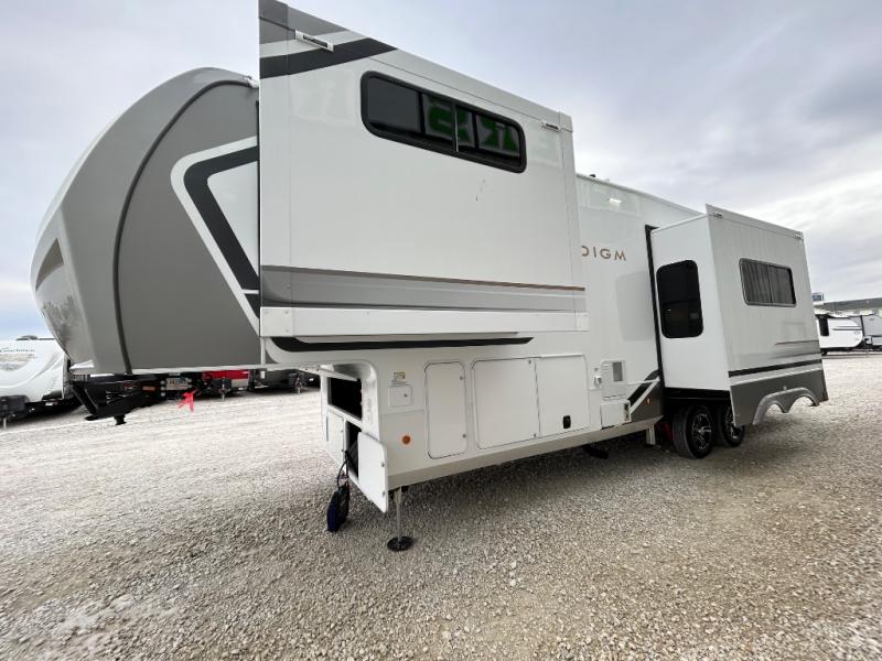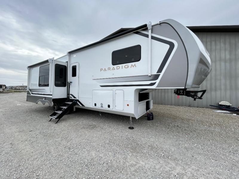 The Paradigm fifth wheels by Alliance RV are functional, high-quality, and luxurious for an unforgettable camping experience. There are three A/C units and a 40K BTU furnace to keep you comfortable year around, and you'll appreciate additional convenient amenities, like the all-in-one enclosed/heated utility center and the color coded and numbered wiring. A Helux Series coil spring pin box comes standard for hassle-free towing, along with Curt 8,000 lb. axles. You'll love the kitchen with its LG solid surface countertops and Lusso range, plus there is LED motion lighting in the pantry and a Maxx fan with a rain sensor to keep everything fresh when making dinner. Each model also includes an HD Smart TV in the living room and bedroom. And of course there are a variety of options you can choose from to further customize your fifth wheel; dual pane windows, Super Solar Plus, slide out awning toppers, and generator prep or a generator to name a few!