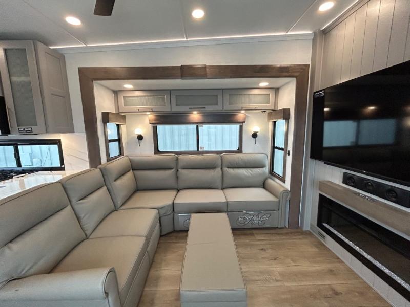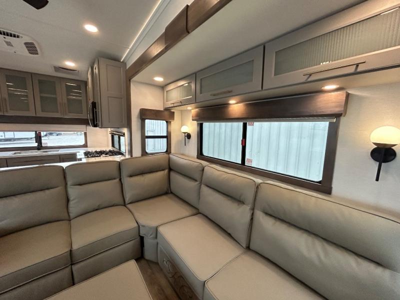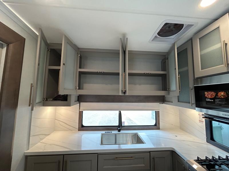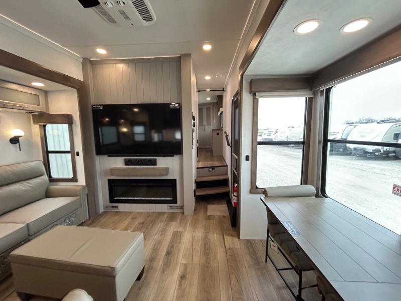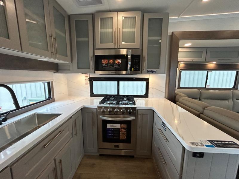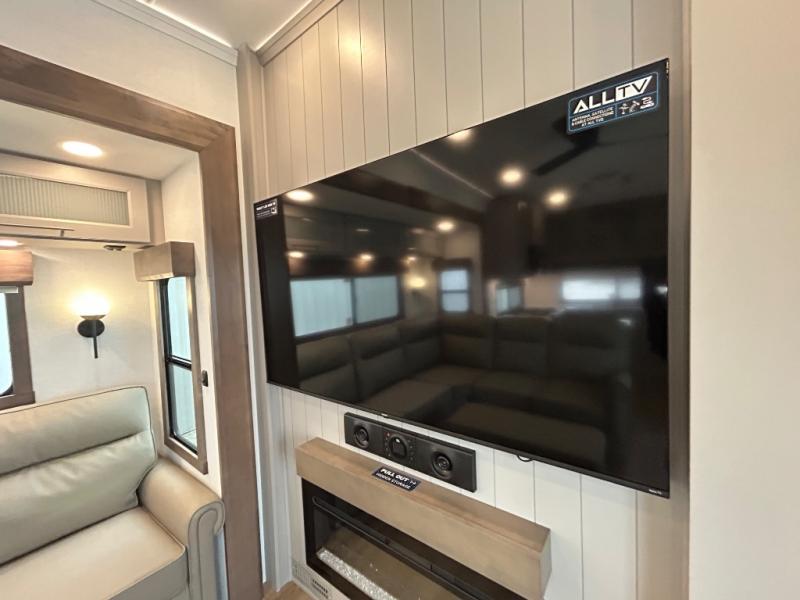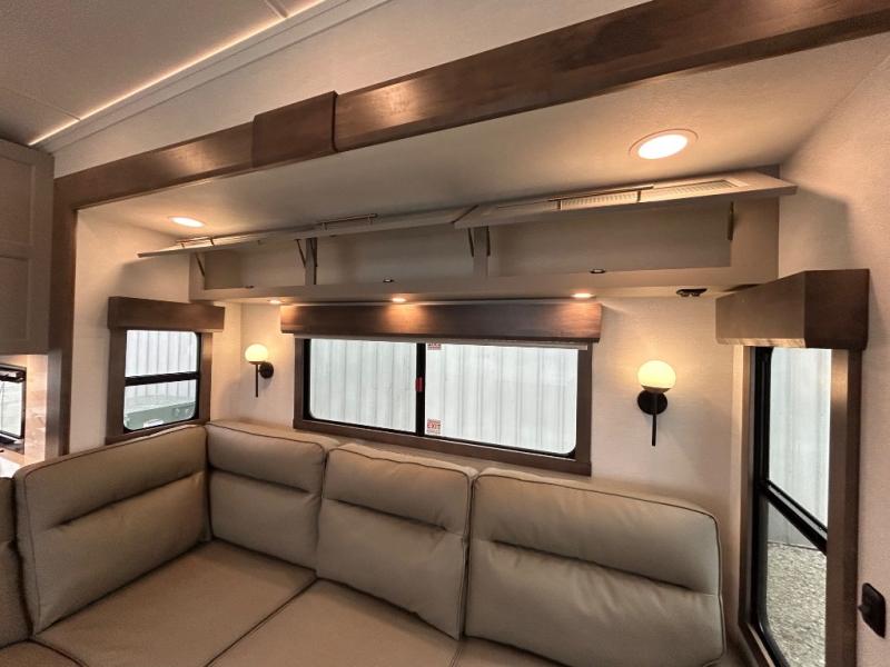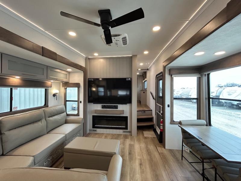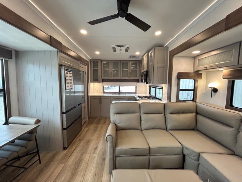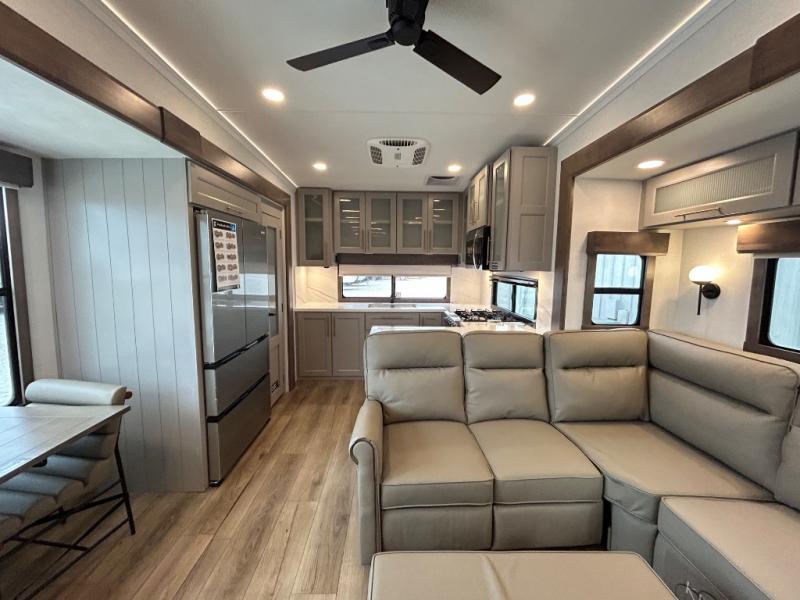 Escape the ordinary and experience the ultimate in luxury travel with this stunning fifth wheel! The rear kitchen is the heart of this fifth wheel, featuring a spacious pantry, 12V refrigerator, microwave, and overhead cabinets. Prepare delicious meals with ease and enjoy the convenience of a fully-equipped kitchen. Unwind in the spacious living area, featuring a plush trifold sofa, L-shape sofa, and a dual recliner love seat. Gather around the turntable dinette or relax in front of the stunning 65” TV. The full bathroom provides a serene space for personal care, while the front bedroom is a peaceful retreat with a comfortable queen bed and a flip-top dresser. Enjoy your favorite shows on the smart TV, perfect for relaxing after a day of adventure.