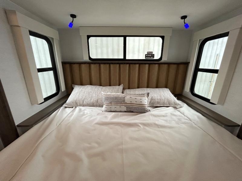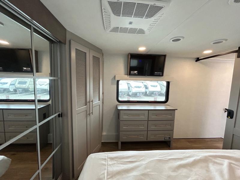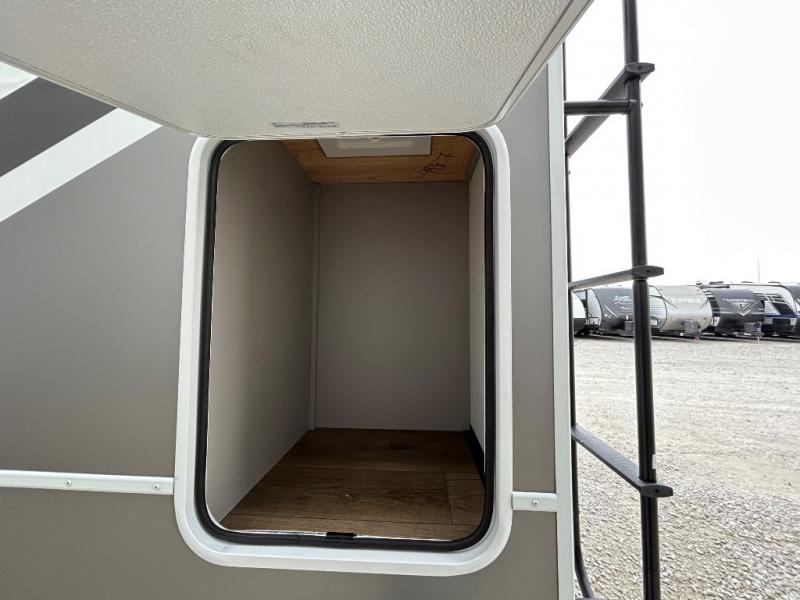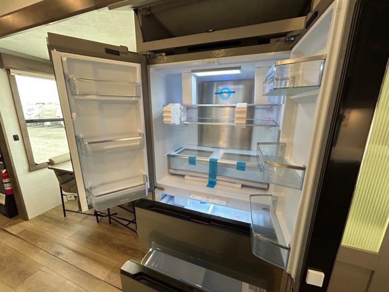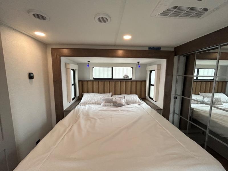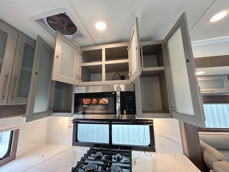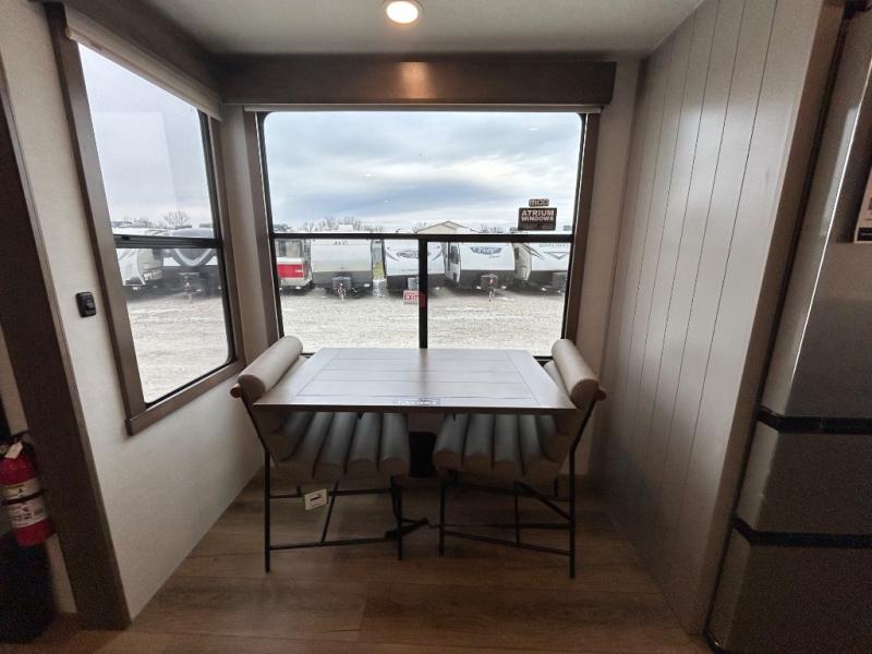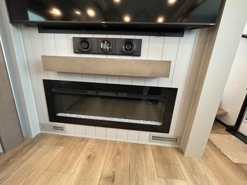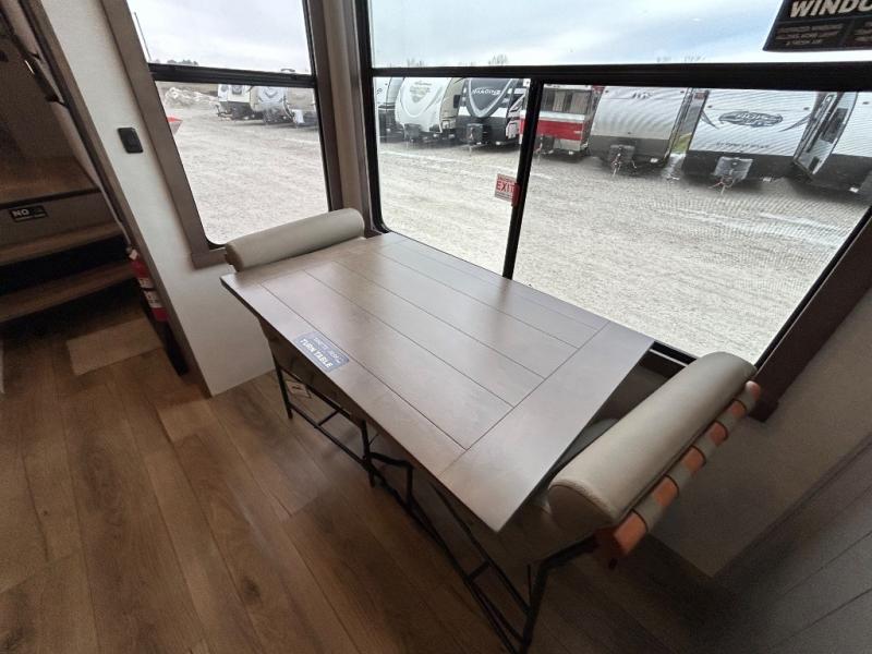 Escape the ordinary and experience the ultimate in luxury travel with this stunning fifth wheel! The rear kitchen is the heart of this fifth wheel, featuring a spacious pantry, 12V refrigerator, microwave, and overhead cabinets. Prepare delicious meals with ease and enjoy the convenience of a fully-equipped kitchen. Unwind in the spacious living area, featuring a plush trifold sofa, L-shape sofa, and a dual recliner love seat. Gather around the turntable dinette or relax in front of the stunning 65” TV. The full bathroom provides a serene space for personal care, while the front bedroom is a peaceful retreat with a comfortable queen bed and a flip-top dresser. Enjoy your favorite shows on the smart TV, perfect for relaxing after a day of adventure.