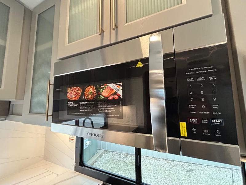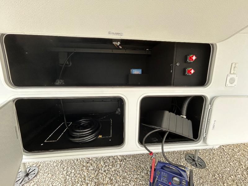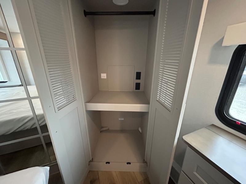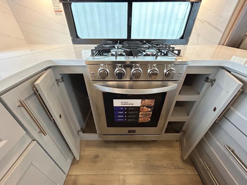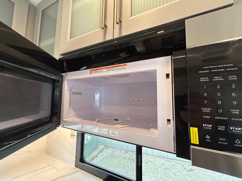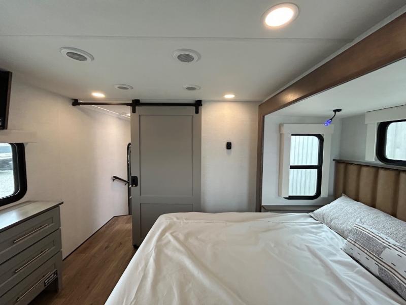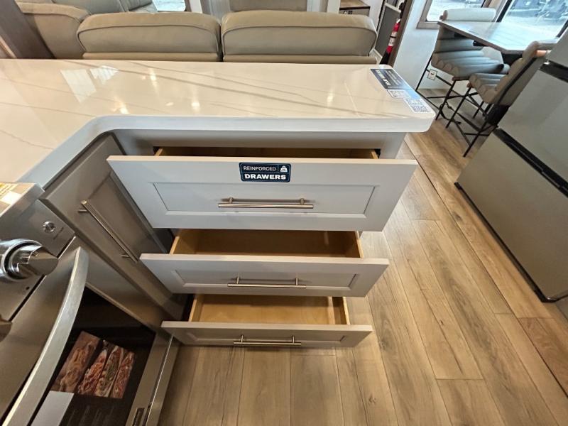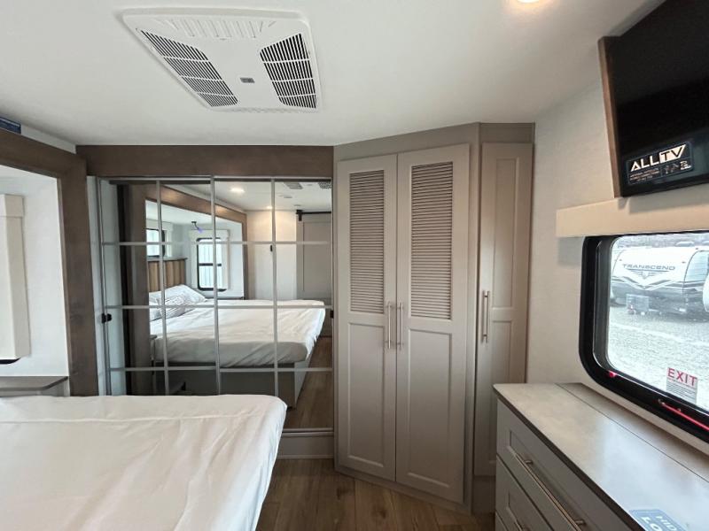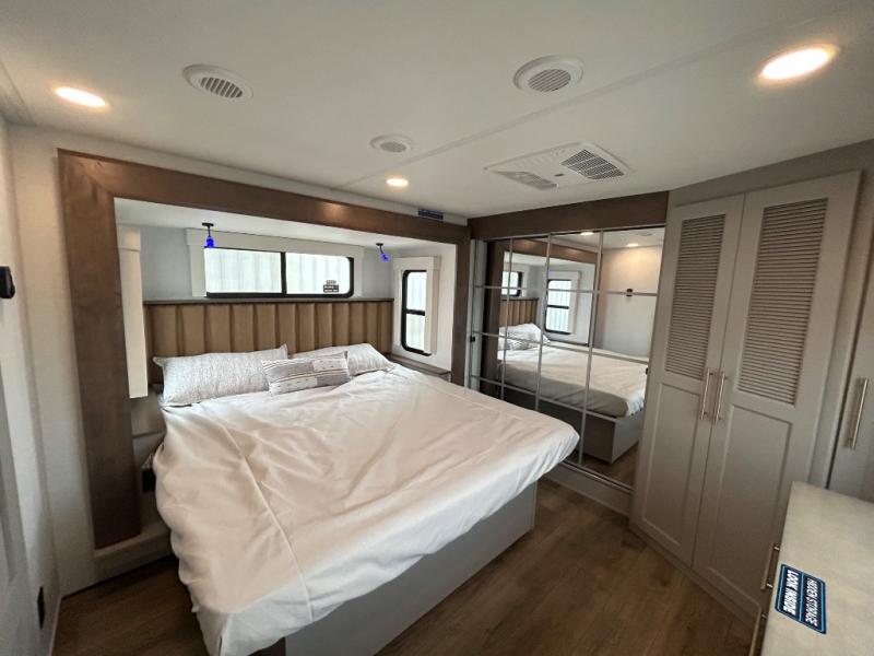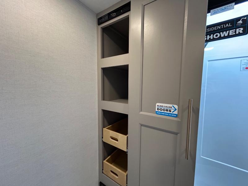 Escape the ordinary and experience the ultimate in luxury travel with this stunning fifth wheel! The rear kitchen is the heart of this fifth wheel, featuring a spacious pantry, 12V refrigerator, microwave, and overhead cabinets. Prepare delicious meals with ease and enjoy the convenience of a fully-equipped kitchen. Unwind in the spacious living area, featuring a plush trifold sofa, L-shape sofa, and a dual recliner love seat. Gather around the turntable dinette or relax in front of the stunning 65” TV. The full bathroom provides a serene space for personal care, while the front bedroom is a peaceful retreat with a comfortable queen bed and a flip-top dresser. Enjoy your favorite shows on the smart TV, perfect for relaxing after a day of adventure.