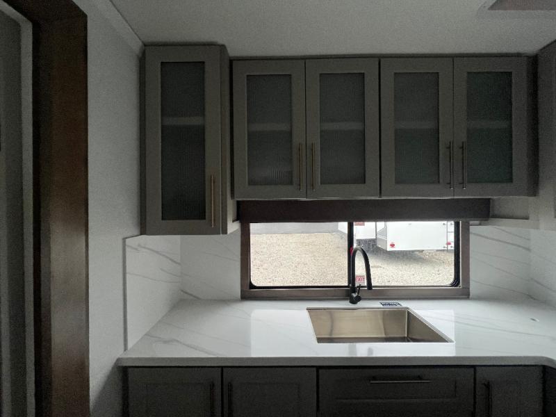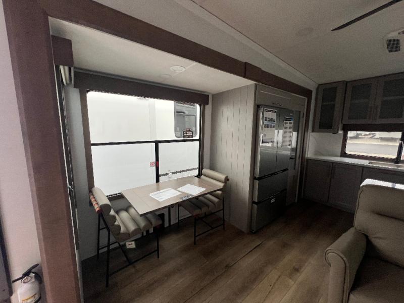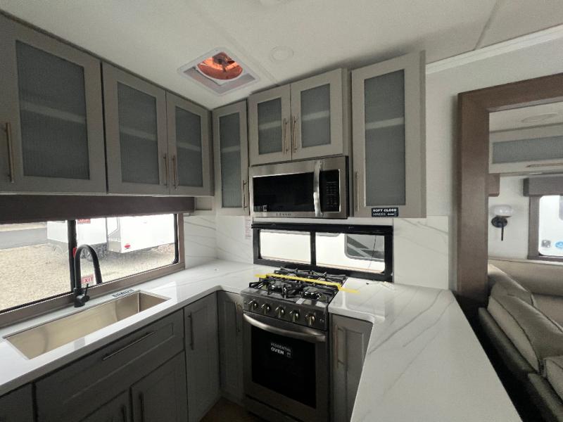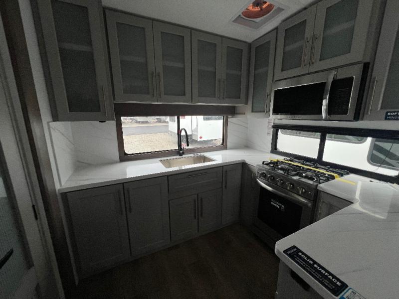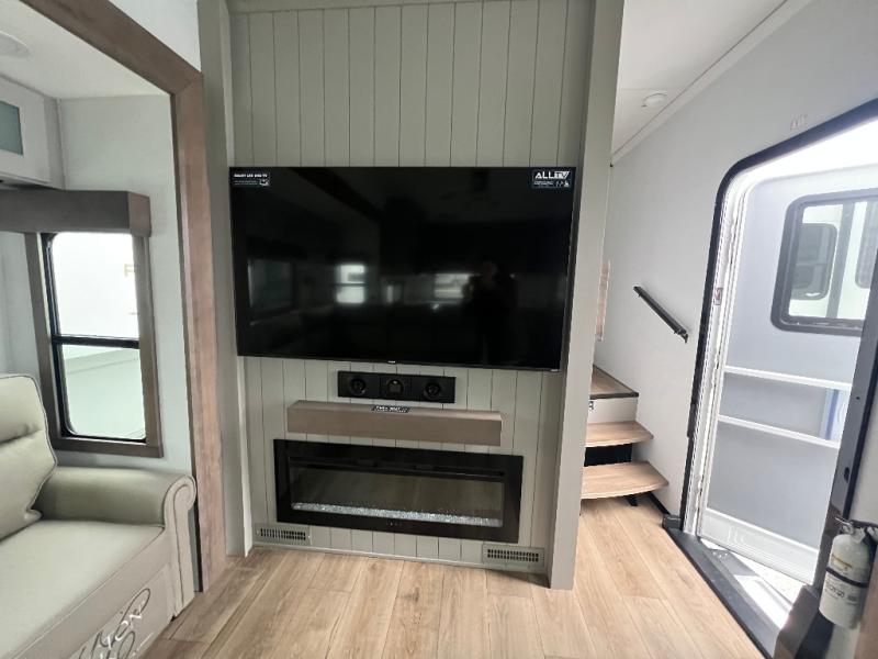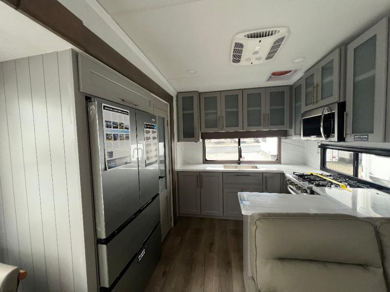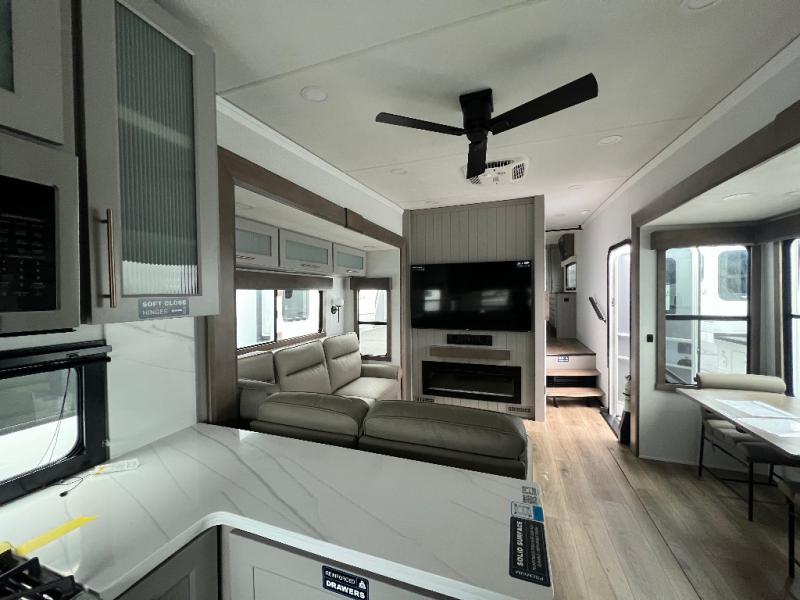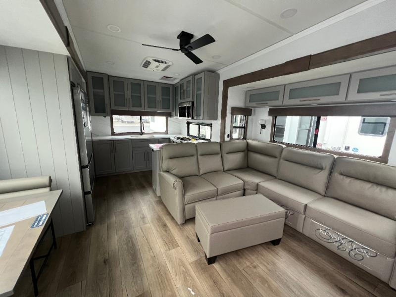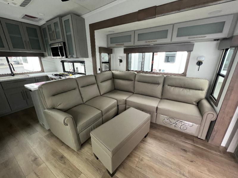 Escape the ordinary and experience the ultimate in luxury travel with this stunning fifth wheel! The rear kitchen is the heart of this fifth wheel, featuring a spacious pantry, 12V refrigerator, microwave, and overhead cabinets. Prepare delicious meals with ease and enjoy the convenience of a fully-equipped kitchen. Unwind in the spacious living area, featuring a plush trifold sofa, L-shape sofa, and a dual recliner love seat. Gather around the turntable dinette or relax in front of the stunning 65” TV. The full bathroom provides a serene space for personal care, while the front bedroom is a peaceful retreat with a comfortable queen bed and a flip-top dresser. Enjoy your favorite shows on the smart TV, perfect for relaxing after a day of adventure.