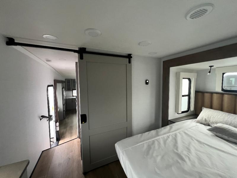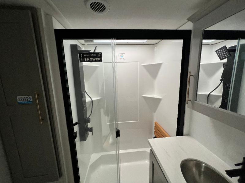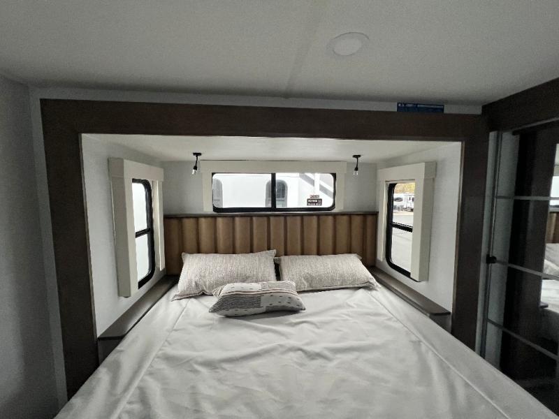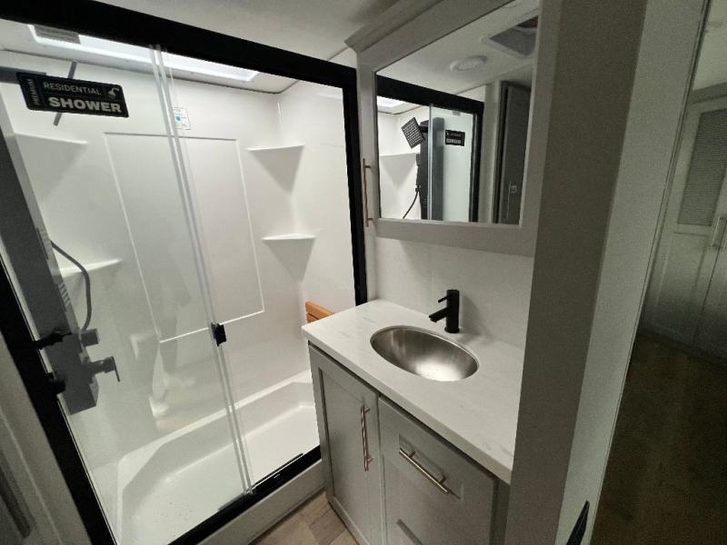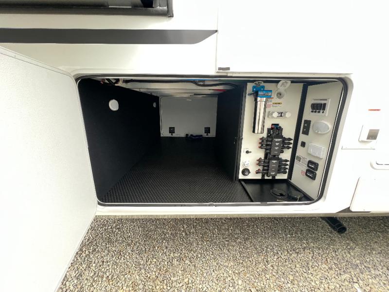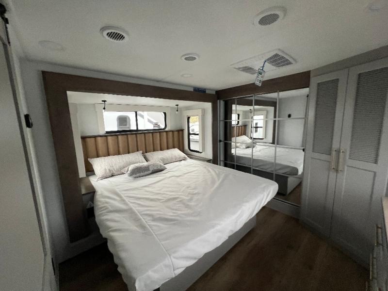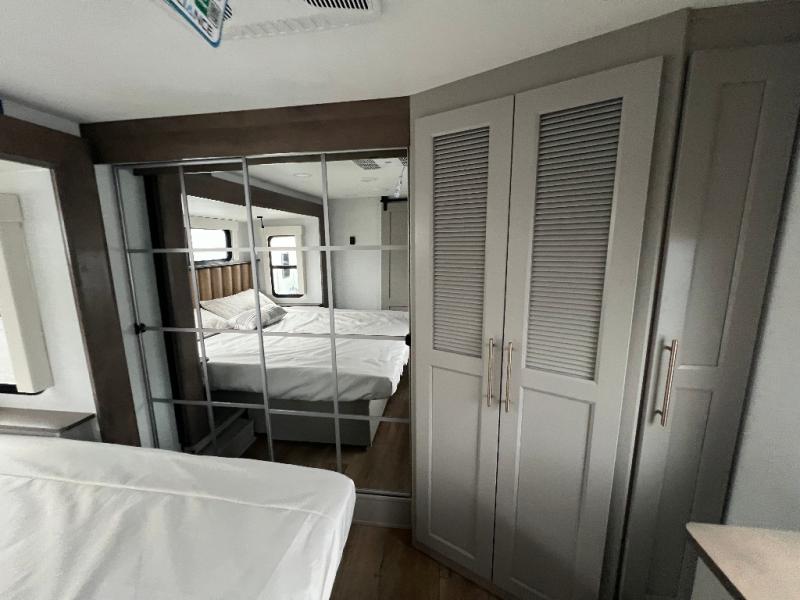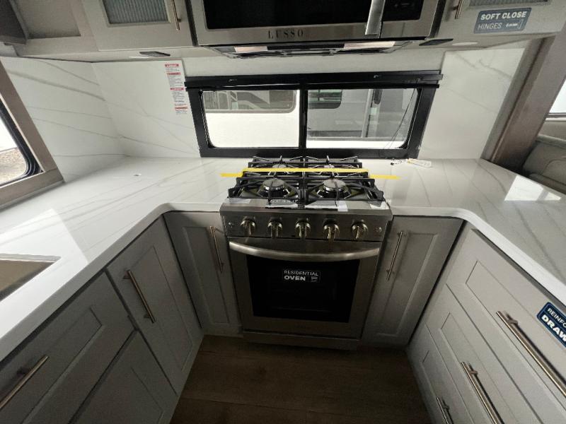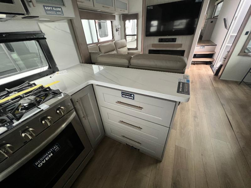 Escape the ordinary and experience the ultimate in luxury travel with this stunning fifth wheel! The rear kitchen is the heart of this fifth wheel, featuring a spacious pantry, 12V refrigerator, microwave, and overhead cabinets. Prepare delicious meals with ease and enjoy the convenience of a fully-equipped kitchen. Unwind in the spacious living area, featuring a plush trifold sofa, L-shape sofa, and a dual recliner love seat. Gather around the turntable dinette or relax in front of the stunning 65” TV. The full bathroom provides a serene space for personal care, while the front bedroom is a peaceful retreat with a comfortable queen bed and a flip-top dresser. Enjoy your favorite shows on the smart TV, perfect for relaxing after a day of adventure.