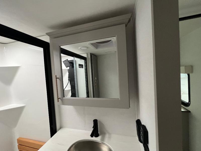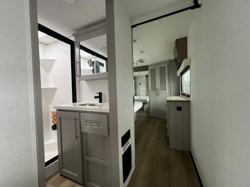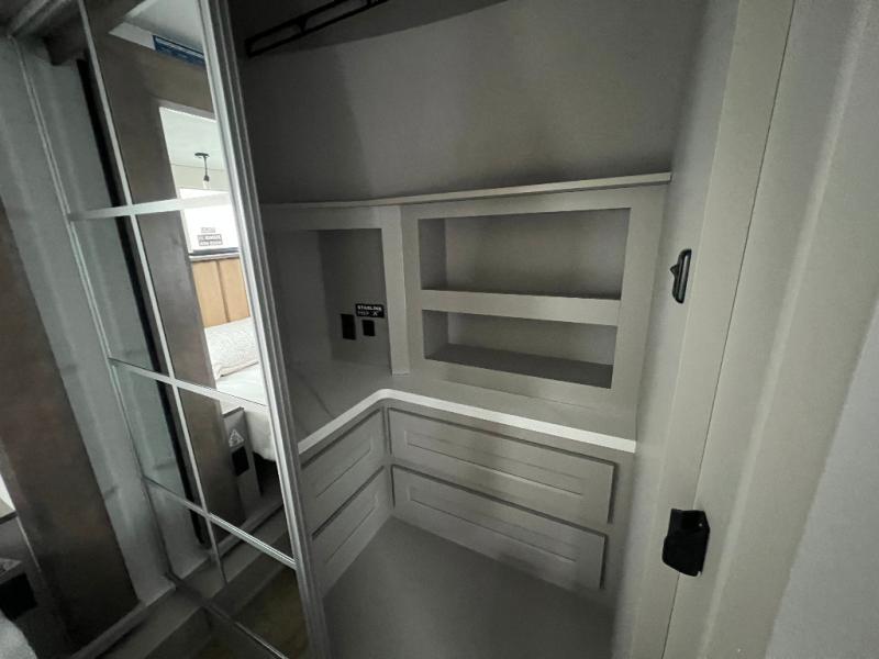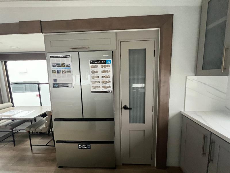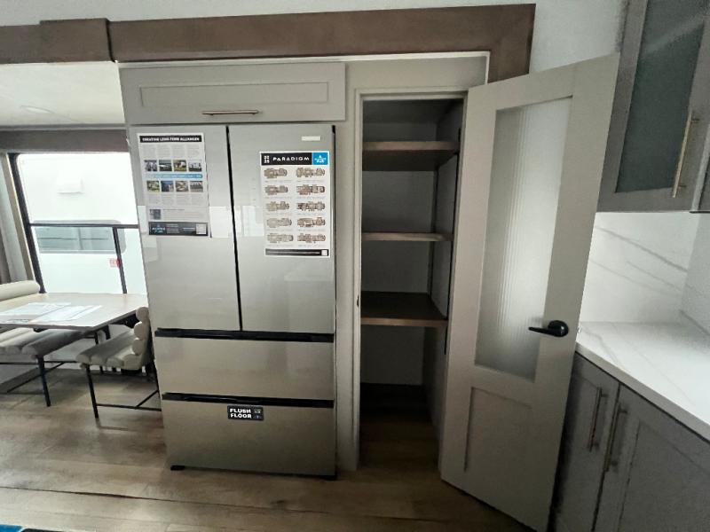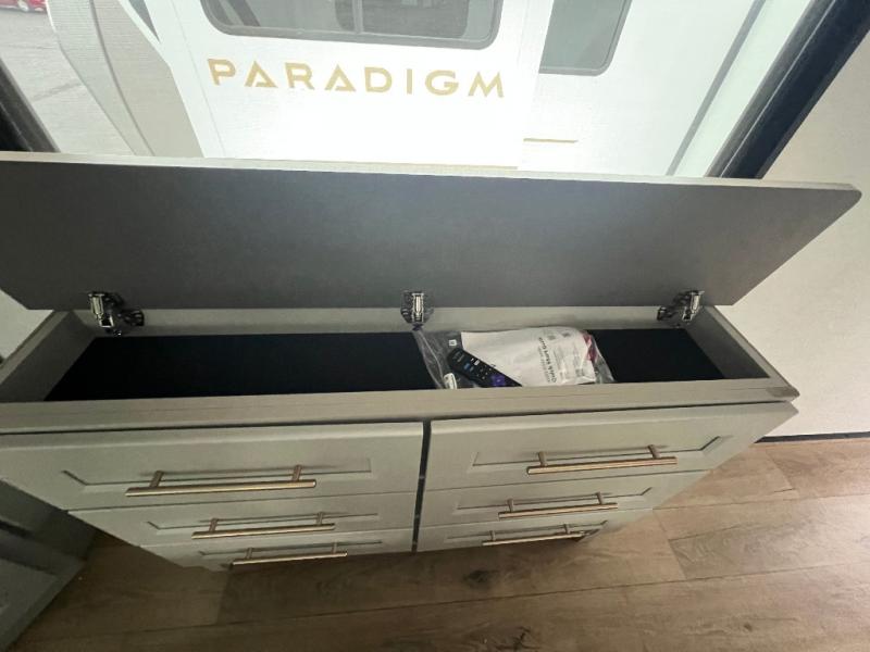 The Paradigm fifth wheels by Alliance RV are functional, high-quality, and luxurious for an unforgettable camping experience. There are three A/C units and a 40K BTU furnace to keep you comfortable year around, and you'll appreciate additional convenient amenities, like the all-in-one enclosed/heated utility center and the color coded and numbered wiring. A Helux Series coil spring pin box comes standard for hassle-free towing, along with Curt 8,000 lb. axles. You'll love the kitchen with its LG solid surface countertops and Lusso range, plus there is LED motion lighting in the pantry and a Maxx fan with a rain sensor to keep everything fresh when making dinner. Each model also includes an HD Smart TV in the living room and bedroom. And of course there are a variety of options you can choose from to further customize your fifth wheel; dual pane windows, Super Solar Plus, slide out awning toppers, and generator prep or a generator to name a few!