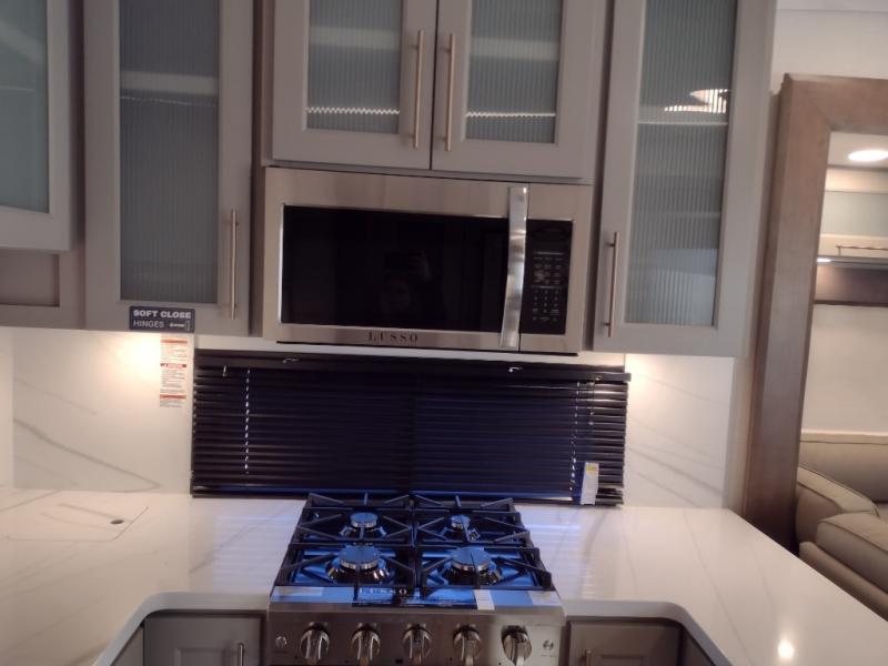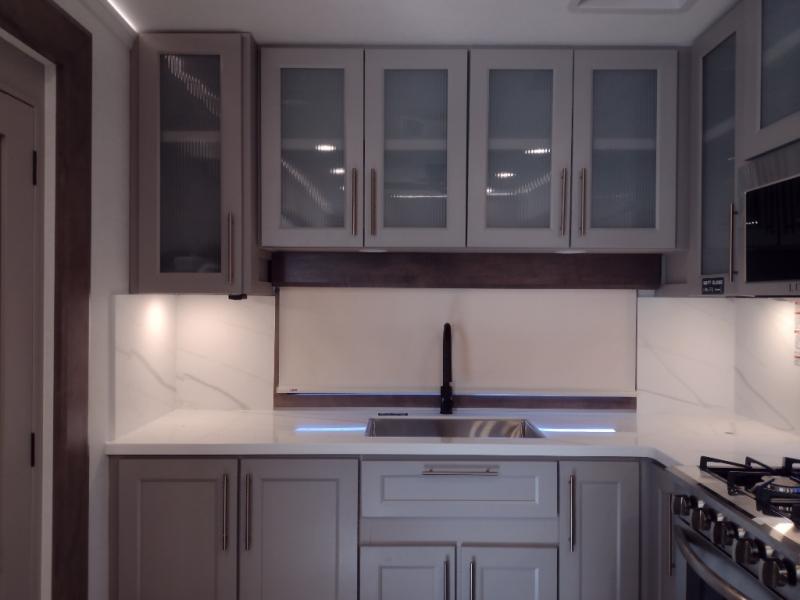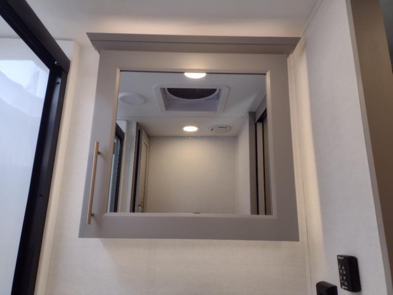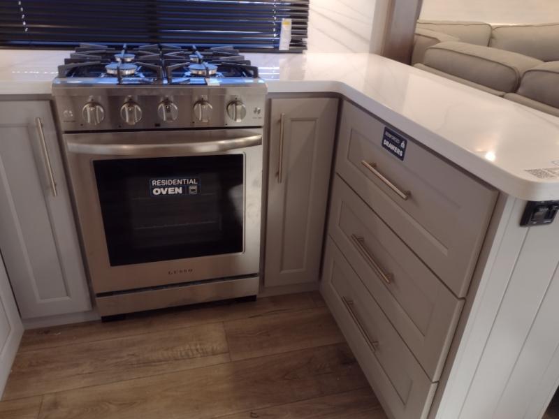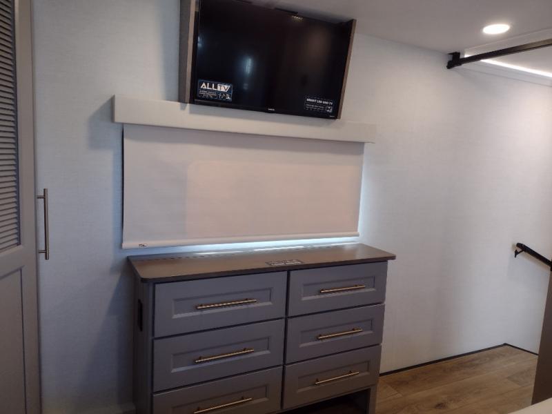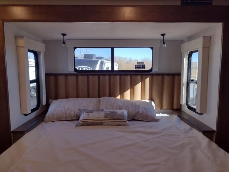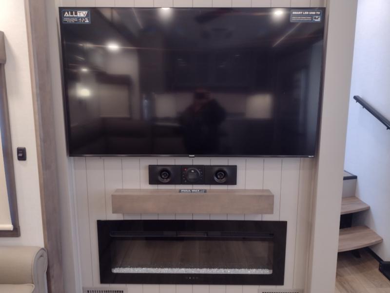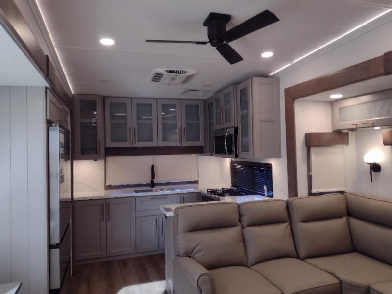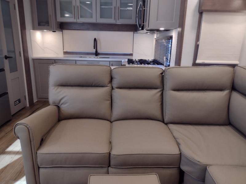 Escape the ordinary and experience the ultimate in luxury travel with this stunning fifth wheel! The rear kitchen is the heart of this fifth wheel, featuring a spacious pantry, 12V refrigerator, microwave, and overhead cabinets. Prepare delicious meals with ease and enjoy the convenience of a fully-equipped kitchen. Unwind in the spacious living area, featuring a plush trifold sofa, L-shape sofa, and a dual recliner love seat. Gather around the turntable dinette or relax in front of the stunning 65” TV. The full bathroom provides a serene space for personal care, while the front bedroom is a peaceful retreat with a comfortable queen bed and a flip-top dresser. Enjoy your favorite shows on the smart TV, perfect for relaxing after a day of adventure.