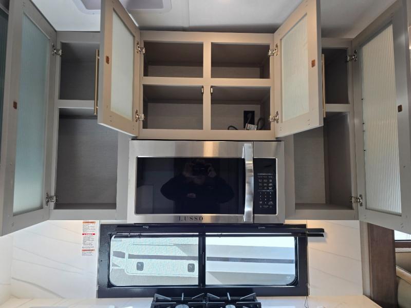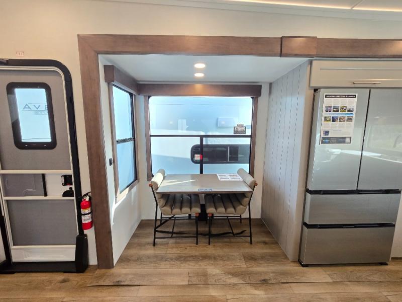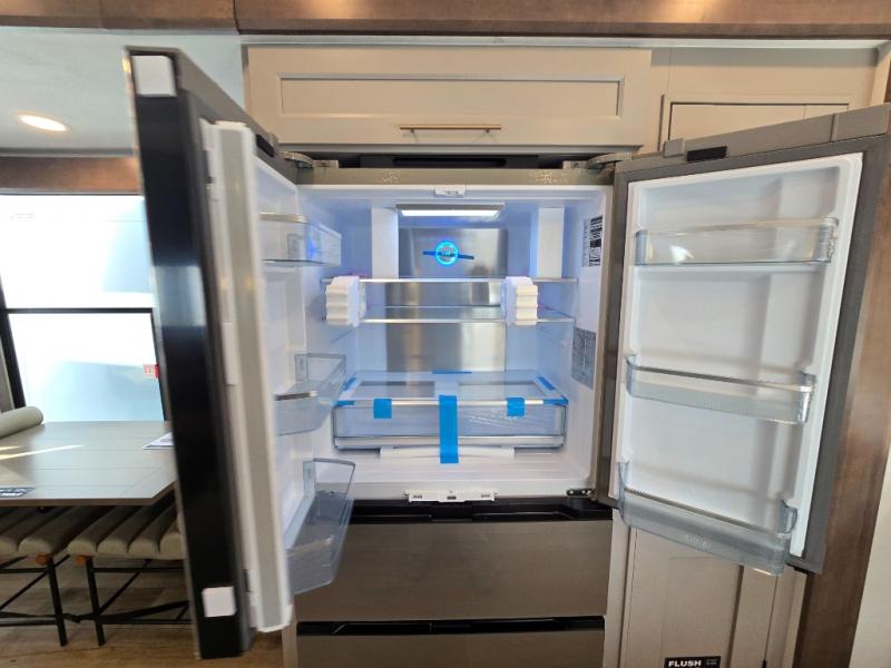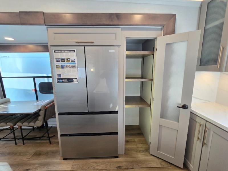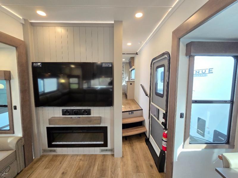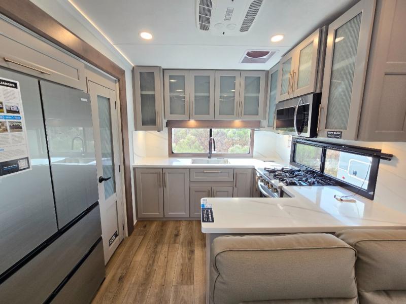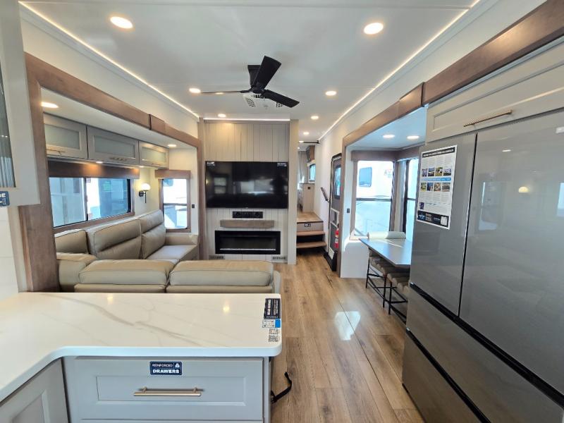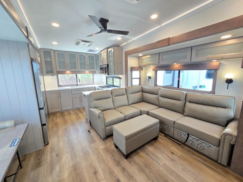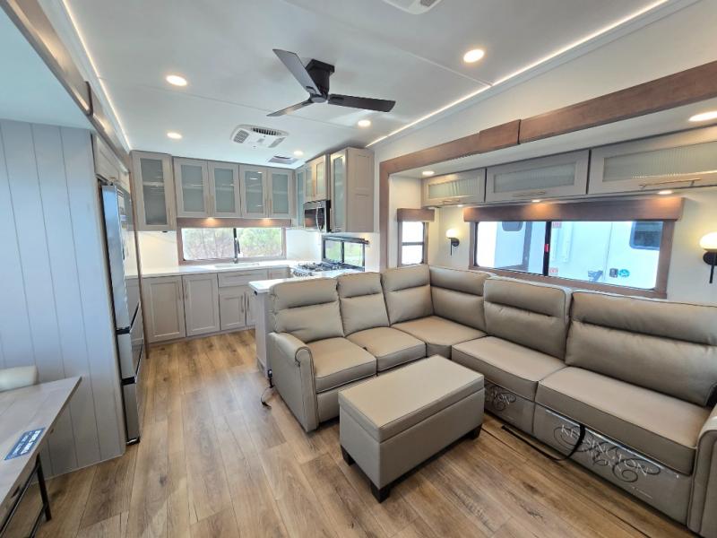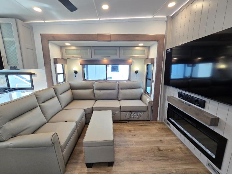 Escape the ordinary and experience the ultimate in luxury travel with this stunning fifth wheel! The rear kitchen is the heart of this fifth wheel, featuring a spacious pantry, 12V refrigerator, microwave, and overhead cabinets. Prepare delicious meals with ease and enjoy the convenience of a fully-equipped kitchen. Unwind in the spacious living area, featuring a plush trifold sofa, L-shape sofa, and a dual recliner love seat. Gather around the turntable dinette or relax in front of the stunning 65” TV. The full bathroom provides a serene space for personal care, while the front bedroom is a peaceful retreat with a comfortable queen bed and a flip-top dresser. Enjoy your favorite shows on the smart TV, perfect for relaxing after a day of adventure.