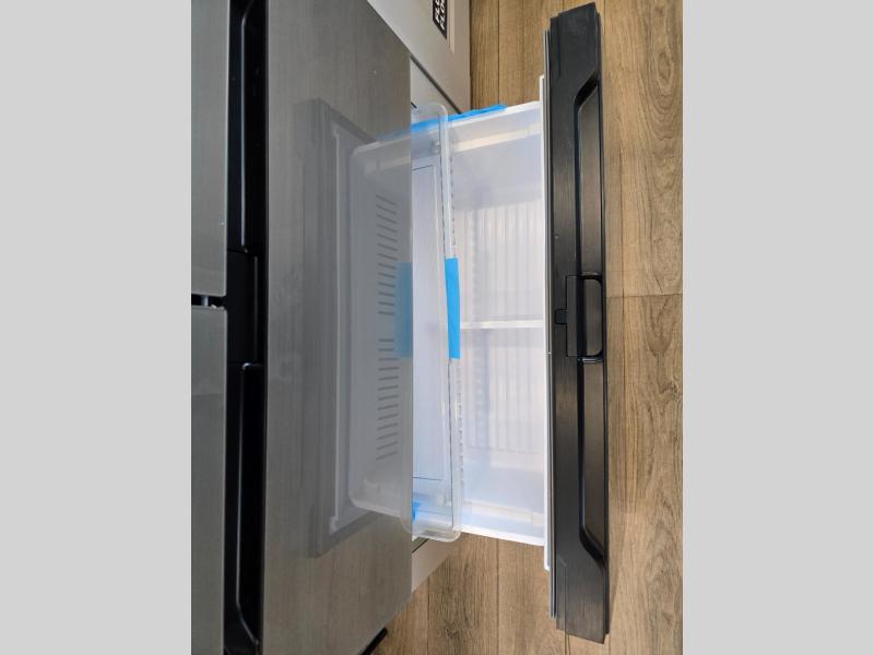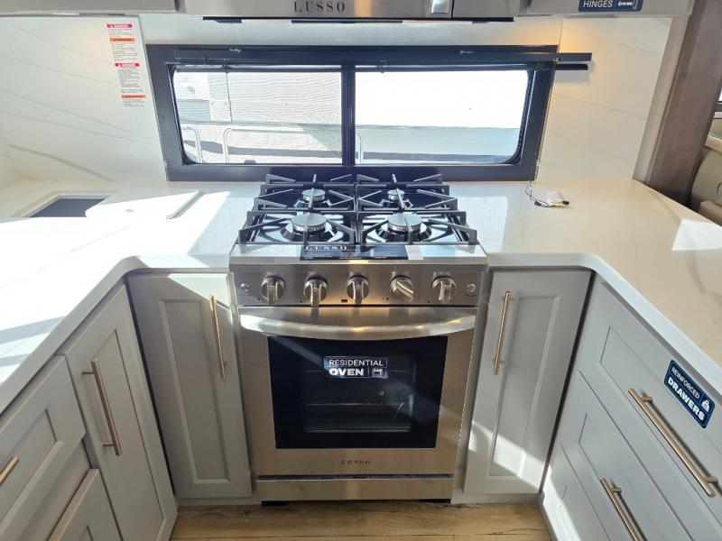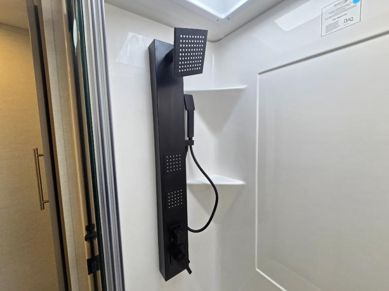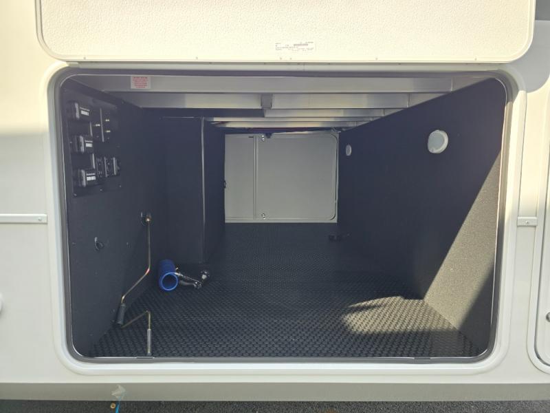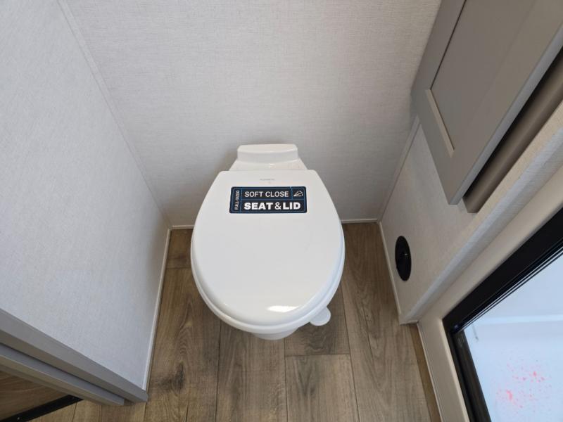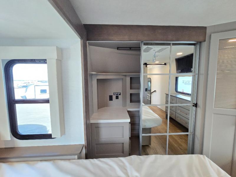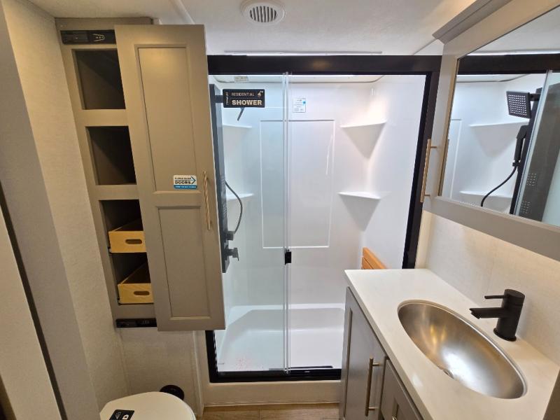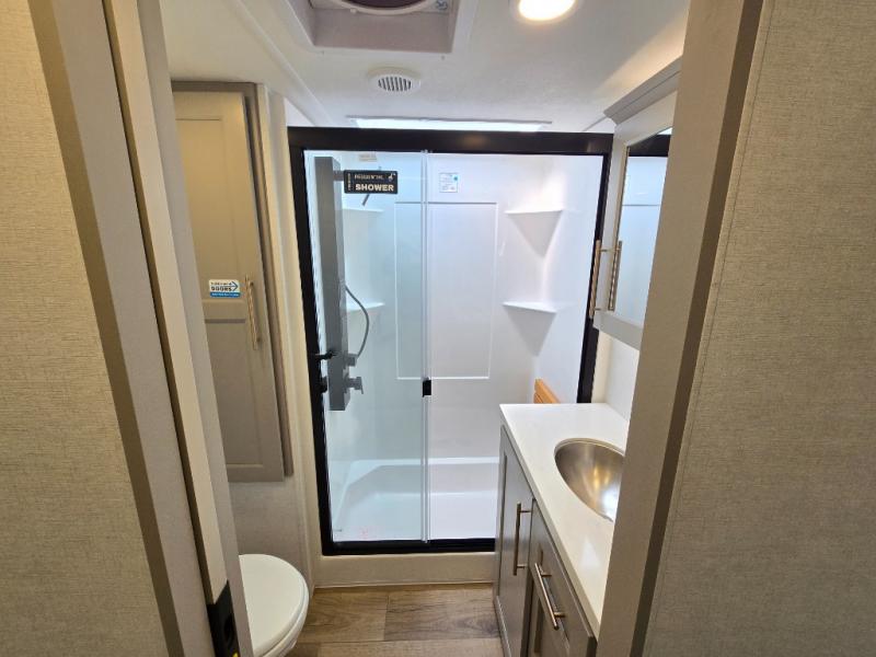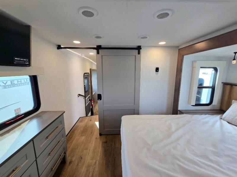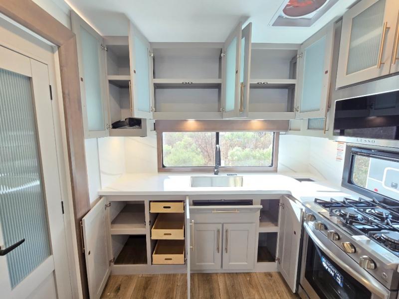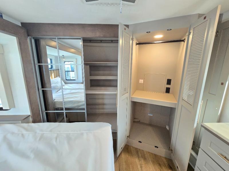 Escape the ordinary and experience the ultimate in luxury travel with this stunning fifth wheel! The rear kitchen is the heart of this fifth wheel, featuring a spacious pantry, 12V refrigerator, microwave, and overhead cabinets. Prepare delicious meals with ease and enjoy the convenience of a fully-equipped kitchen. Unwind in the spacious living area, featuring a plush trifold sofa, L-shape sofa, and a dual recliner love seat. Gather around the turntable dinette or relax in front of the stunning 65” TV. The full bathroom provides a serene space for personal care, while the front bedroom is a peaceful retreat with a comfortable queen bed and a flip-top dresser. Enjoy your favorite shows on the smart TV, perfect for relaxing after a day of adventure.