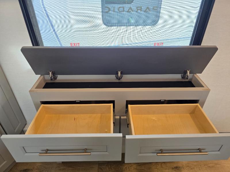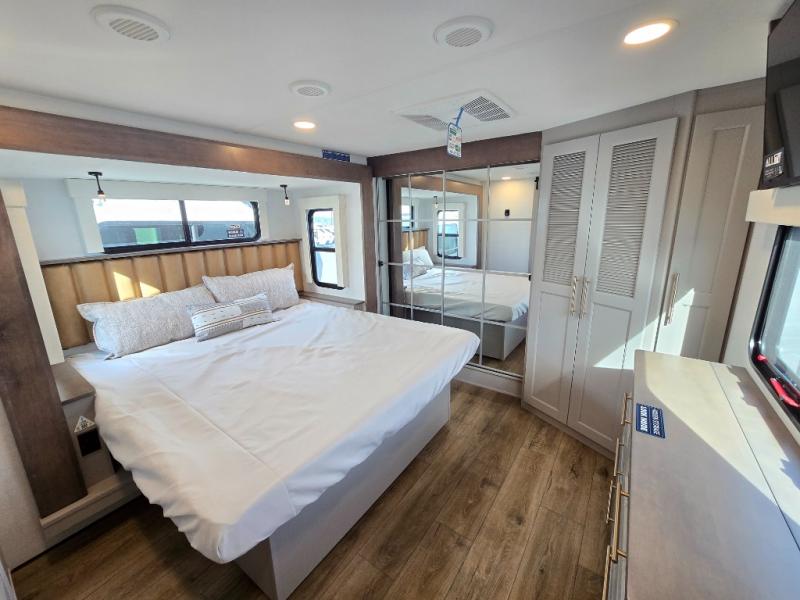 The Paradigm fifth wheels by Alliance RV are functional, high-quality, and luxurious for an unforgettable camping experience. There are three A/C units and a 40K BTU furnace to keep you comfortable year around, and you'll appreciate additional convenient amenities, like the all-in-one enclosed/heated utility center and the color coded and numbered wiring. A Helux Series coil spring pin box comes standard for hassle-free towing, along with Curt 8,000 lb. axles. You'll love the kitchen with its LG solid surface countertops and Lusso range, plus there is LED motion lighting in the pantry and a Maxx fan with a rain sensor to keep everything fresh when making dinner. Each model also includes an HD Smart TV in the living room and bedroom. And of course there are a variety of options you can choose from to further customize your fifth wheel; dual pane windows, Super Solar Plus, slide out awning toppers, and generator prep or a generator to name a few!