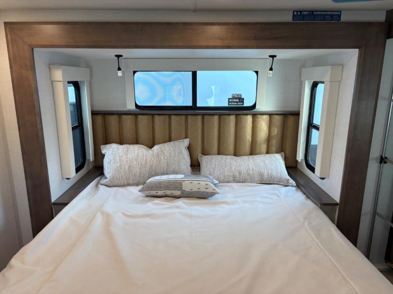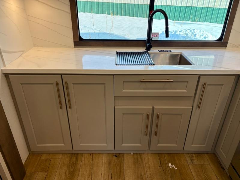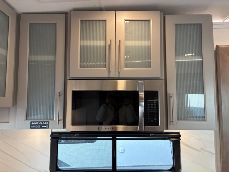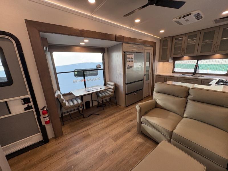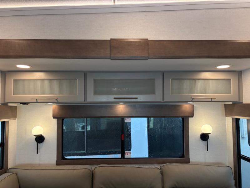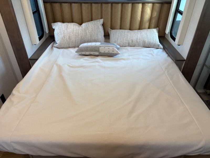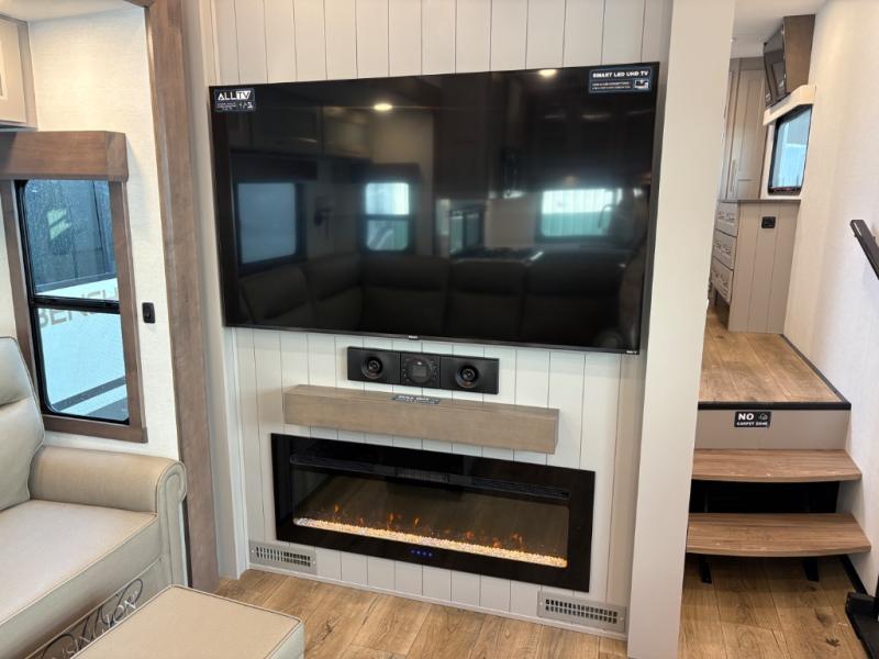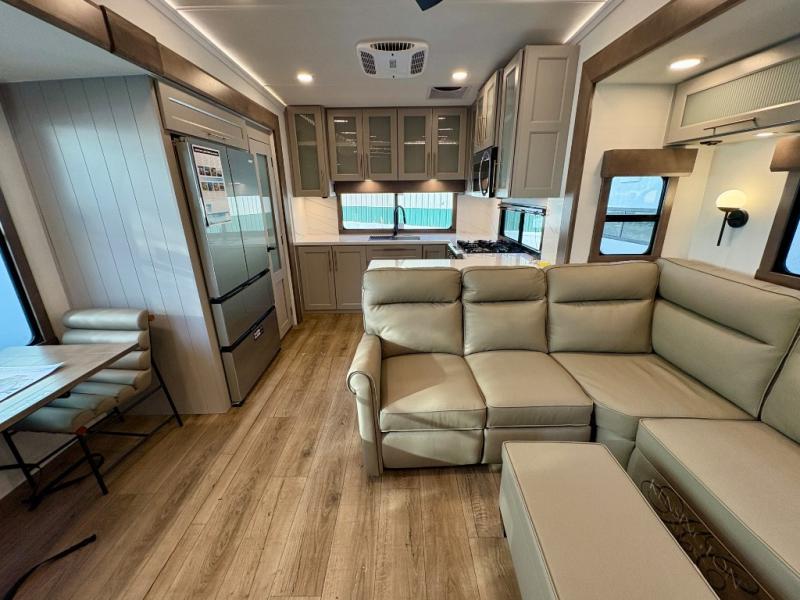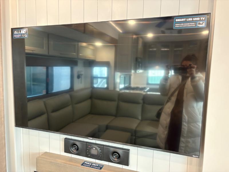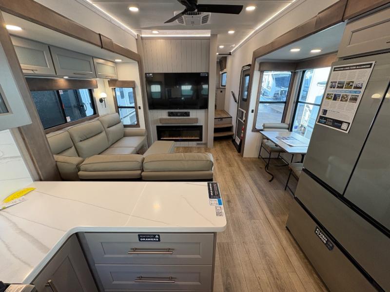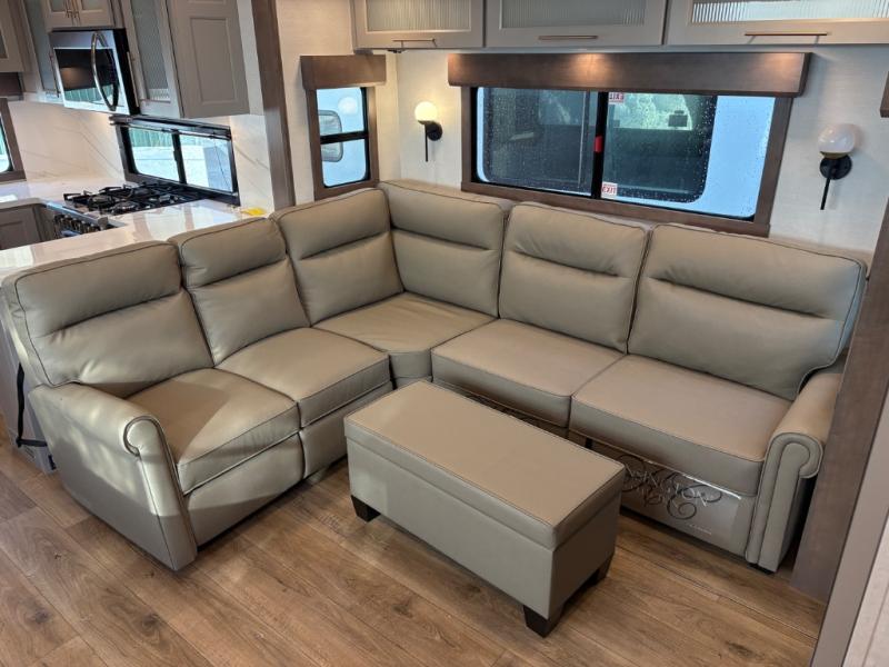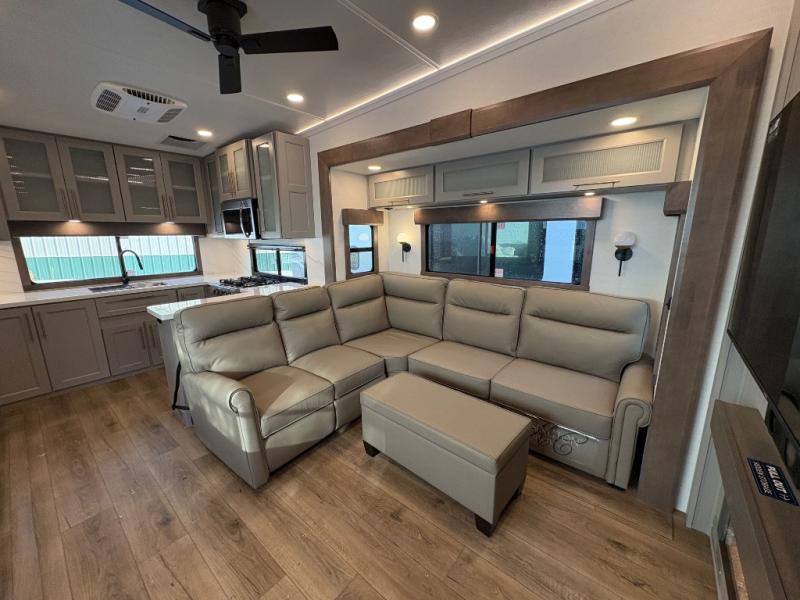 Escape the ordinary and experience the ultimate in luxury travel with this stunning fifth wheel! The rear kitchen is the heart of this fifth wheel, featuring a spacious pantry, 12V refrigerator, microwave, and overhead cabinets. Prepare delicious meals with ease and enjoy the convenience of a fully-equipped kitchen. Unwind in the spacious living area, featuring a plush trifold sofa, L-shape sofa, and a dual recliner love seat. Gather around the turntable dinette or relax in front of the stunning 65” TV. The full bathroom provides a serene space for personal care, while the front bedroom is a peaceful retreat with a comfortable queen bed and a flip-top dresser. Enjoy your favorite shows on the smart TV, perfect for relaxing after a day of adventure.