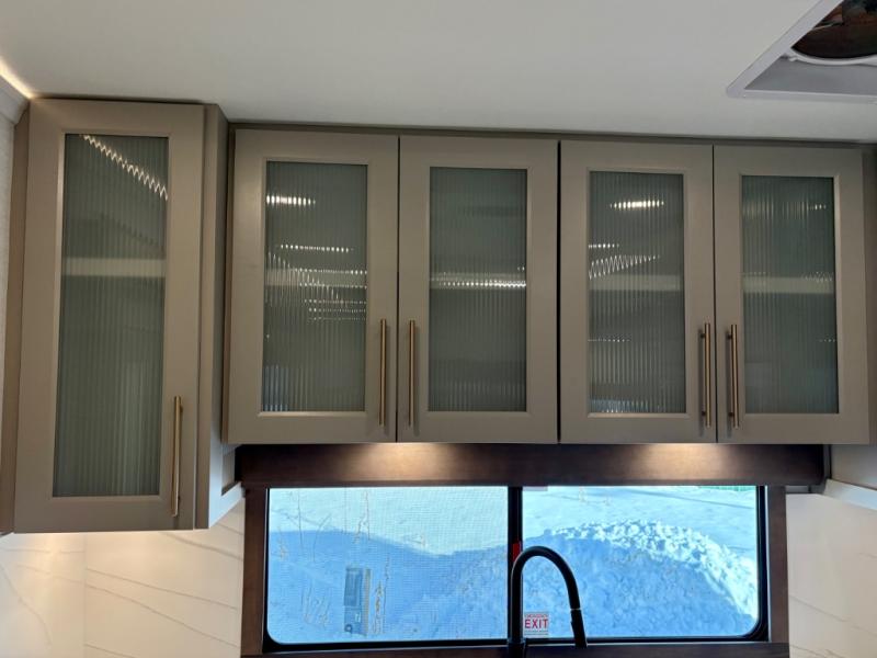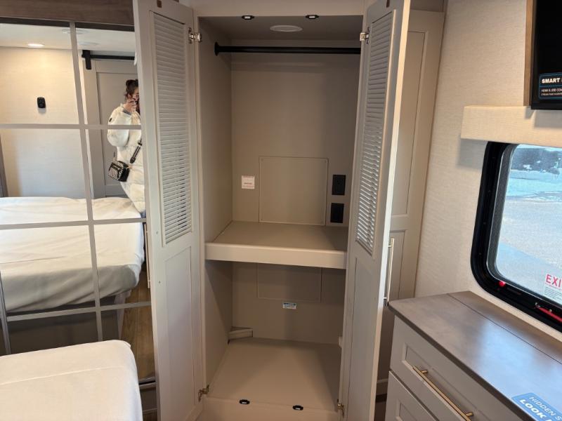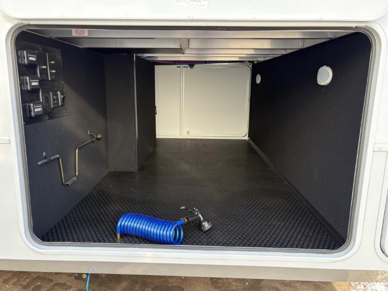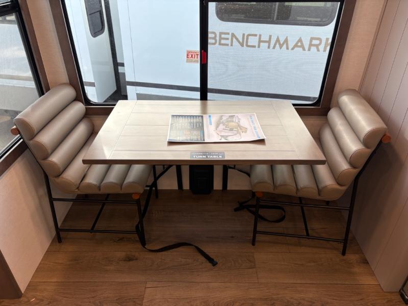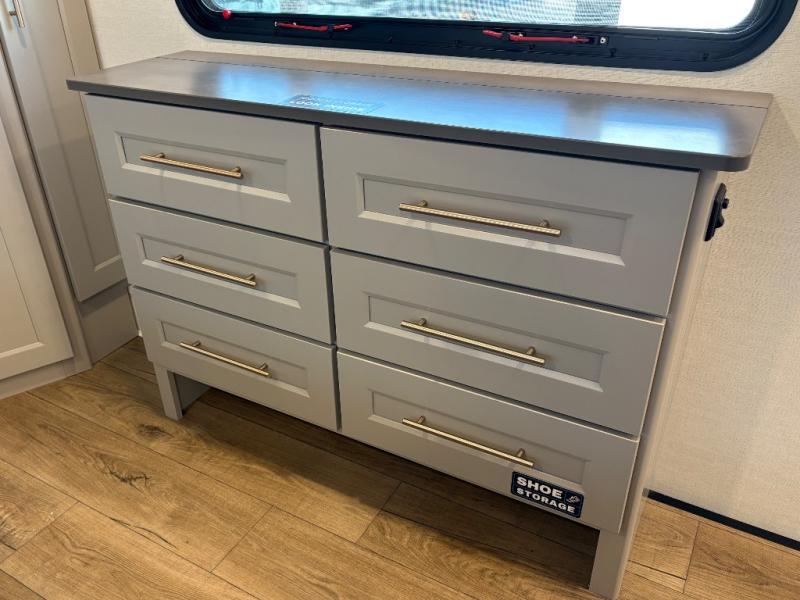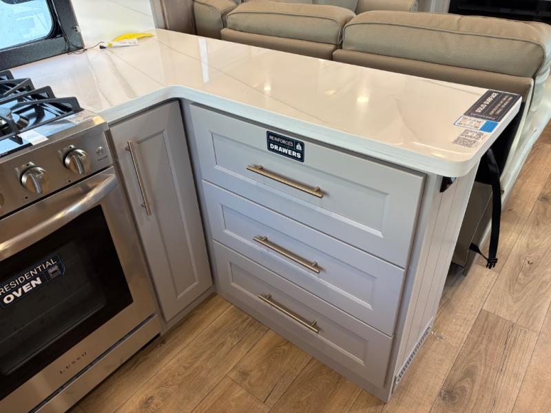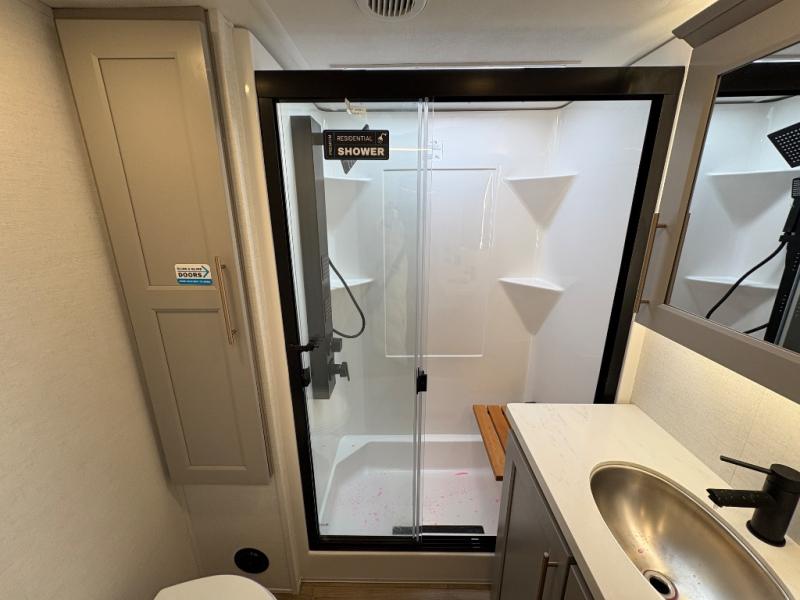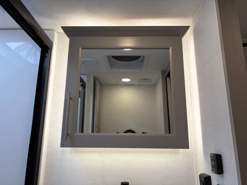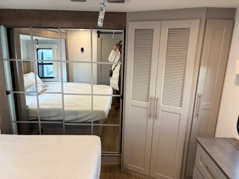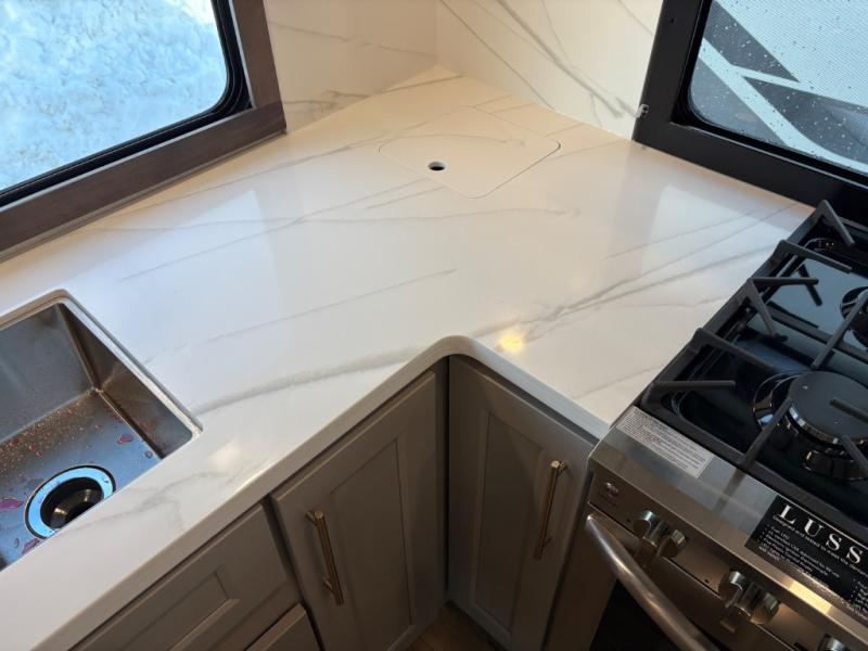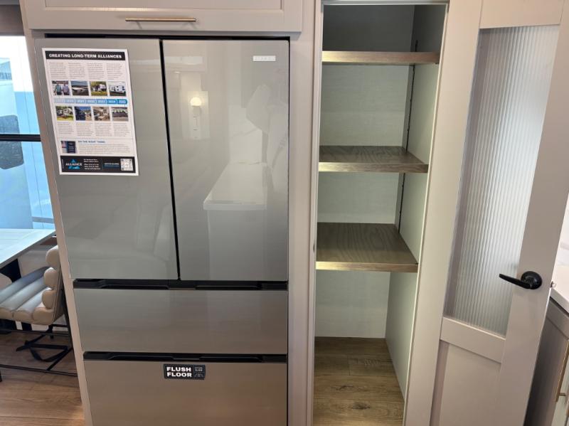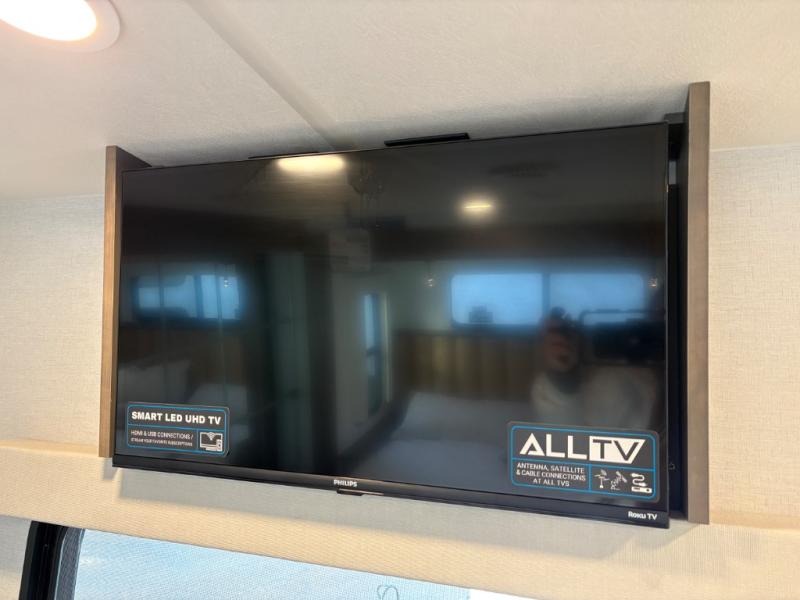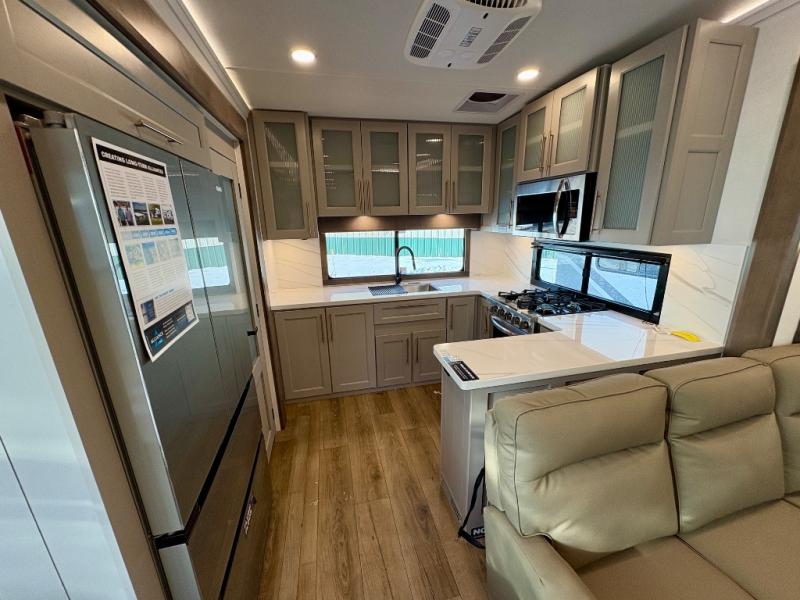 Escape the ordinary and experience the ultimate in luxury travel with this stunning fifth wheel! The rear kitchen is the heart of this fifth wheel, featuring a spacious pantry, 12V refrigerator, microwave, and overhead cabinets. Prepare delicious meals with ease and enjoy the convenience of a fully-equipped kitchen. Unwind in the spacious living area, featuring a plush trifold sofa, L-shape sofa, and a dual recliner love seat. Gather around the turntable dinette or relax in front of the stunning 65” TV. The full bathroom provides a serene space for personal care, while the front bedroom is a peaceful retreat with a comfortable queen bed and a flip-top dresser. Enjoy your favorite shows on the smart TV, perfect for relaxing after a day of adventure.