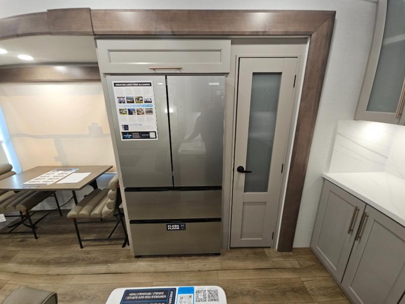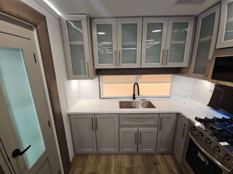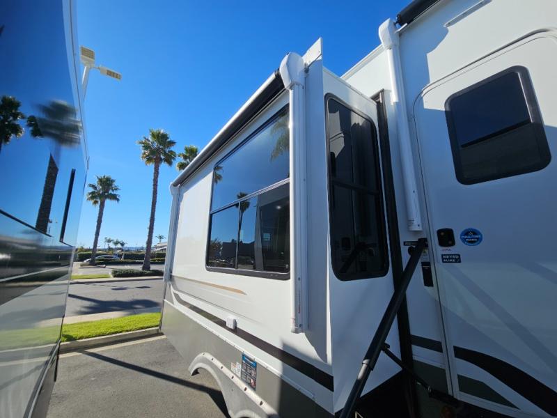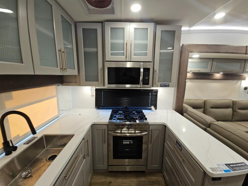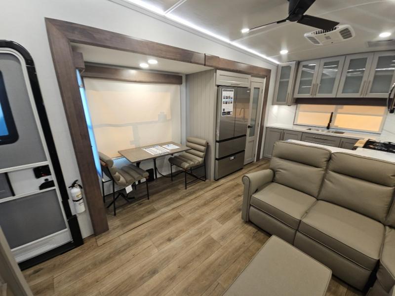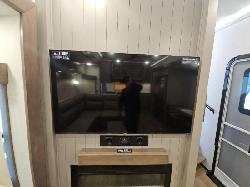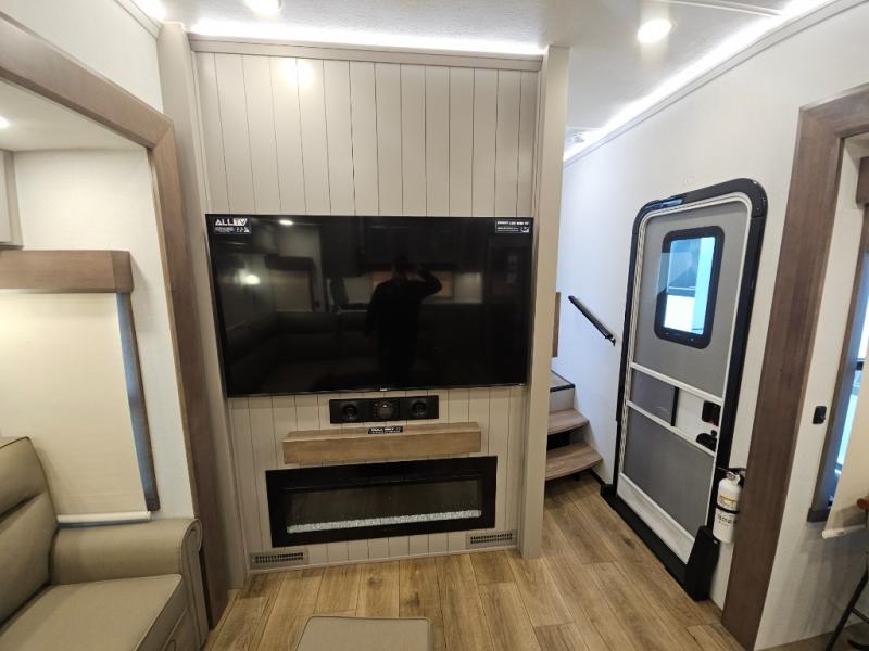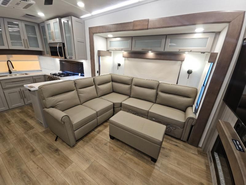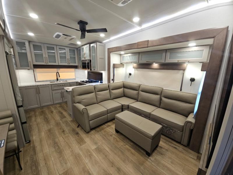 Escape the ordinary and experience the ultimate in luxury travel with this stunning fifth wheel! The rear kitchen is the heart of this fifth wheel, featuring a spacious pantry, 12V refrigerator, microwave, and overhead cabinets. Prepare delicious meals with ease and enjoy the convenience of a fully-equipped kitchen. Unwind in the spacious living area, featuring a plush trifold sofa, L-shape sofa, and a dual recliner love seat. Gather around the turntable dinette or relax in front of the stunning 65” TV. The full bathroom provides a serene space for personal care, while the front bedroom is a peaceful retreat with a comfortable queen bed and a flip-top dresser. Enjoy your favorite shows on the smart TV, perfect for relaxing after a day of adventure.