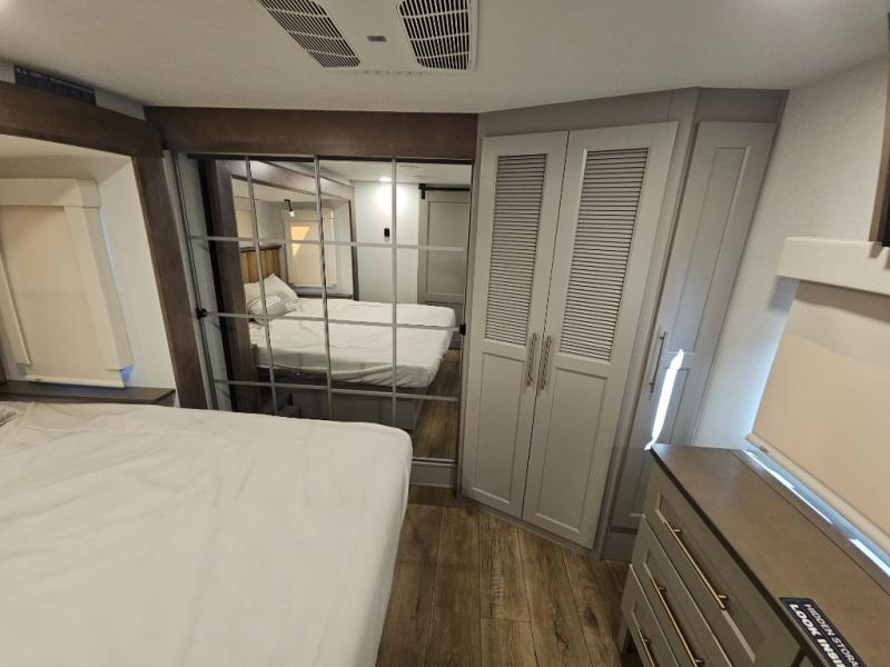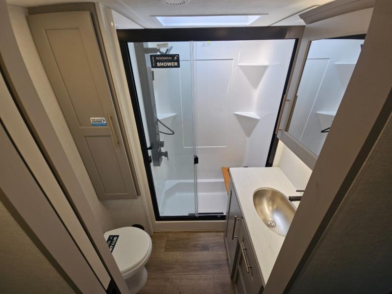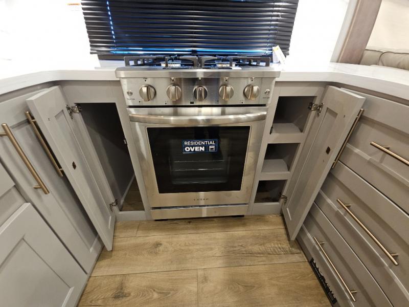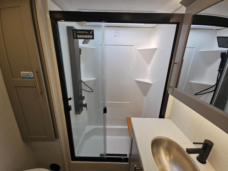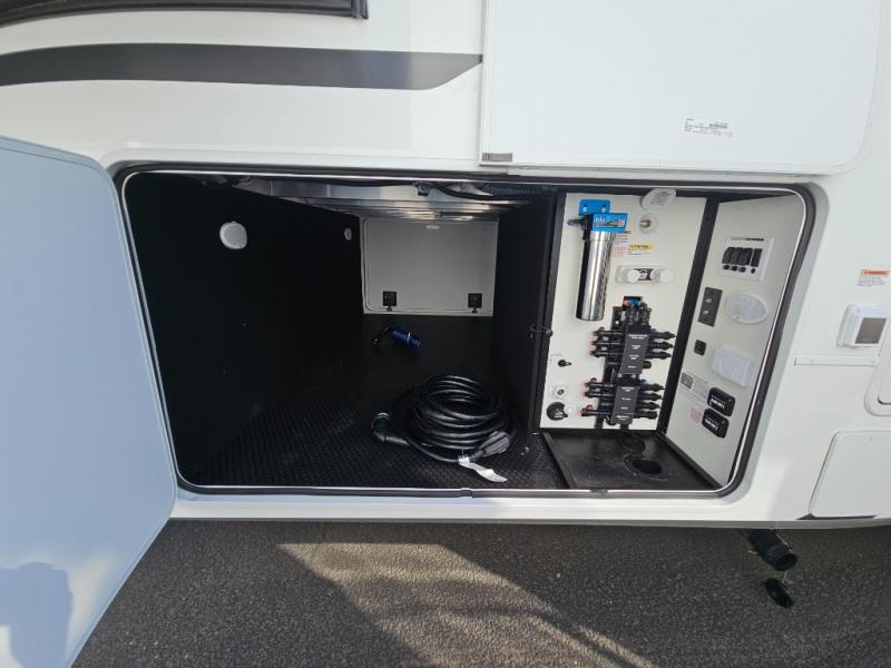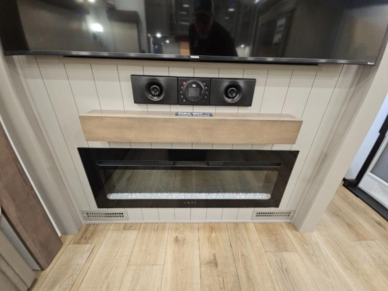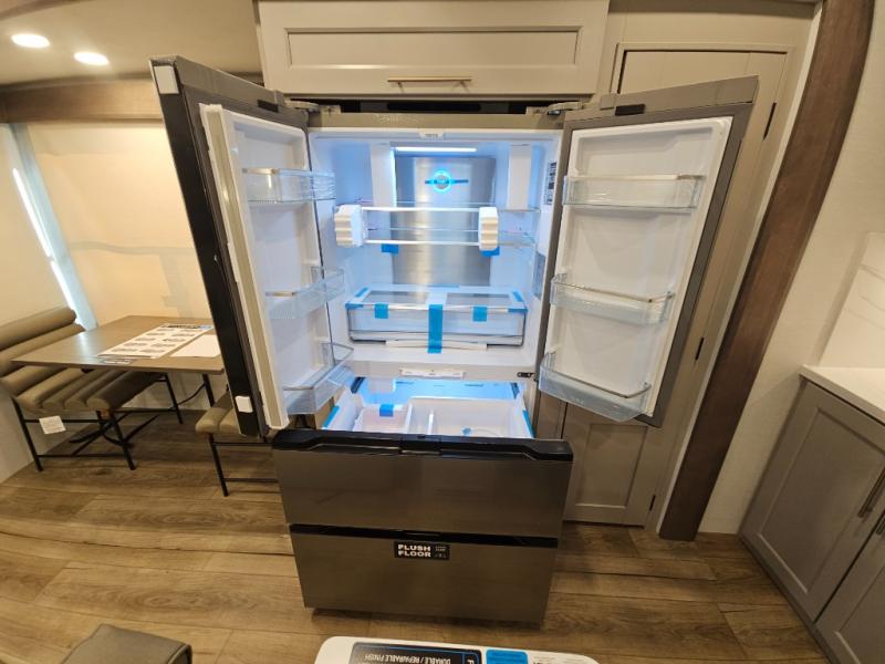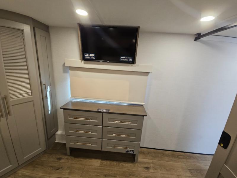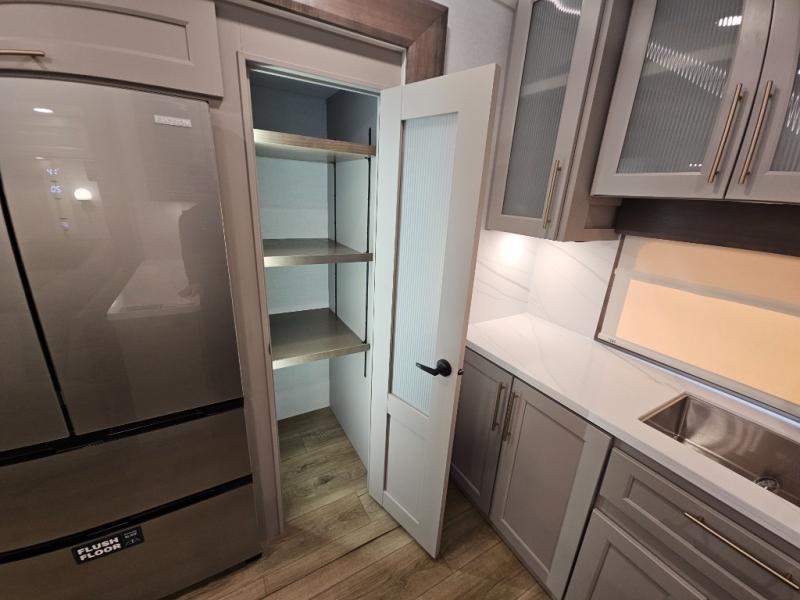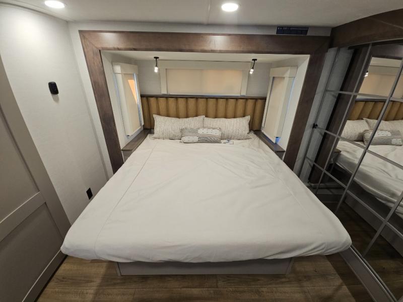 Escape the ordinary and experience the ultimate in luxury travel with this stunning fifth wheel! The rear kitchen is the heart of this fifth wheel, featuring a spacious pantry, 12V refrigerator, microwave, and overhead cabinets. Prepare delicious meals with ease and enjoy the convenience of a fully-equipped kitchen. Unwind in the spacious living area, featuring a plush trifold sofa, L-shape sofa, and a dual recliner love seat. Gather around the turntable dinette or relax in front of the stunning 65” TV. The full bathroom provides a serene space for personal care, while the front bedroom is a peaceful retreat with a comfortable queen bed and a flip-top dresser. Enjoy your favorite shows on the smart TV, perfect for relaxing after a day of adventure.