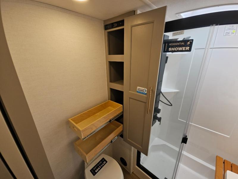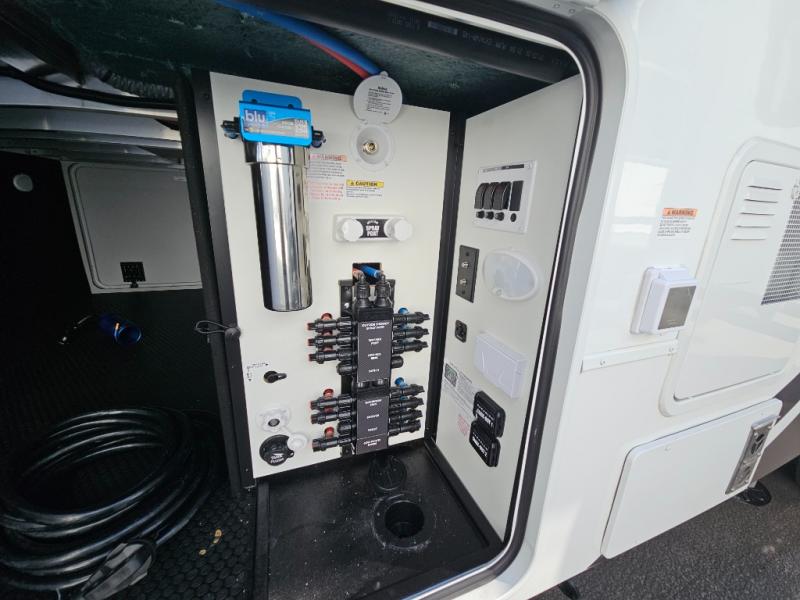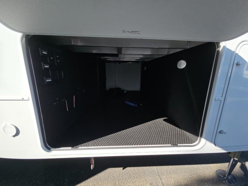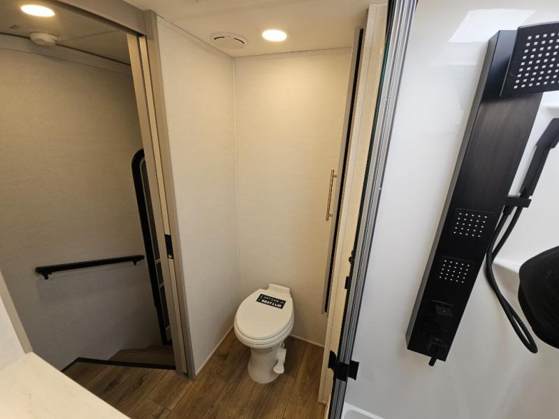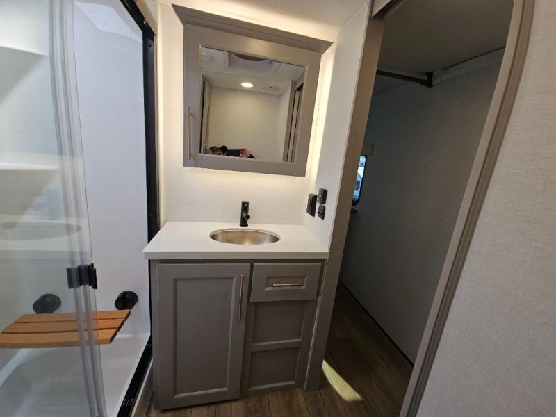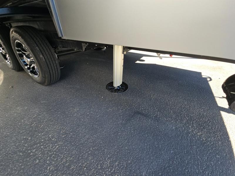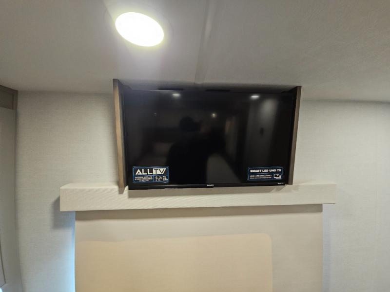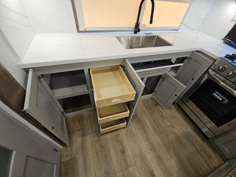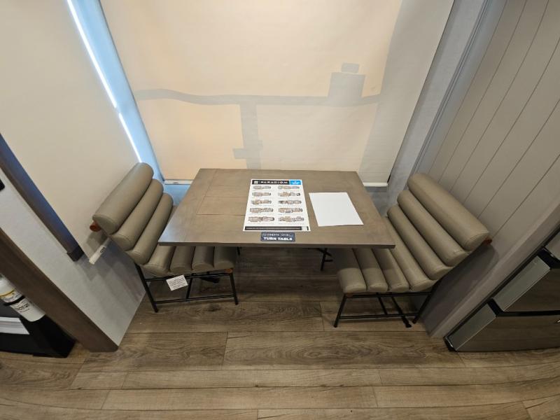 Escape the ordinary and experience the ultimate in luxury travel with this stunning fifth wheel! The rear kitchen is the heart of this fifth wheel, featuring a spacious pantry, 12V refrigerator, microwave, and overhead cabinets. Prepare delicious meals with ease and enjoy the convenience of a fully-equipped kitchen. Unwind in the spacious living area, featuring a plush trifold sofa, L-shape sofa, and a dual recliner love seat. Gather around the turntable dinette or relax in front of the stunning 65” TV. The full bathroom provides a serene space for personal care, while the front bedroom is a peaceful retreat with a comfortable queen bed and a flip-top dresser. Enjoy your favorite shows on the smart TV, perfect for relaxing after a day of adventure.