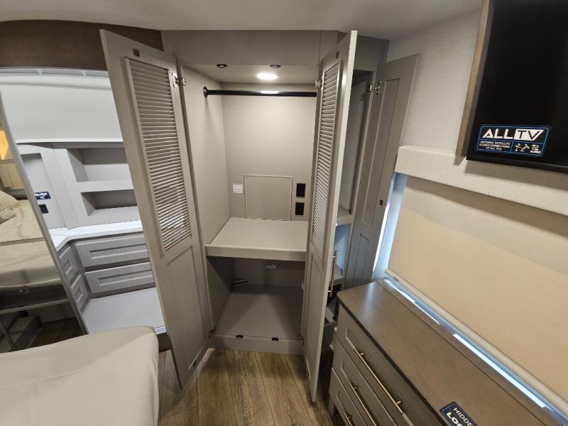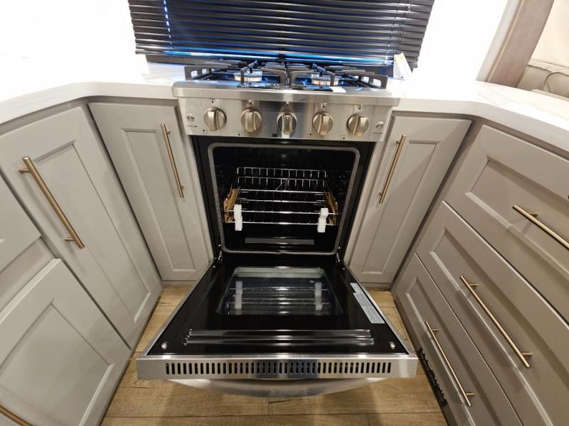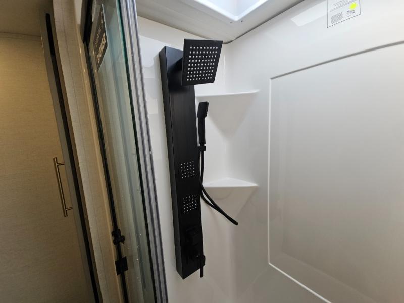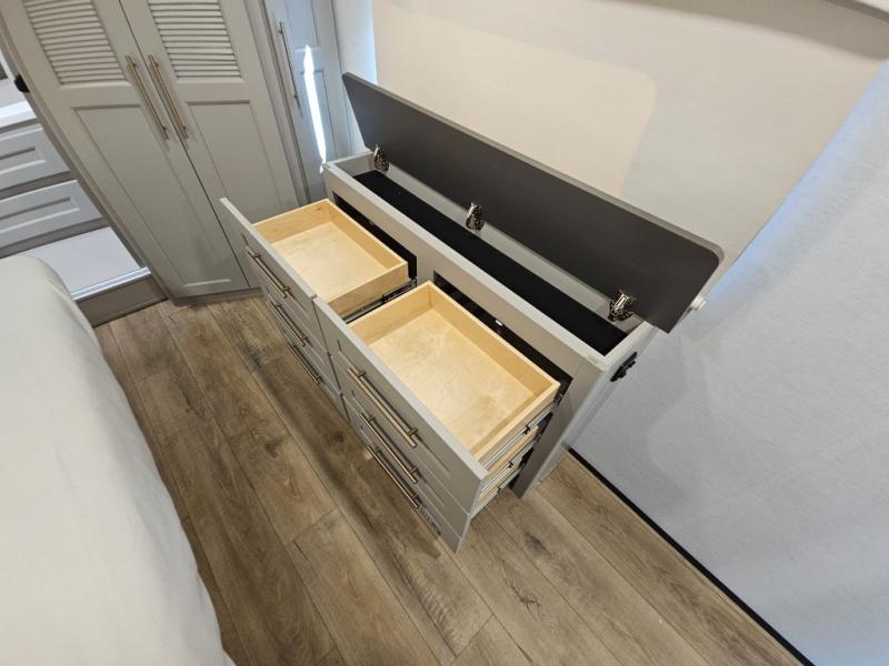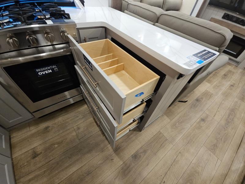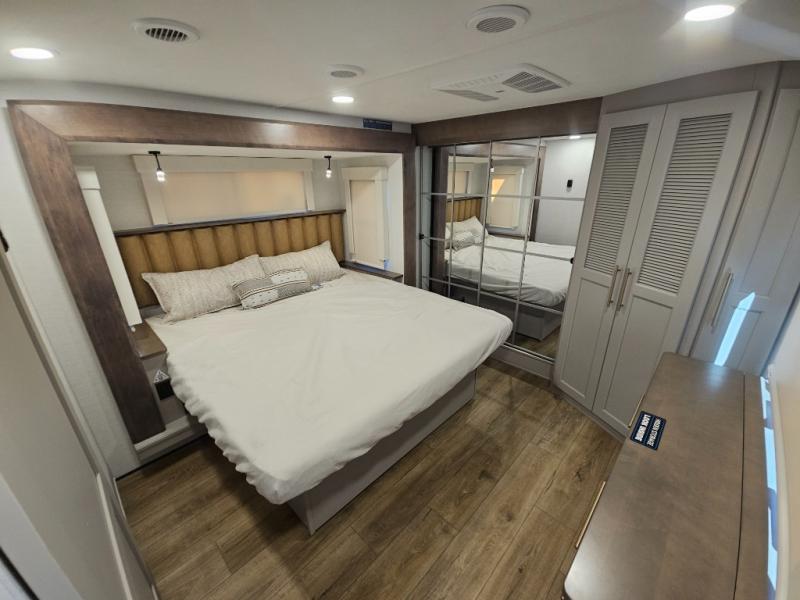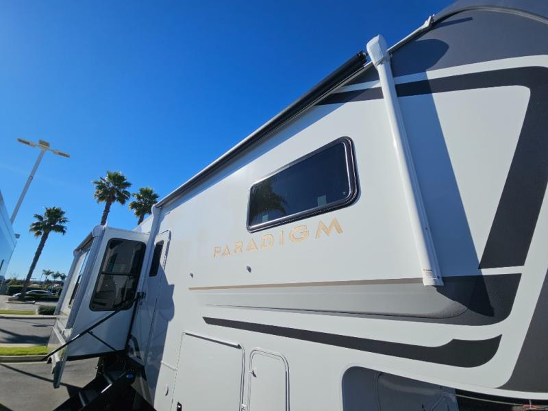 The Paradigm fifth wheels by Alliance RV are functional, high-quality, and luxurious for an unforgettable camping experience. There are three A/C units and a 40K BTU furnace to keep you comfortable year around, and you'll appreciate additional convenient amenities, like the all-in-one enclosed/heated utility center and the color coded and numbered wiring. A Helux Series coil spring pin box comes standard for hassle-free towing, along with Curt 8,000 lb. axles. You'll love the kitchen with its LG solid surface countertops and Lusso range, plus there is LED motion lighting in the pantry and a Maxx fan with a rain sensor to keep everything fresh when making dinner. Each model also includes an HD Smart TV in the living room and bedroom. And of course there are a variety of options you can choose from to further customize your fifth wheel; dual pane windows, Super Solar Plus, slide out awning toppers, and generator prep or a generator to name a few!