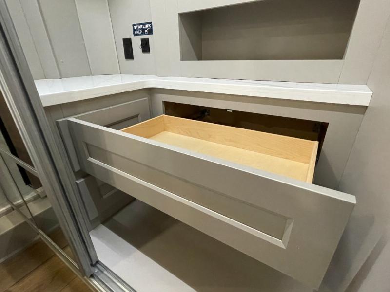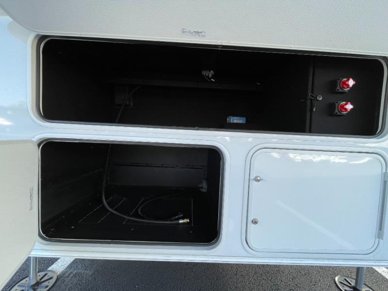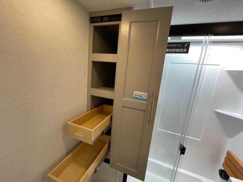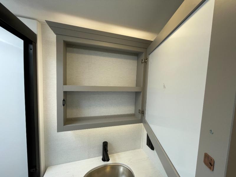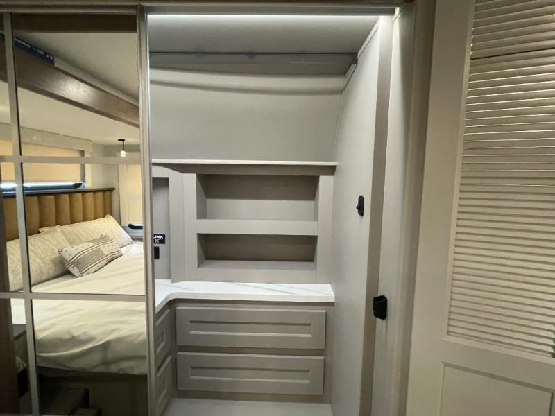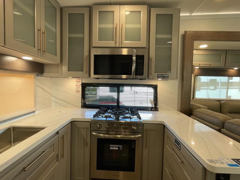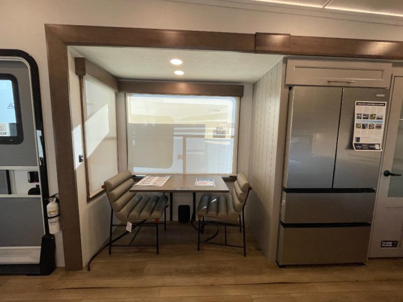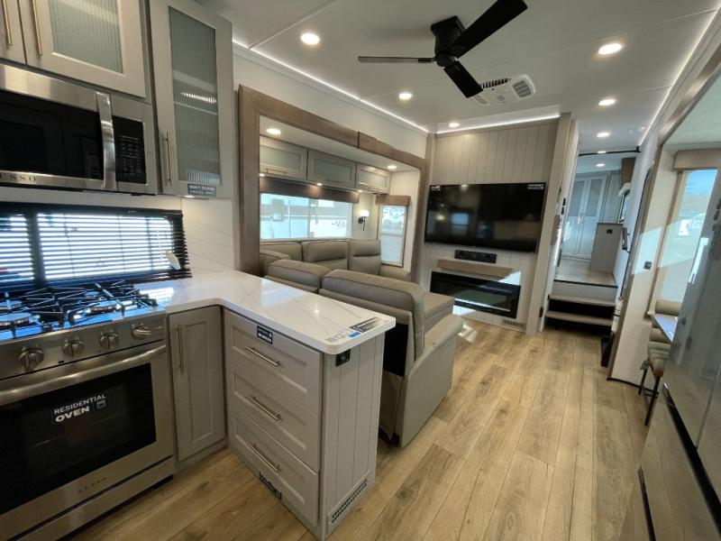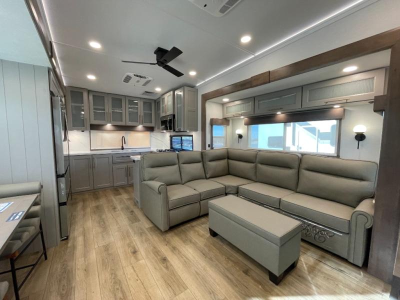 Escape the ordinary and experience the ultimate in luxury travel with this stunning fifth wheel! The rear kitchen is the heart of this fifth wheel, featuring a spacious pantry, 12V refrigerator, microwave, and overhead cabinets. Prepare delicious meals with ease and enjoy the convenience of a fully-equipped kitchen. Unwind in the spacious living area, featuring a plush trifold sofa, L-shape sofa, and a dual recliner love seat. Gather around the turntable dinette or relax in front of the stunning 65” TV. The full bathroom provides a serene space for personal care, while the front bedroom is a peaceful retreat with a comfortable queen bed and a flip-top dresser. Enjoy your favorite shows on the smart TV, perfect for relaxing after a day of adventure.