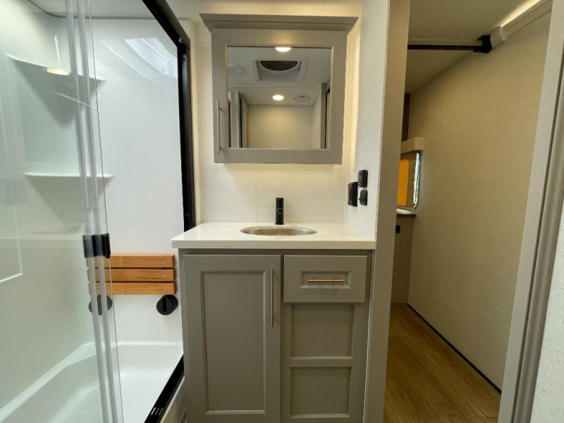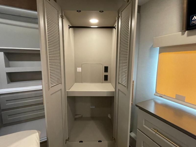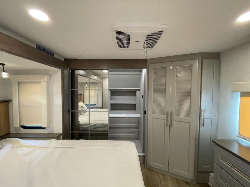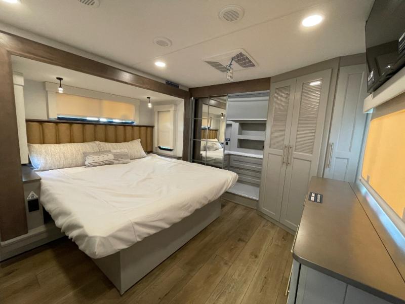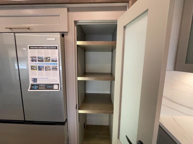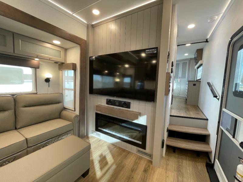 The Paradigm fifth wheels by Alliance RV are functional, high-quality, and luxurious for an unforgettable camping experience. There are three A/C units and a 40K BTU furnace to keep you comfortable year around, and you'll appreciate additional convenient amenities, like the all-in-one enclosed/heated utility center and the color coded and numbered wiring. A Helux Series coil spring pin box comes standard for hassle-free towing, along with Curt 8,000 lb. axles. You'll love the kitchen with its LG solid surface countertops and Lusso range, plus there is LED motion lighting in the pantry and a Maxx fan with a rain sensor to keep everything fresh when making dinner. Each model also includes an HD Smart TV in the living room and bedroom. And of course there are a variety of options you can choose from to further customize your fifth wheel; dual pane windows, Super Solar Plus, slide out awning toppers, and generator prep or a generator to name a few!