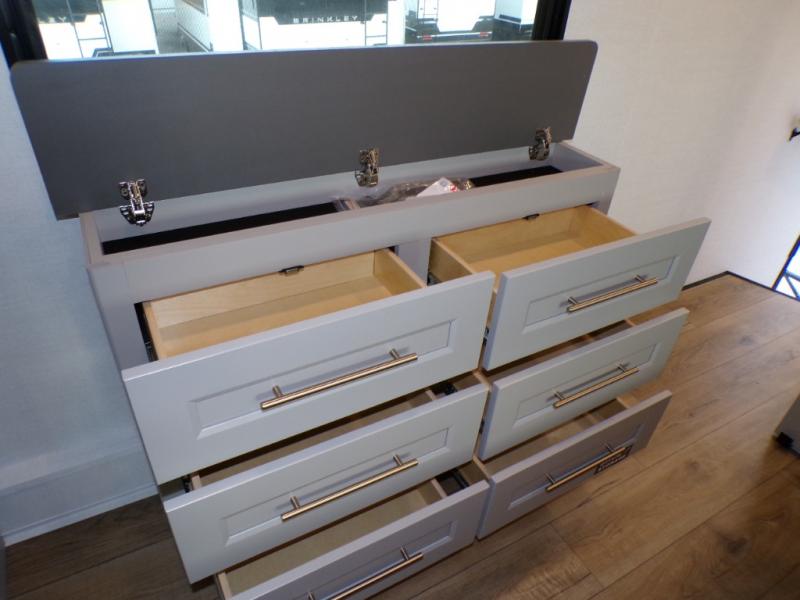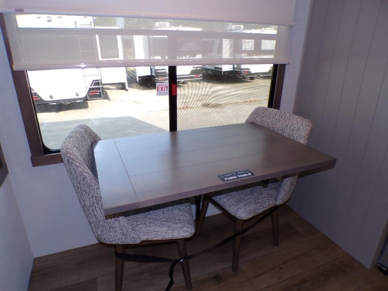 Escape the ordinary and experience the ultimate in luxury travel with this stunning fifth wheel! The rear kitchen is the heart of this fifth wheel, featuring a spacious pantry, 12V refrigerator, microwave, and overhead cabinets. Prepare delicious meals with ease and enjoy the convenience of a fully-equipped kitchen. Unwind in the spacious living area, featuring a plush trifold sofa, L-shape sofa, and a dual recliner love seat. Gather around the turntable dinette or relax in front of the stunning 65” TV. The full bathroom provides a serene space for personal care, while the front bedroom is a peaceful retreat with a comfortable queen bed and a flip-top dresser. Enjoy your favorite shows on the smart TV, perfect for relaxing after a day of adventure.