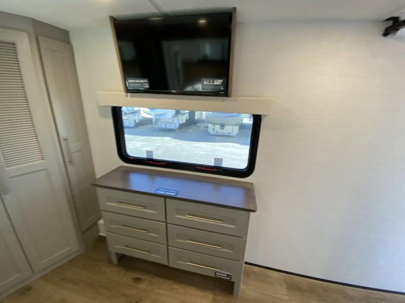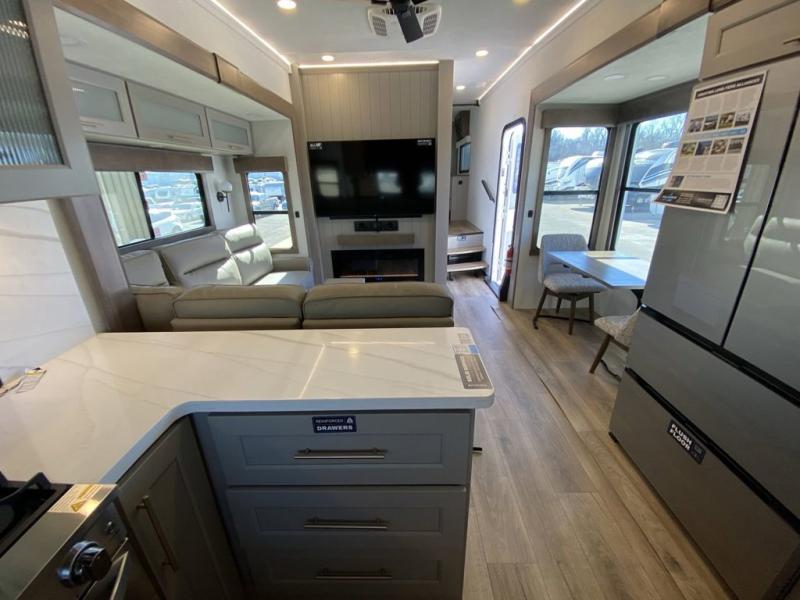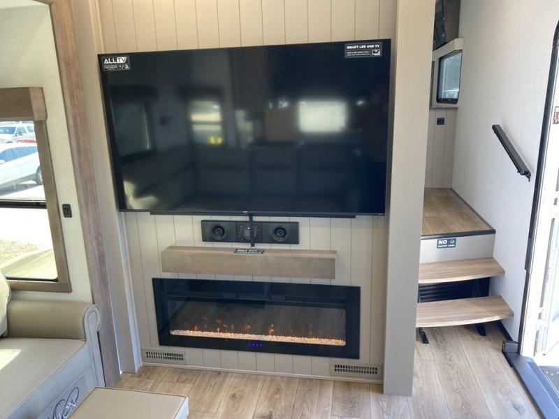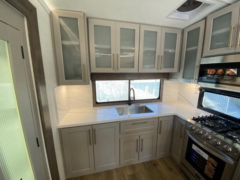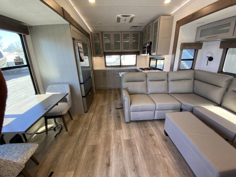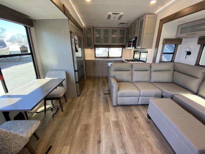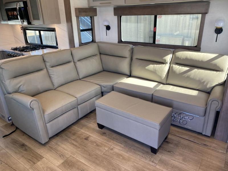 Escape the ordinary and experience the ultimate in luxury travel with this stunning fifth wheel! The rear kitchen is the heart of this fifth wheel, featuring a spacious pantry, 12V refrigerator, microwave, and overhead cabinets. Prepare delicious meals with ease and enjoy the convenience of a fully-equipped kitchen. Unwind in the spacious living area, featuring a plush trifold sofa, L-shape sofa, and a dual recliner love seat. Gather around the turntable dinette or relax in front of the stunning 65” TV. The full bathroom provides a serene space for personal care, while the front bedroom is a peaceful retreat with a comfortable queen bed and a flip-top dresser. Enjoy your favorite shows on the smart TV, perfect for relaxing after a day of adventure.