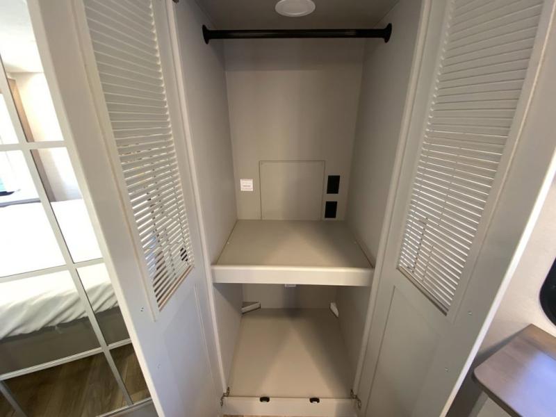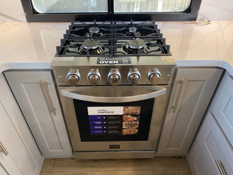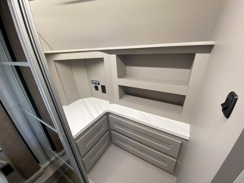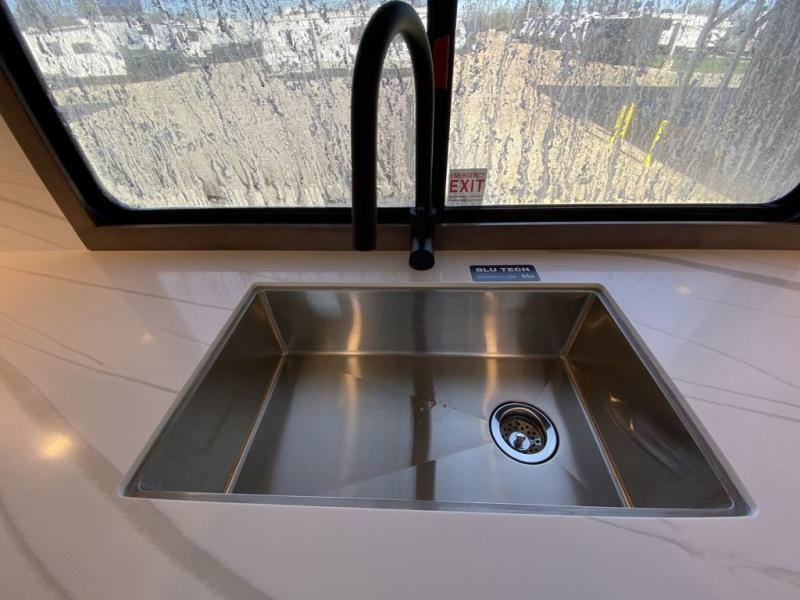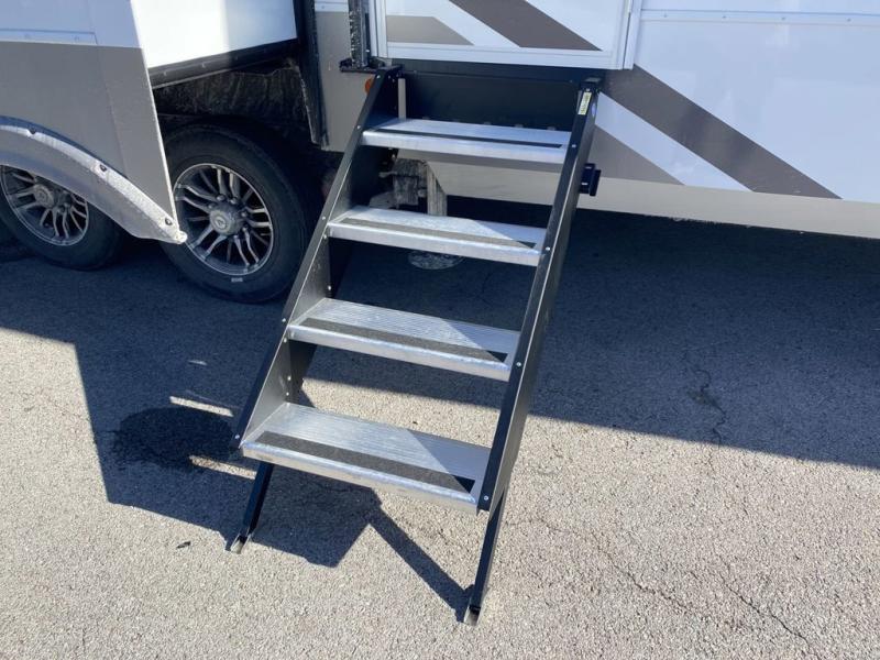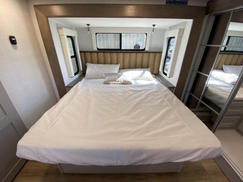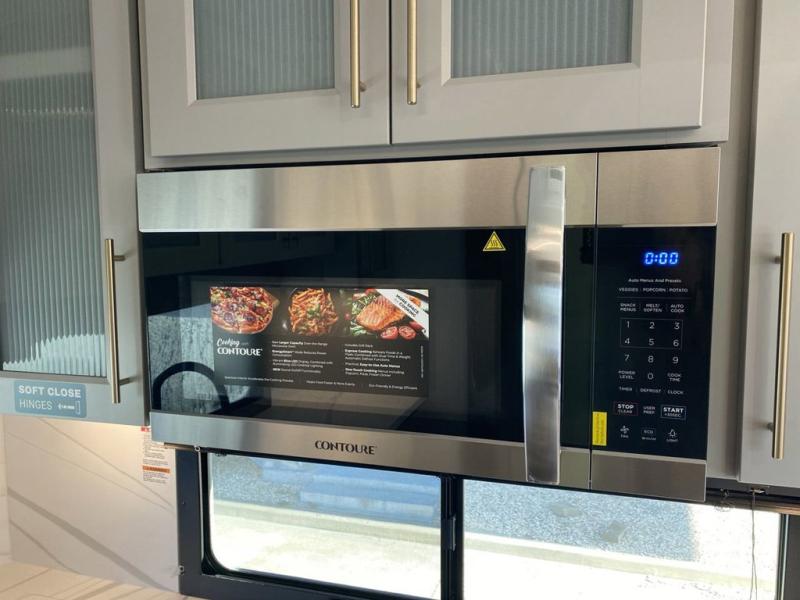 Escape the ordinary and experience the ultimate in luxury travel with this stunning fifth wheel! The rear kitchen is the heart of this fifth wheel, featuring a spacious pantry, 12V refrigerator, microwave, and overhead cabinets. Prepare delicious meals with ease and enjoy the convenience of a fully-equipped kitchen. Unwind in the spacious living area, featuring a plush trifold sofa, L-shape sofa, and a dual recliner love seat. Gather around the turntable dinette or relax in front of the stunning 65” TV. The full bathroom provides a serene space for personal care, while the front bedroom is a peaceful retreat with a comfortable queen bed and a flip-top dresser. Enjoy your favorite shows on the smart TV, perfect for relaxing after a day of adventure.