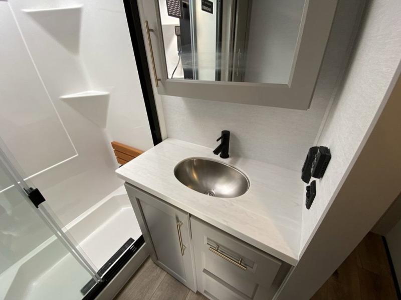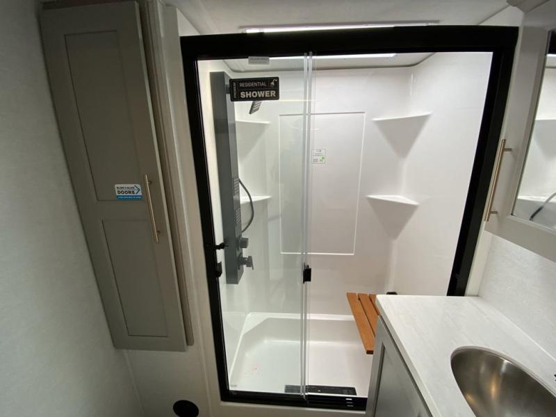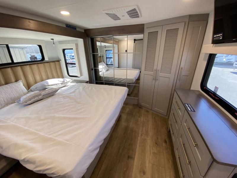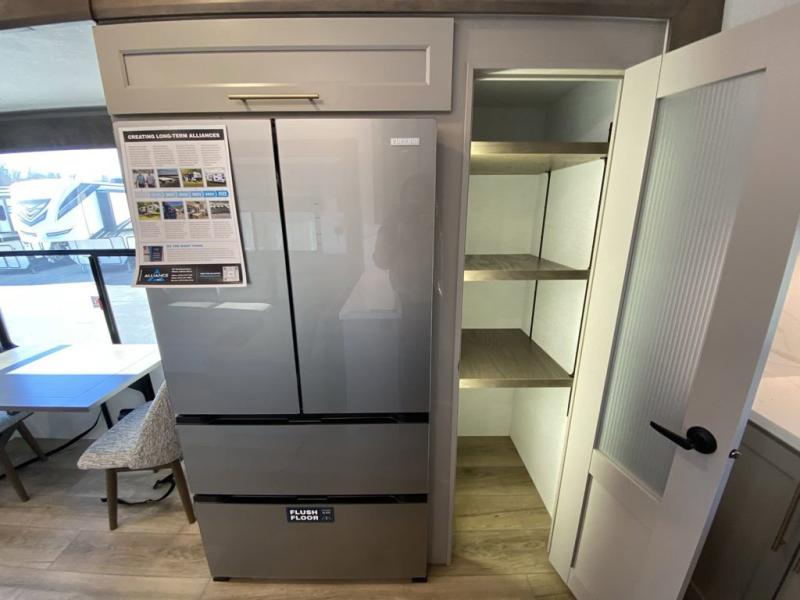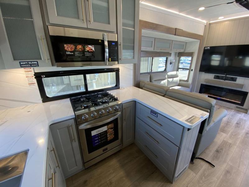 The Paradigm fifth wheels by Alliance RV are functional, high-quality, and luxurious for an unforgettable camping experience. There are three A/C units and a 40K BTU furnace to keep you comfortable year around, and you'll appreciate additional convenient amenities, like the all-in-one enclosed/heated utility center and the color coded and numbered wiring. A Helux Series coil spring pin box comes standard for hassle-free towing, along with Curt 8,000 lb. axles. You'll love the kitchen with its LG solid surface countertops and Lusso range, plus there is LED motion lighting in the pantry and a Maxx fan with a rain sensor to keep everything fresh when making dinner. Each model also includes an HD Smart TV in the living room and bedroom. And of course there are a variety of options you can choose from to further customize your fifth wheel; dual pane windows, Super Solar Plus, slide out awning toppers, and generator prep or a generator to name a few!