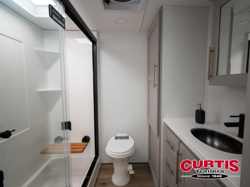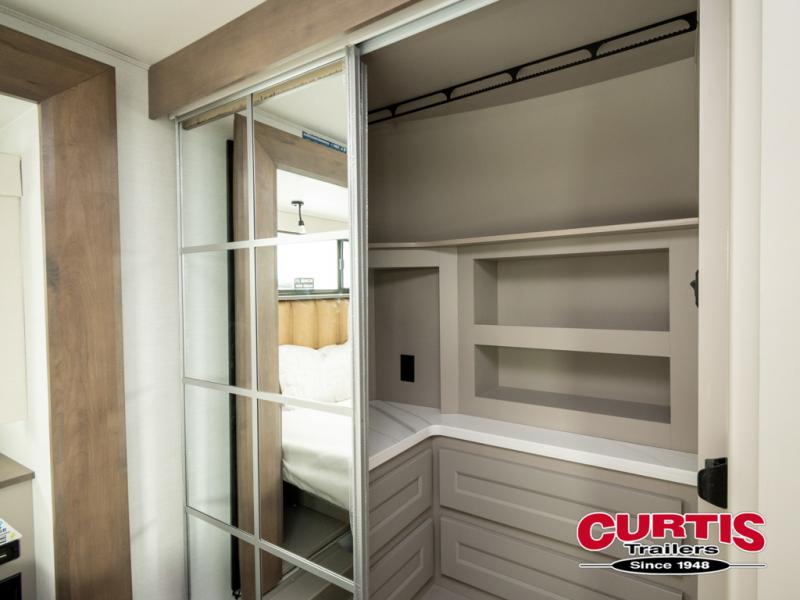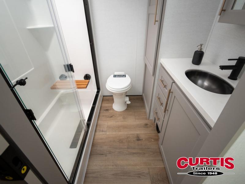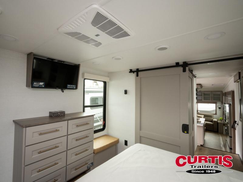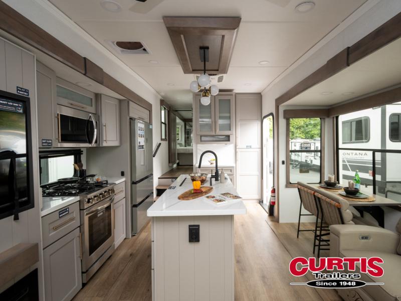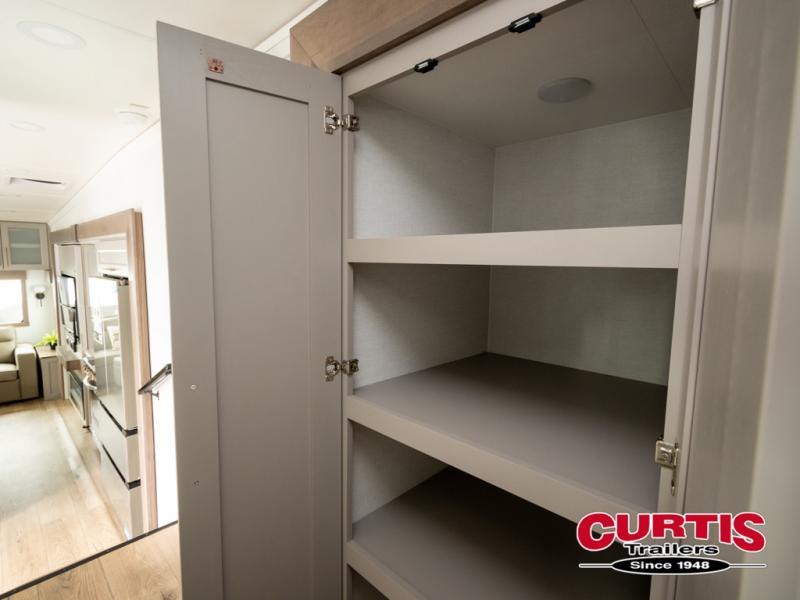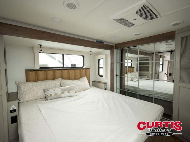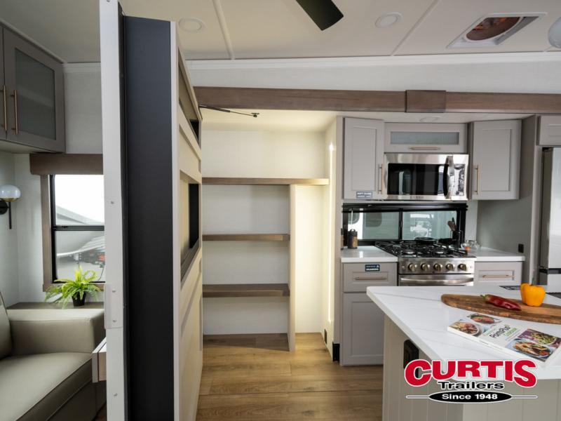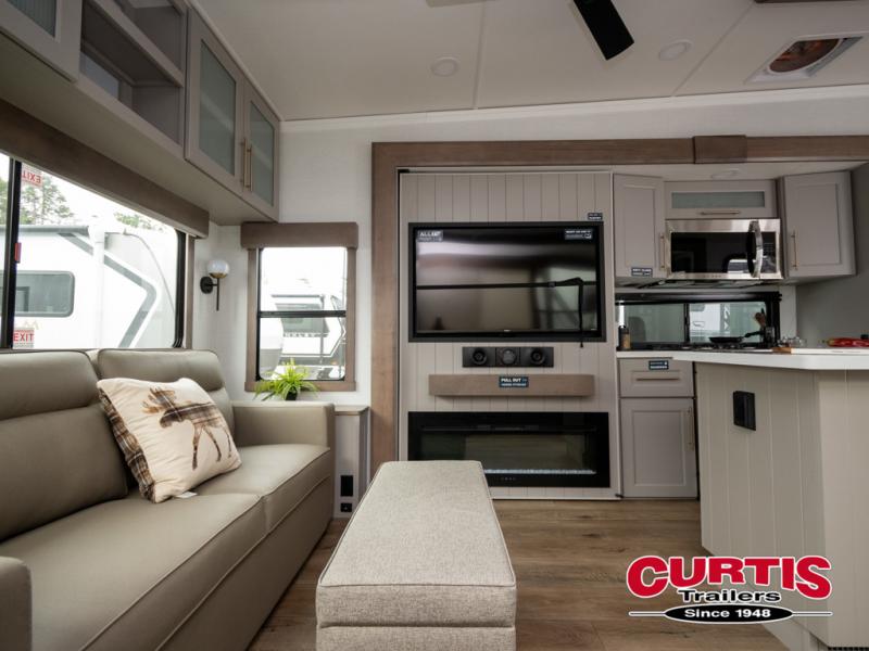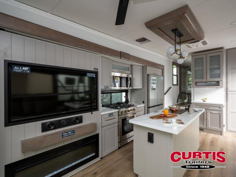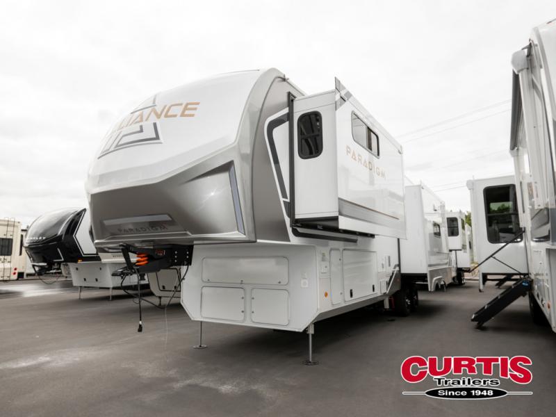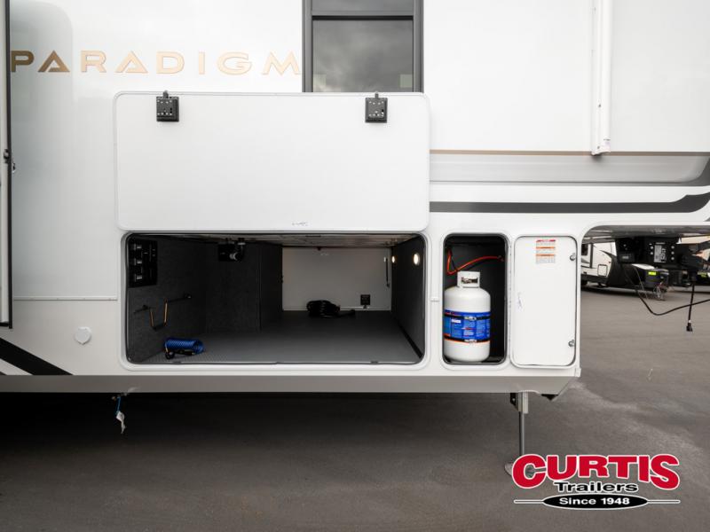 The Paradigm fifth wheels by Alliance RV are functional, high-quality, and luxurious for an unforgettable camping experience. There are three A/C units and a 40K BTU furnace to keep you comfortable year around, and you'll appreciate additional convenient amenities, like the all-in-one enclosed/heated utility center and the color coded and numbered wiring. A Helux Series coil spring pin box comes standard for hassle-free towing, along with Super-G 4,400 lb. rated tires and Dexter 7,000 lb. axles. You'll love the kitchen with its LG solid surface countertops and Lusso range, plus there is LED motion lighting in the pantry and a Maxx fan with a rain sensor to keep everything fresh when making dinner. Each model also includes an HD Smart TV in the living room and bedroom, plus a Winegard Air 360 antenna to keep you connected to the outside world. And of course there are a variety of options you can choose from to further customize your fifth wheel; dual pane windows, Super Solar Plus, slide out awning toppers, and generator prep or a generator to name a few!