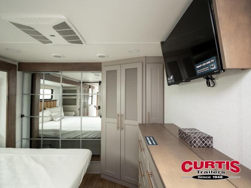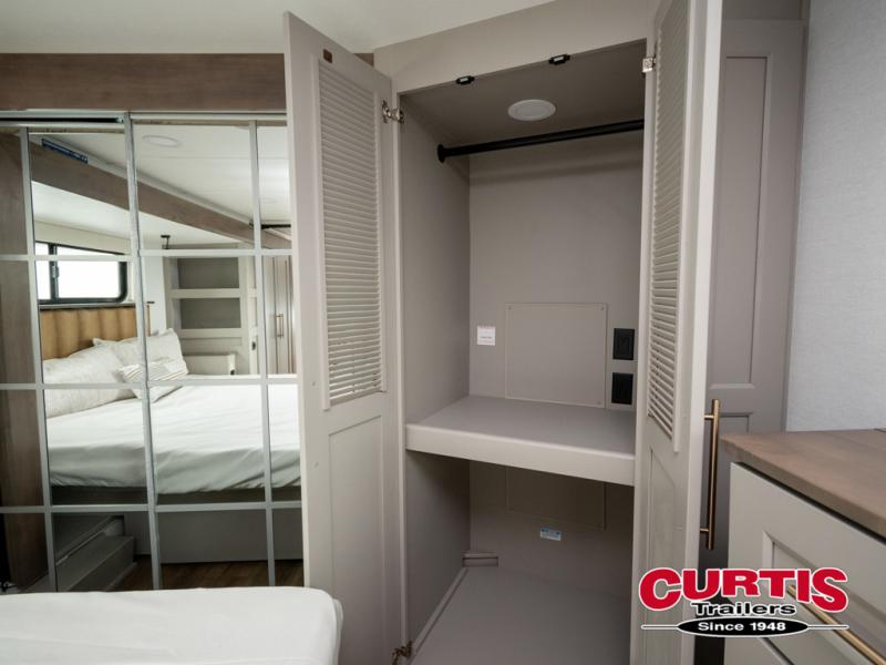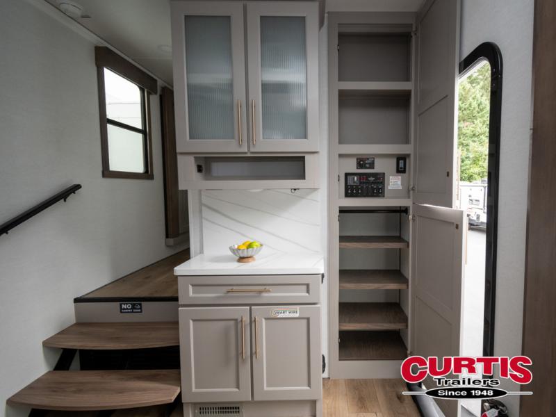 Travel to see family and friends while living in this RV or while on vacation! You will love the spacious rear living area thanks to the dual opposing slides which include the kitchen amenities and the 50" Smart TV with a fireplace. There is also a hidden pantry storage behind the TV for smart storage spaces! You can get comfortable on the dual recliner love seat or dine at the swivel table and desk. The kitchen island includes a sink and counter space to utilize many ways, plus there is dishwasher prep if you want to add that option. The full bathroom is up the steps towards the front bedroom and includes a spacious 61" x 30" shower. You even have more floor space in the hallway thanks to the third slide out which includes shelf storage, plus more shelves and a king bed in the bedroom.