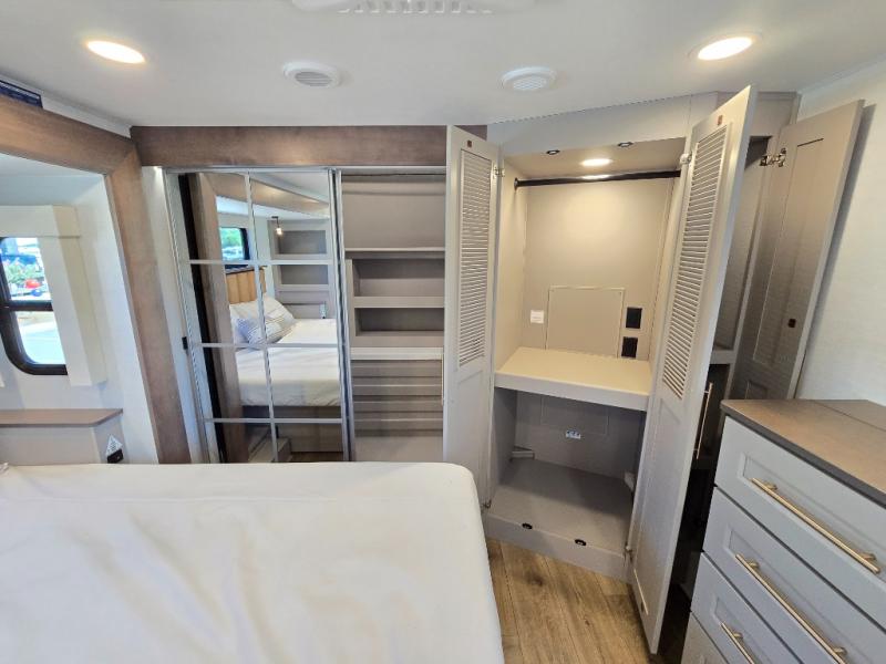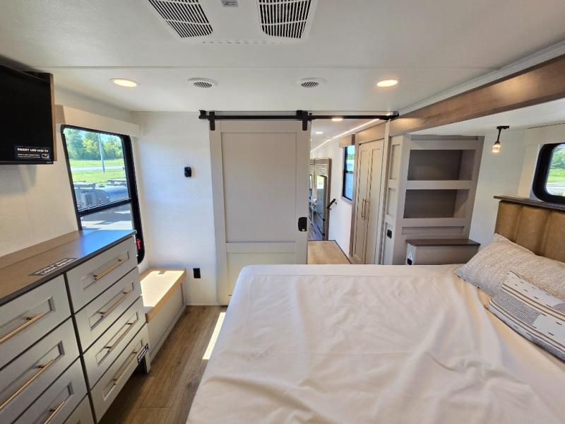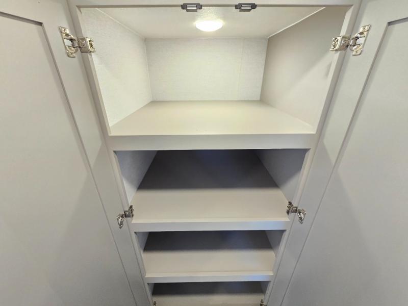 Travel to see family and friends while living in this RV or while on vacation! You will love the spacious rear living area thanks to the dual opposing slides which include the kitchen amenities and the 50" Smart TV with a fireplace. There is also a hidden pantry storage behind the TV for smart storage spaces! You can get comfortable on the dual recliner love seat or dine at the swivel table and desk. The kitchen island includes a sink and counter space to utilize many ways, plus there is dishwasher prep if you want to add that option. The full bathroom is up the steps towards the front bedroom and includes a spacious 61" x 30" shower. You even have more floor space in the hallway thanks to the third slide out which includes shelf storage, plus more shelves and a king bed in the bedroom.