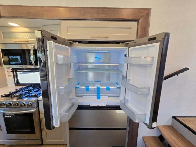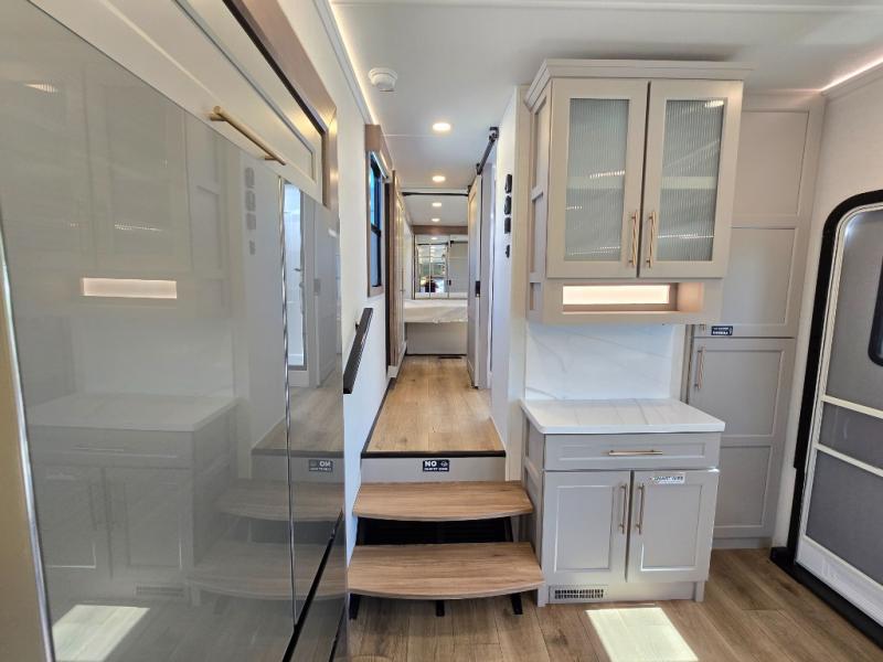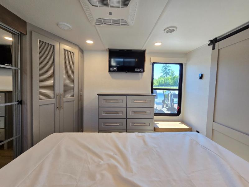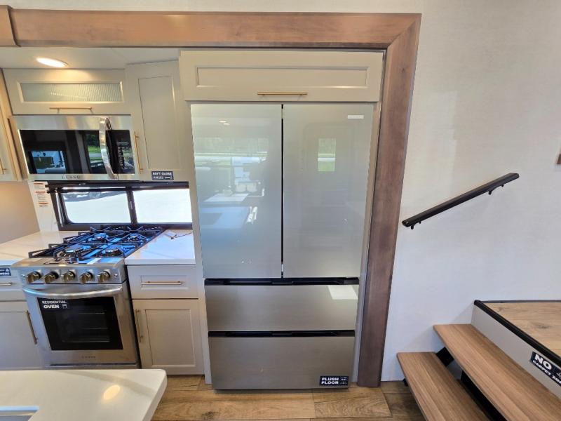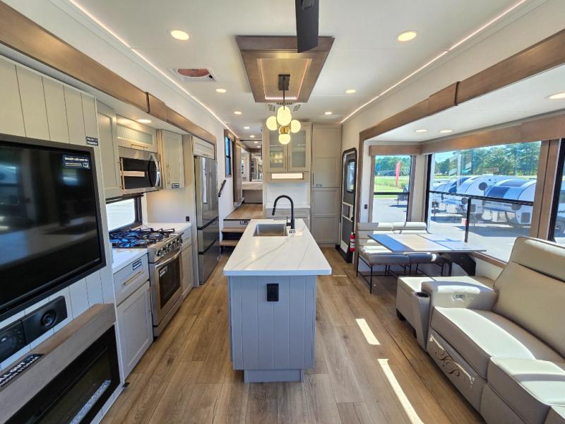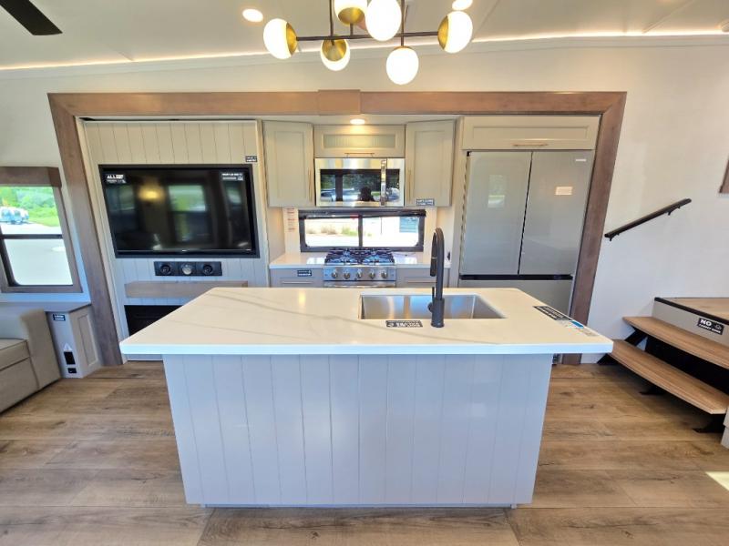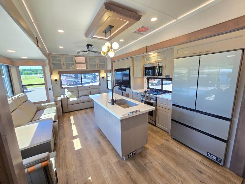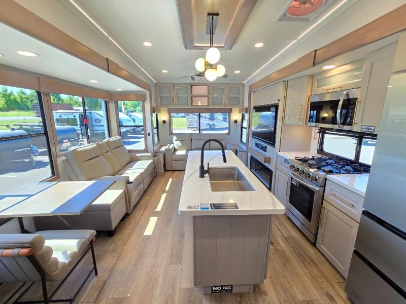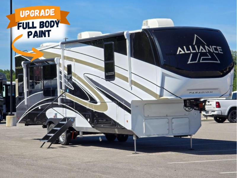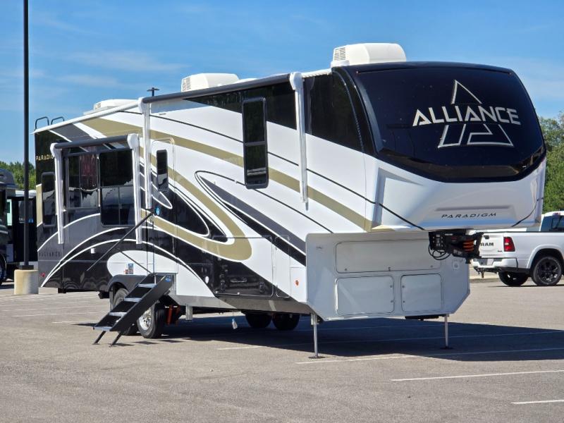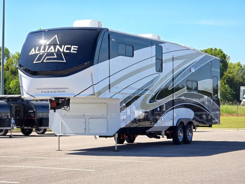 The Paradigm fifth wheels by Alliance RV are functional, high-quality, and luxurious for an unforgettable camping experience. There are three A/C units and a 40K BTU furnace to keep you comfortable year around, and you'll appreciate additional convenient amenities, like the all-in-one enclosed/heated utility center and the color coded and numbered wiring. A Helux Series coil spring pin box comes standard for hassle-free towing, along with Super-G 4,400 lb. rated tires and Dexter 7,000 lb. axles. You'll love the kitchen with its LG solid surface countertops and Lusso range, plus there is LED motion lighting in the pantry and a Maxx fan with a rain sensor to keep everything fresh when making dinner. Each model also includes an HD Smart TV in the living room and bedroom, plus a Winegard Air 360 antenna to keep you connected to the outside world. And of course there are a variety of options you can choose from to further customize your fifth wheel; dual pane windows, Super Solar Plus, slide out awning toppers, and generator prep or a generator to name a few!