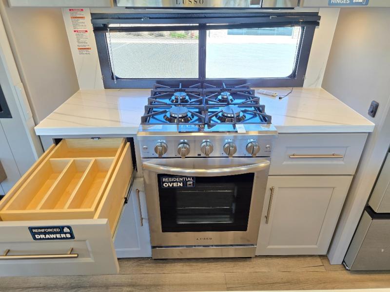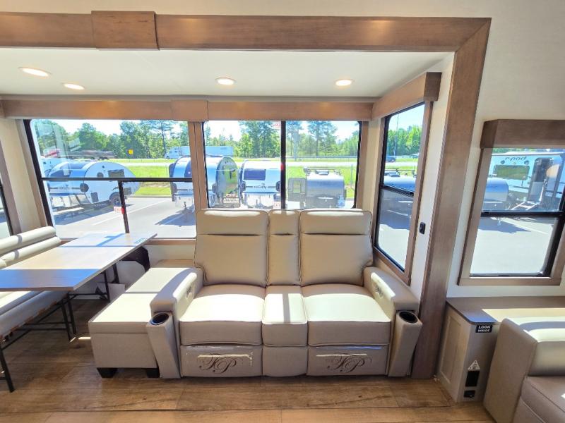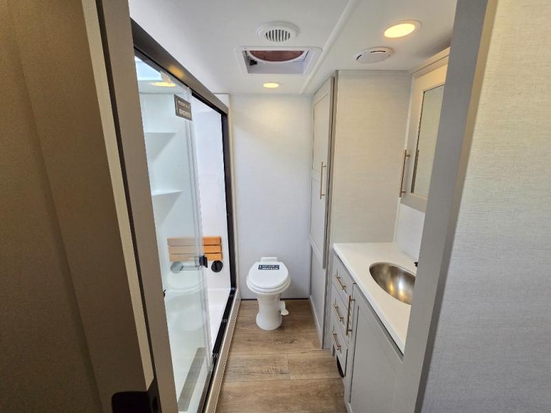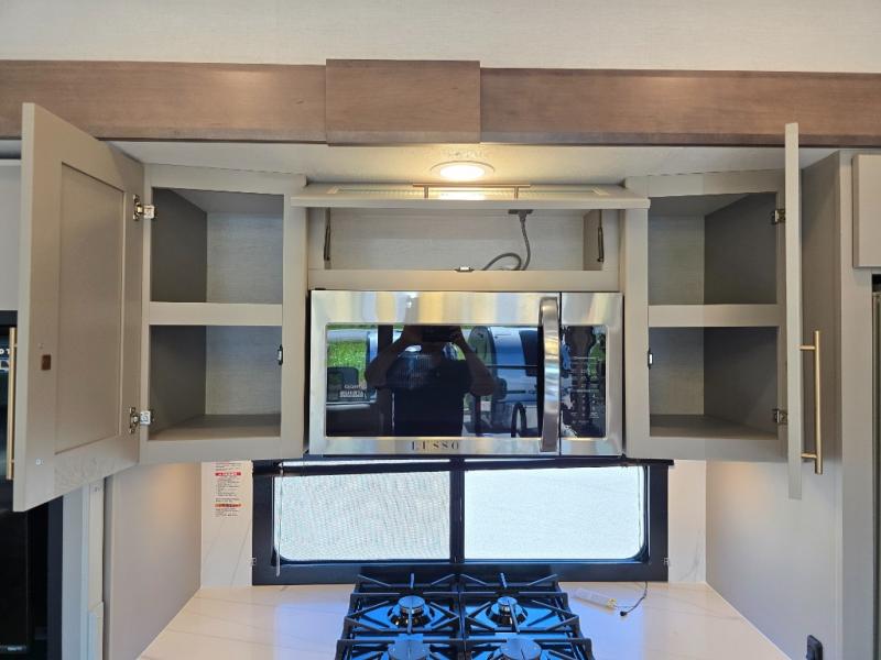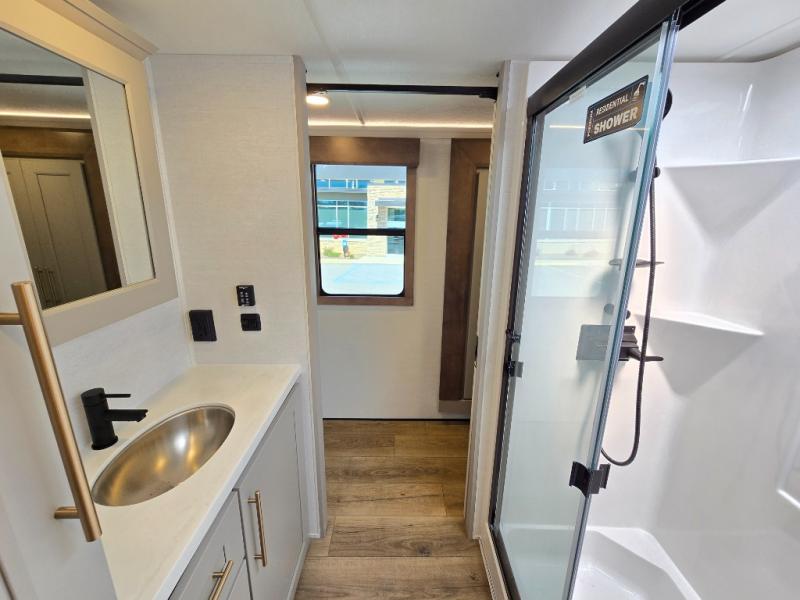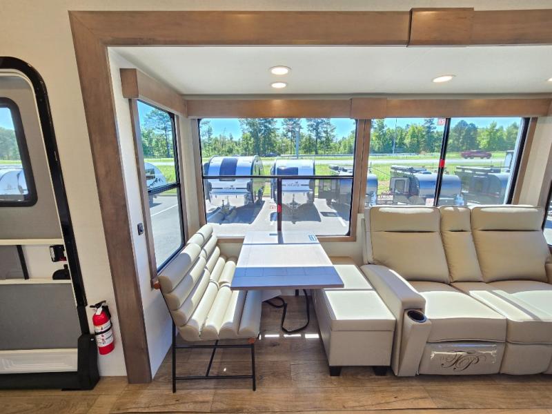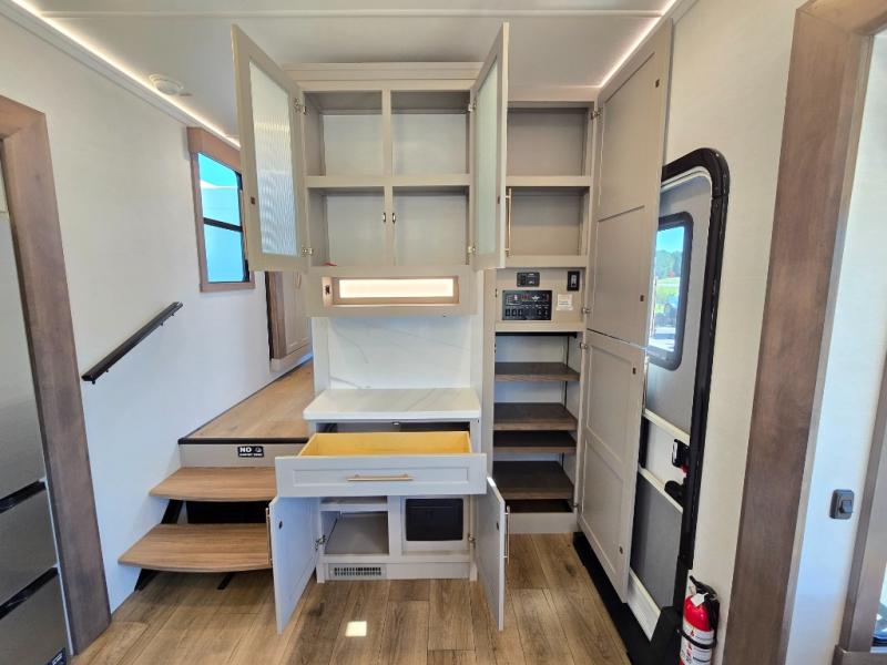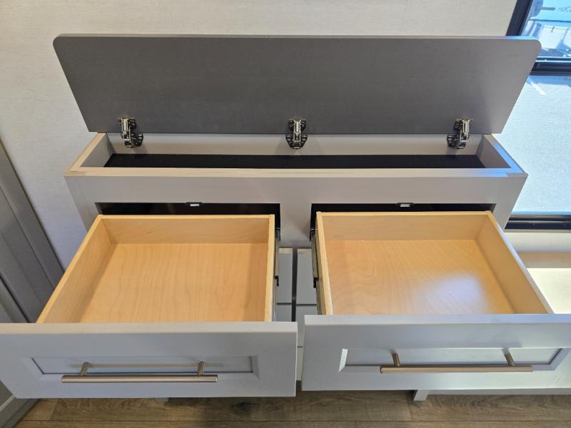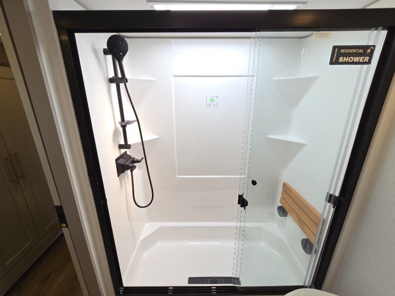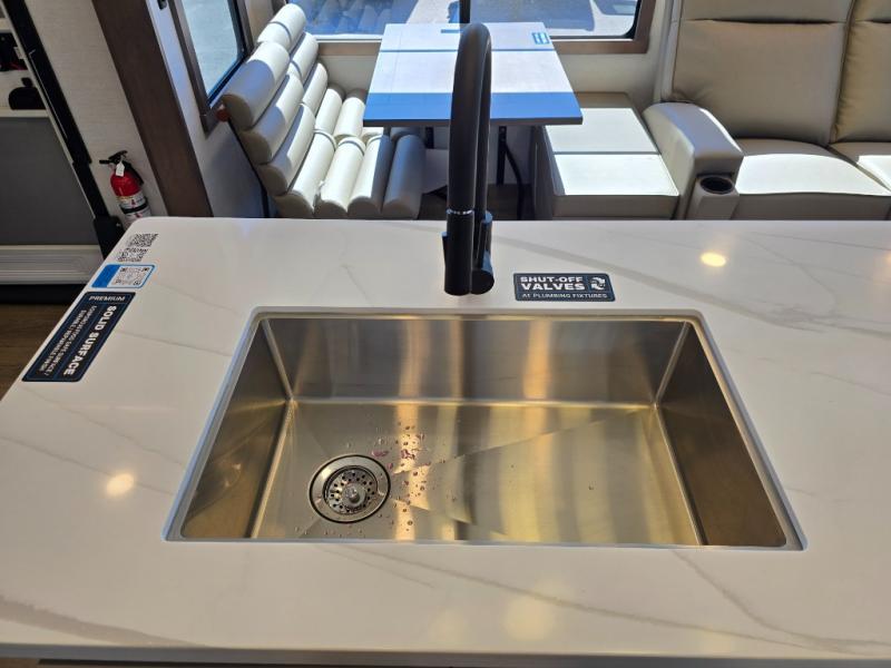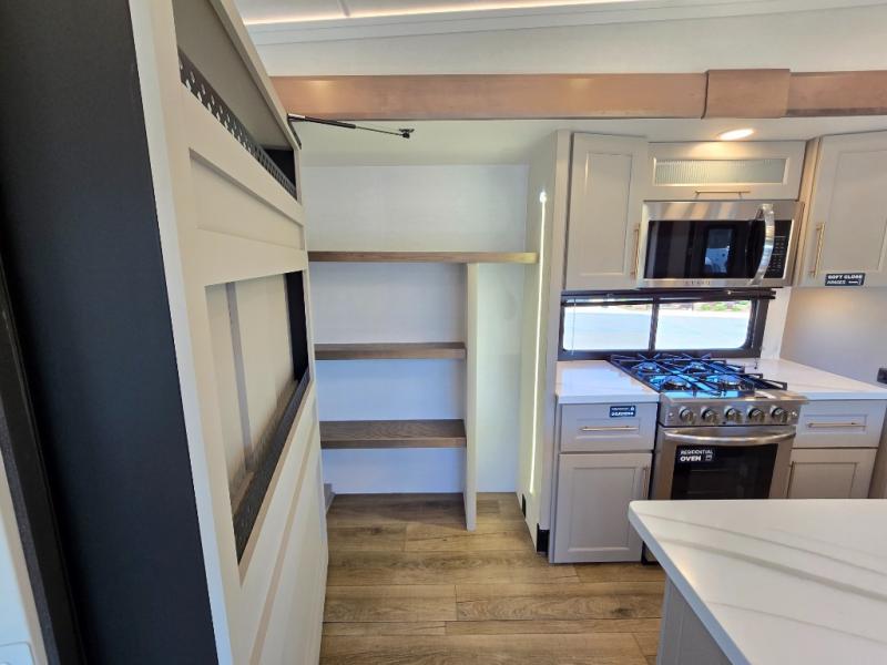The Paradigm fifth wheels by Alliance RV are functional, high-quality, and luxurious for an unforgettable camping experience. There are three A/C units and a 40K BTU furnace to keep you comfortable year around, and you'll appreciate additional convenient amenities, like the all-in-one enclosed/heated utility center and the color coded and numbered wiring. A Helux Series coil spring pin box comes standard for hassle-free towing, along with Super-G 4,400 lb. rated tires and Dexter 7,000 lb. axles. You'll love the kitchen with its LG solid surface countertops and Lusso range, plus there is LED motion lighting in the pantry and a Maxx fan with a rain sensor to keep everything fresh when making dinner. Each model also includes an HD Smart TV in the living room and bedroom, plus a Winegard Air 360 antenna to keep you connected to the outside world. And of course there are a variety of options you can choose from to further customize your fifth wheel; dual pane windows, Super Solar Plus, slide out awning toppers, and generator prep or a generator to name a few!