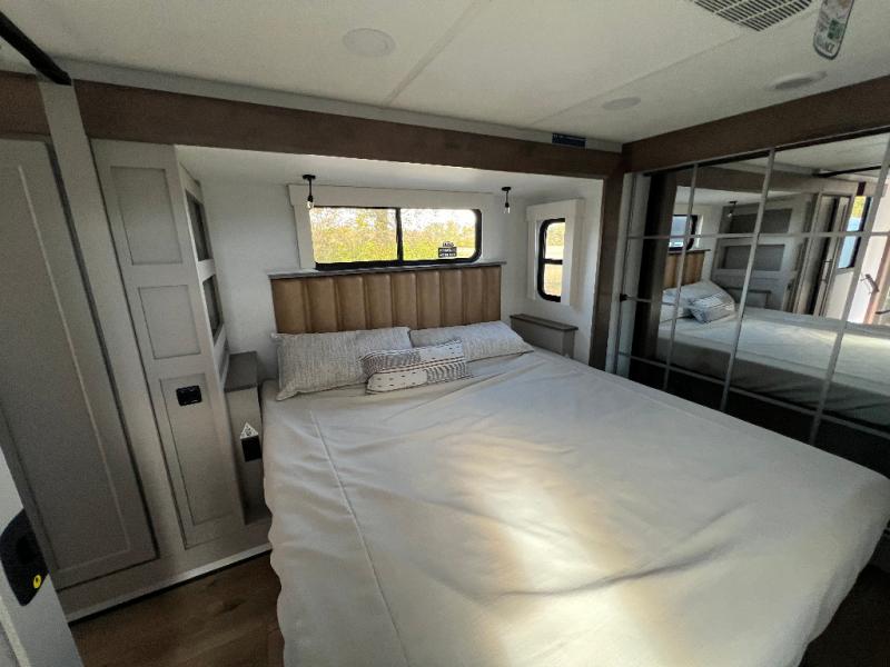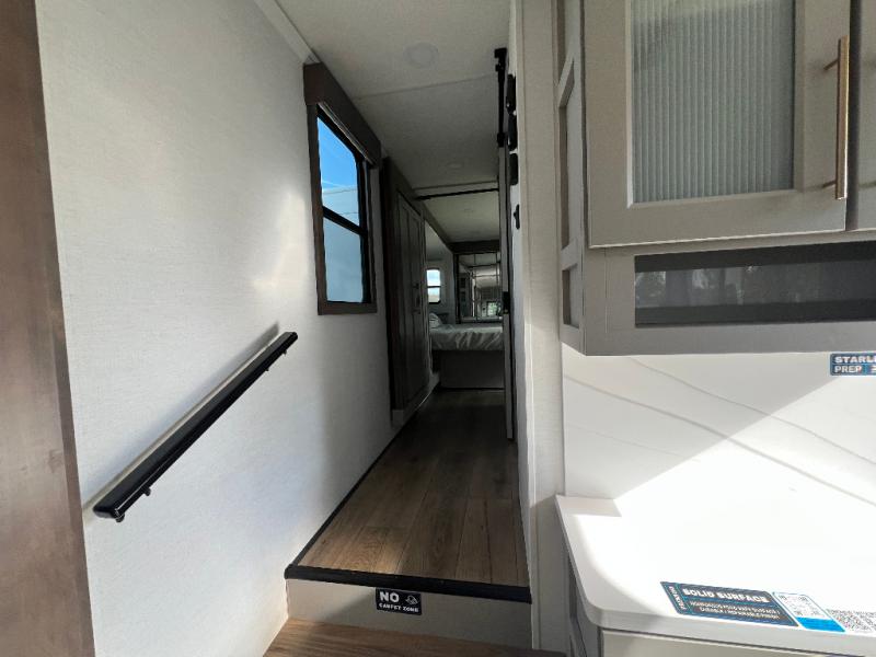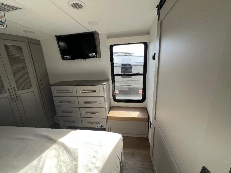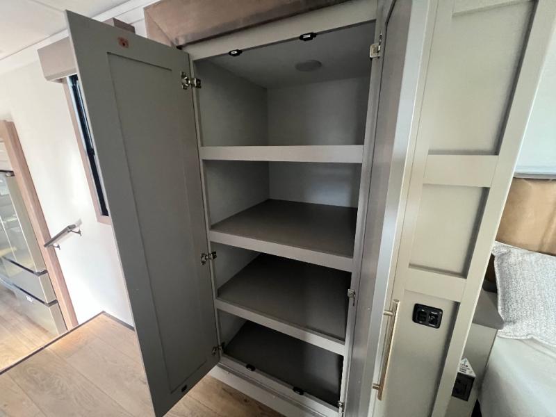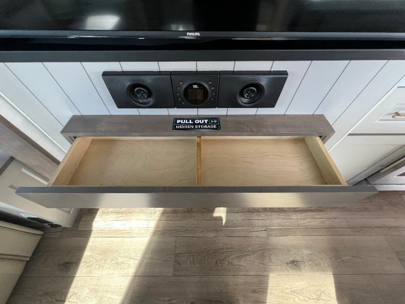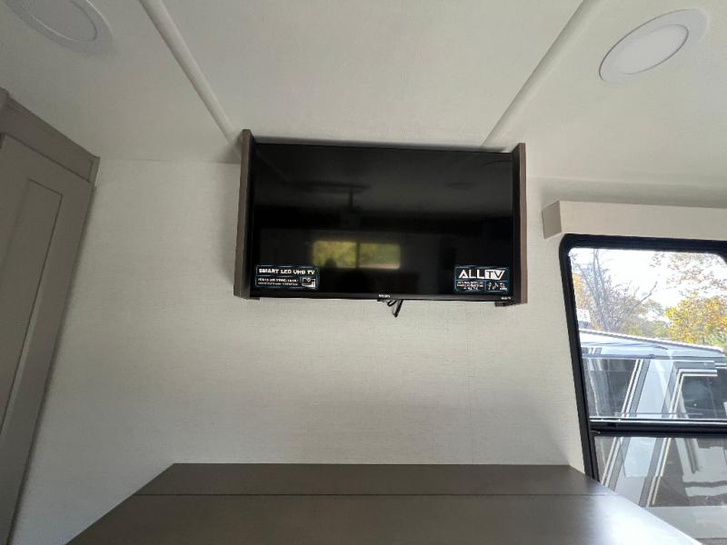 Travel to see family and friends while living in this RV or while on vacation! You will love the spacious rear living area thanks to the dual opposing slides which include the kitchen amenities and the 50" Smart TV with a fireplace. There is also a hidden pantry storage behind the TV for smart storage spaces! You can get comfortable on the dual recliner love seat or dine at the swivel table and desk. The kitchen island includes a sink and counter space to utilize many ways, plus there is dishwasher prep if you want to add that option. The full bathroom is up the steps towards the front bedroom and includes a spacious 61" x 30" shower. You even have more floor space in the hallway thanks to the third slide out which includes shelf storage, plus more shelves and a king bed in the bedroom.