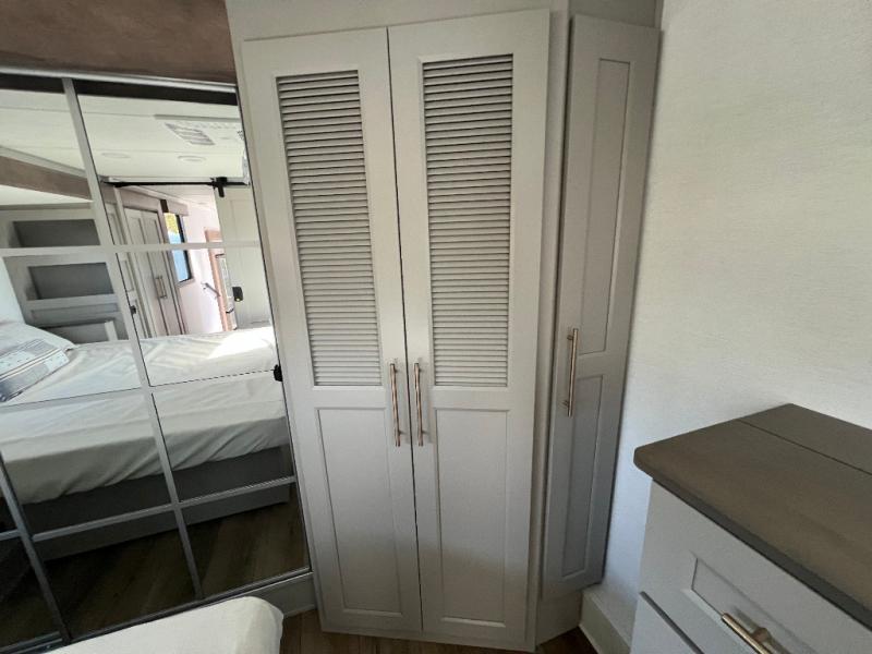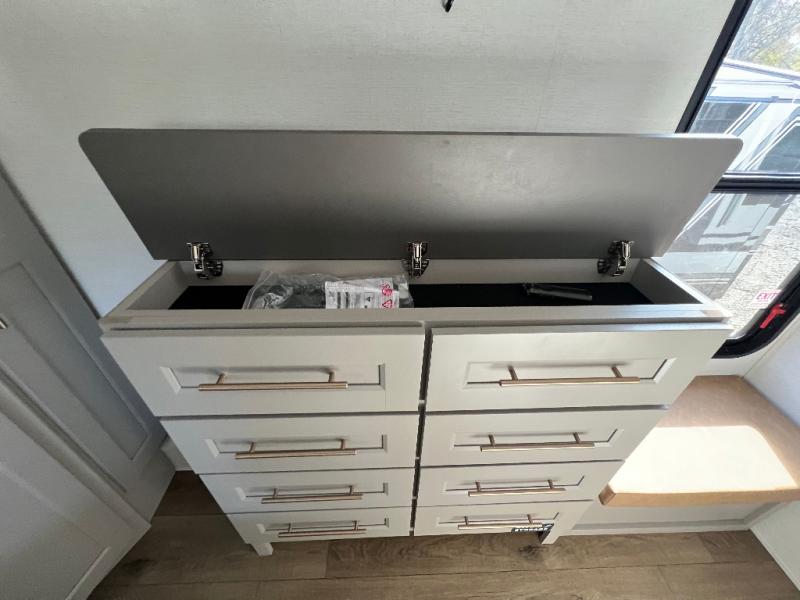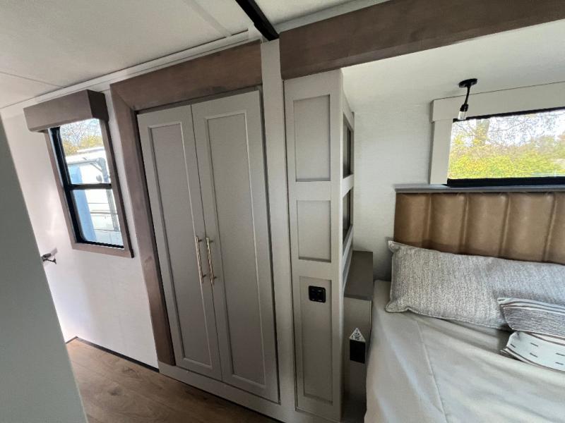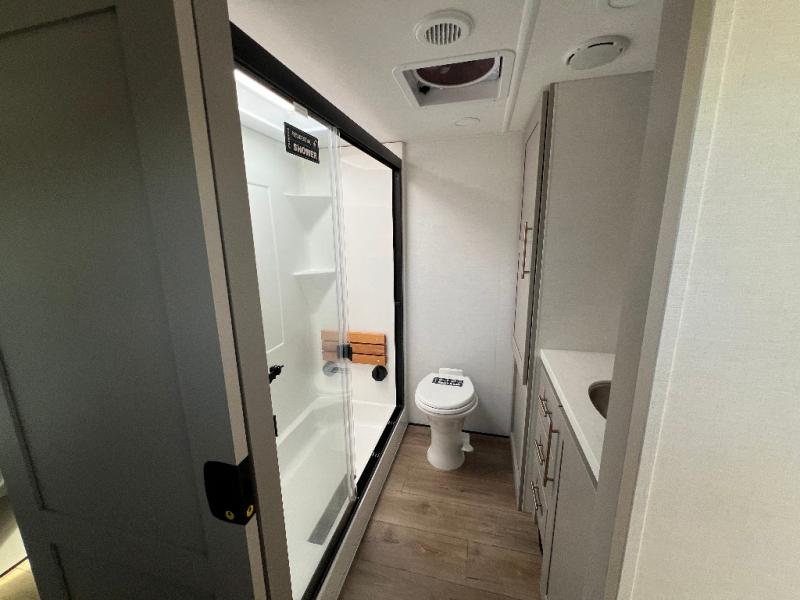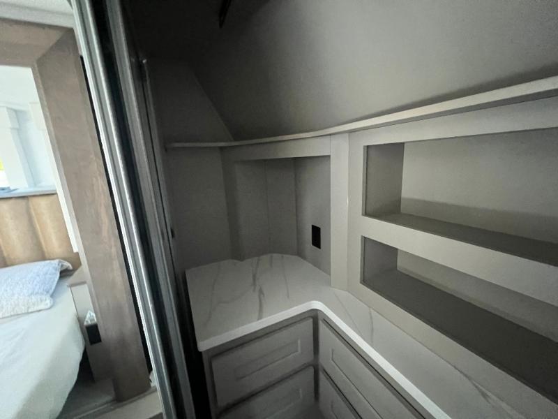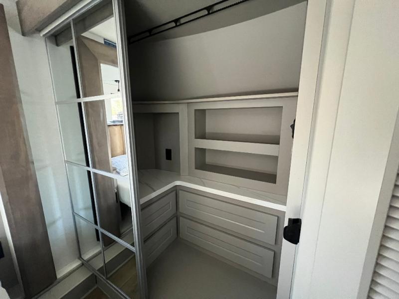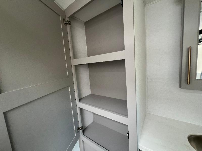 Travel to see family and friends while living in this RV or while on vacation! You will love the spacious rear living area thanks to the dual opposing slides which include the kitchen amenities and the 50" Smart TV with a fireplace. There is also a hidden pantry storage behind the TV for smart storage spaces! You can get comfortable on the dual recliner love seat or dine at the swivel table and desk. The kitchen island includes a sink and counter space to utilize many ways, plus there is dishwasher prep if you want to add that option. The full bathroom is up the steps towards the front bedroom and includes a spacious 61" x 30" shower. You even have more floor space in the hallway thanks to the third slide out which includes shelf storage, plus more shelves and a king bed in the bedroom.
