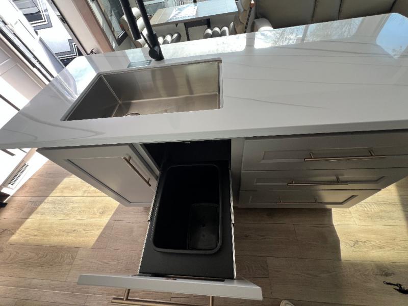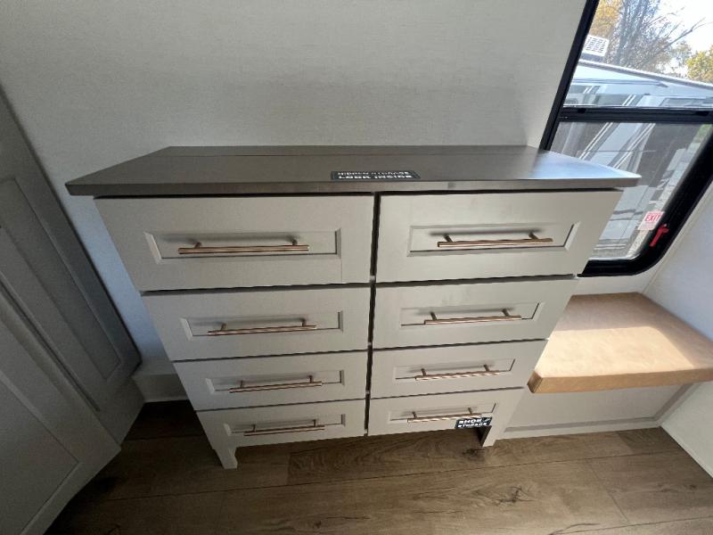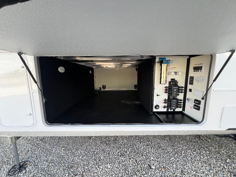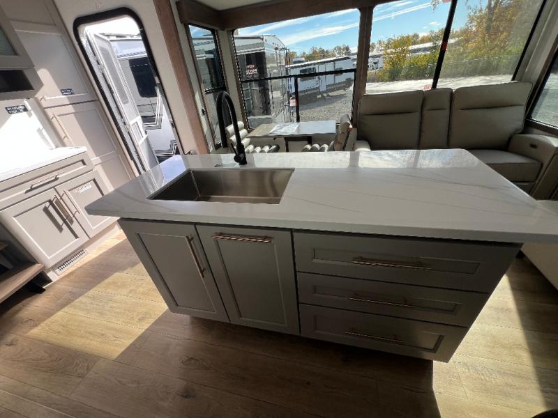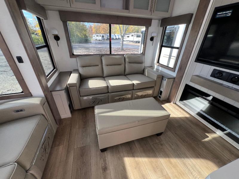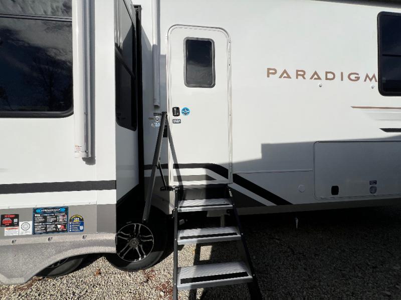 The Paradigm fifth wheels by Alliance RV are functional, high-quality, and luxurious for an unforgettable camping experience. There are three A/C units and a 40K BTU furnace to keep you comfortable year around, and you'll appreciate additional convenient amenities, like the all-in-one enclosed/heated utility center and the color coded and numbered wiring. A Helux Series coil spring pin box comes standard for hassle-free towing, along with Curt 8,000 lb. axles. You'll love the kitchen with its LG solid surface countertops and Lusso range, plus there is LED motion lighting in the pantry and a Maxx fan with a rain sensor to keep everything fresh when making dinner. Each model also includes an HD Smart TV in the living room and bedroom. And of course there are a variety of options you can choose from to further customize your fifth wheel; dual pane windows, Super Solar Plus, slide out awning toppers, and generator prep or a generator to name a few!